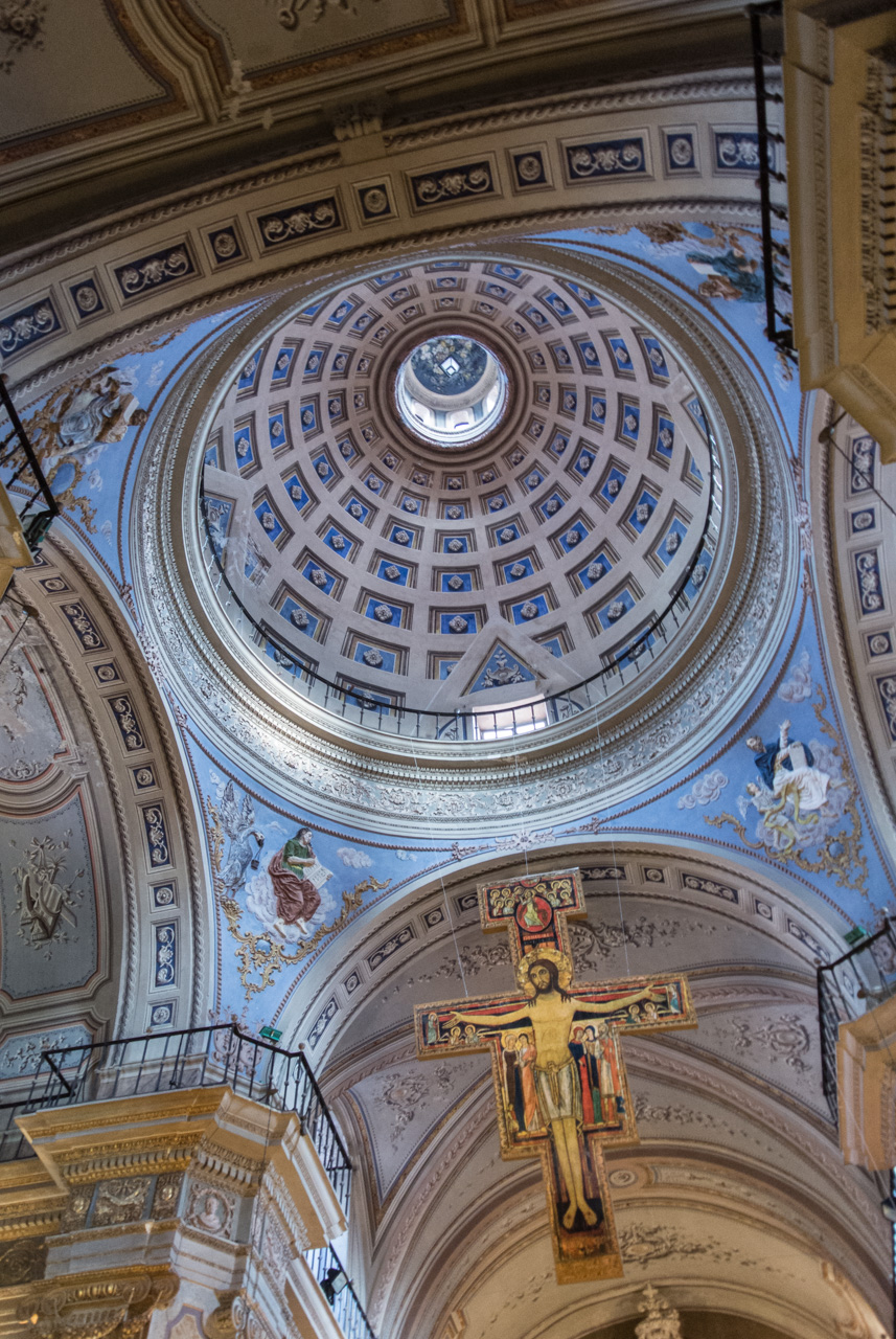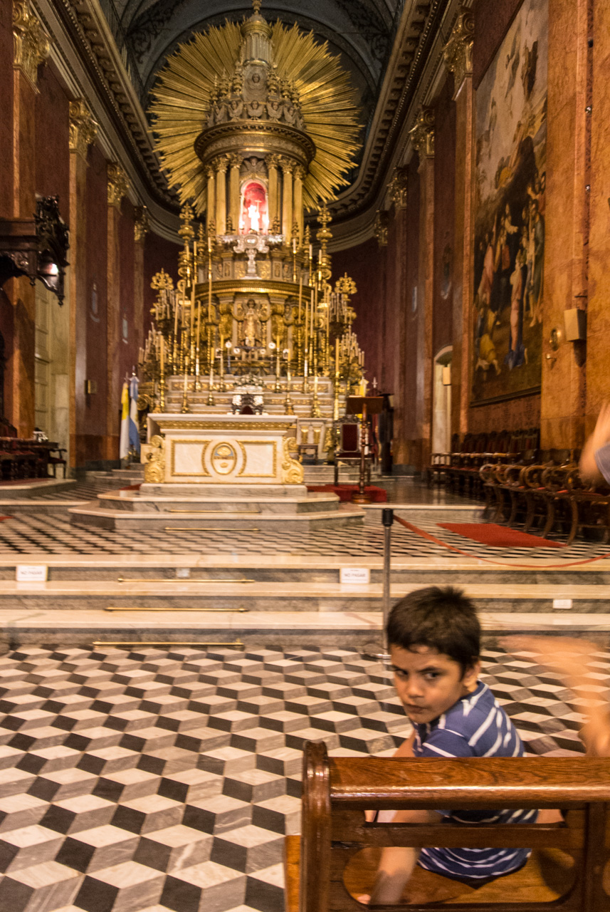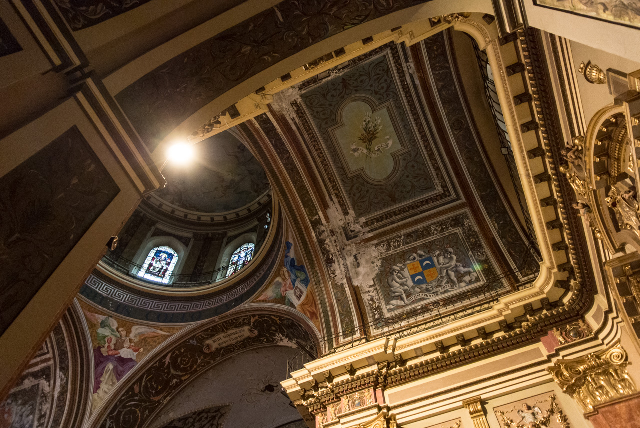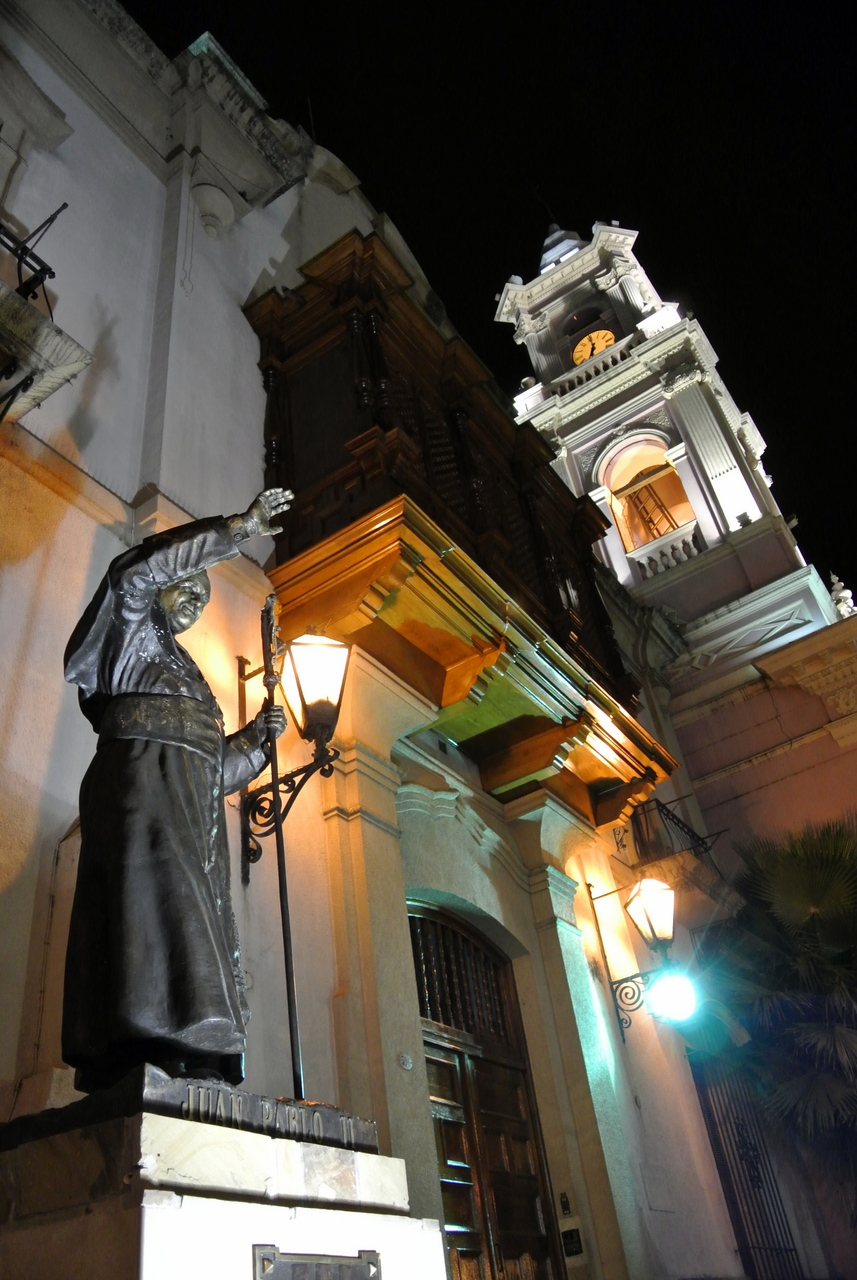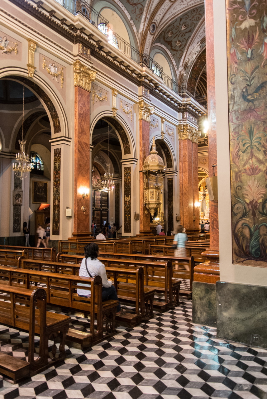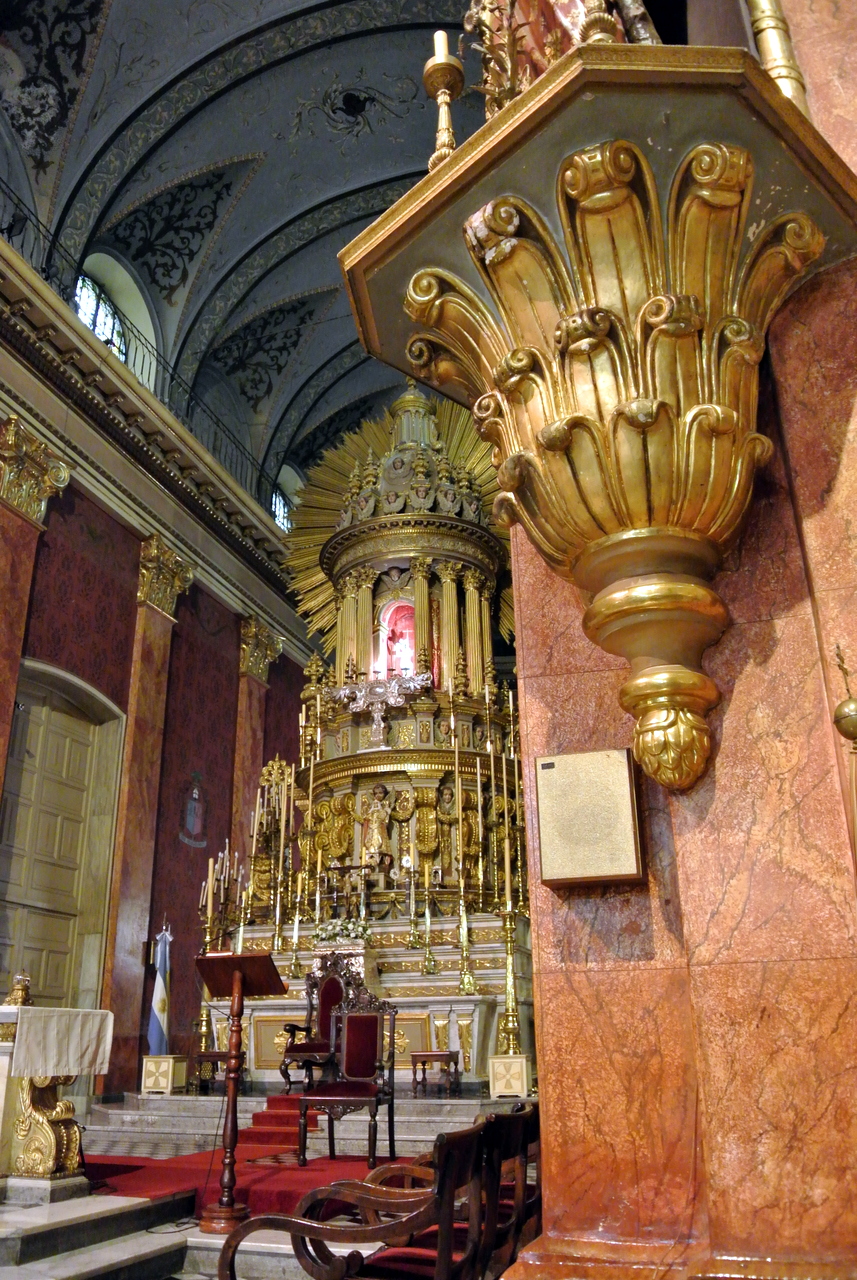 Un peu plus loin, on trouve l’une des églises à ne pas manquer de Salta : La Basilique San Francisco. On ne peut pas la louper : elle est toute de rouge vêtue… et au moment de ma visite, en cours de rénovation. Quel contraste avec le couvent voisin, tout blanc et sans chi-chi. Ici, c’est le baroque triomphant qui s’exprime : depuis une façade chargée jusqu’au choeur théâtral, tout est fait pour en mettre plein les yeux… et !a marche : la basilique est inscrite au patrimoine mondial de l’UNECSO.