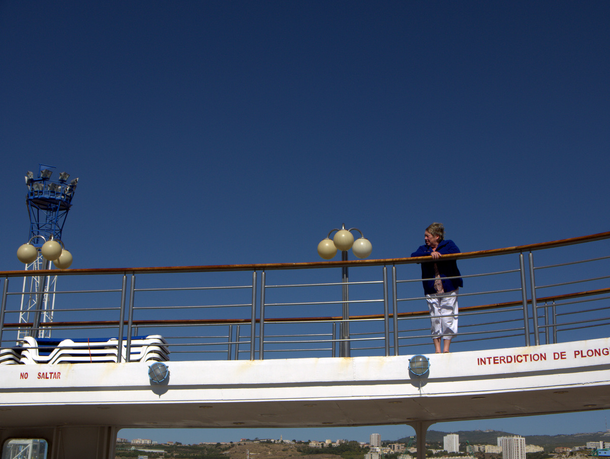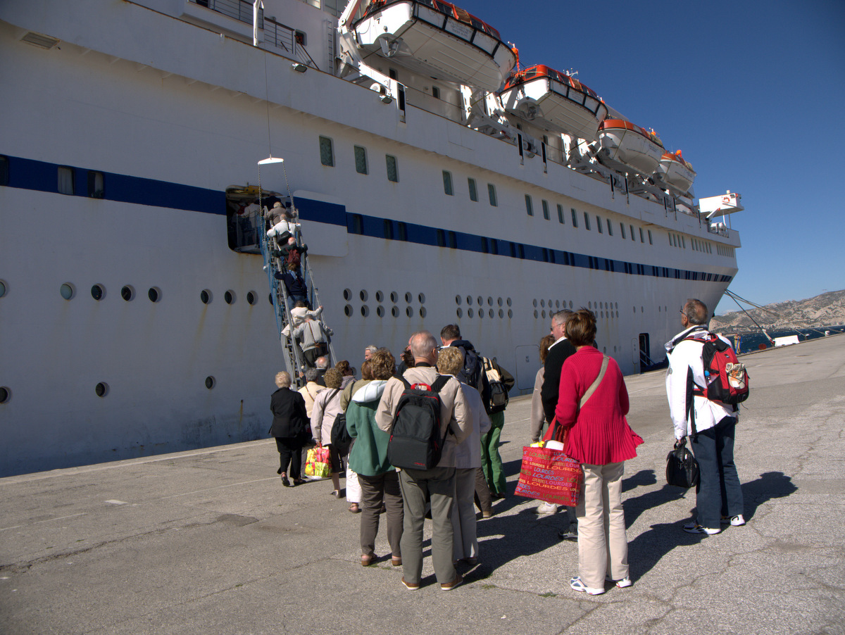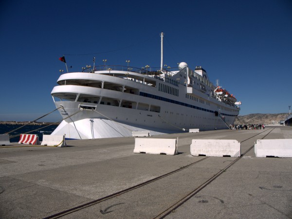 Mercredi soir, me voilà donc Gare Centrale pour embarquer dans un bus à destination de Marseille. J’aurai bien voulu démonter le cliché du croisiériste retraité mais ici, ce n’est pas le cas! Normal: un « petit » paquebot (un peu plus de 500 passagers), une navigation hors de la période des vacances sont en général synonymes de seniors en goguette. Dans le bus, la moyenne d’âge doit être de 65 ans! N’ayant pas spécialement de problèmes à me « coltiner des vieux » (triple guillemets), souvent bien plus drôles et libérés qu’on l’imagine, surtout quand ils sont en vacances. On monte dans le bus, et en route vers le soleil. J’en profite pour faire plus ample connaissance avec Tilde, l’accompagnatrice. Tilde est juriste et quand elle prend des vacances, on la retrouve comme accompagnatrice sur un bateau de croisière. Une façon de voir le monde à moindre frais et d’une manière originale. Et ni une, ni deux, elle me transforme également en gentille organisatrice! Annonce en français, comptage des passagers lors des pauses, distribution de boissons… Un vrai petit job d’hôtesse! Je laisse faire, ça fait passer le temps! Pour un voyage de 13 heures, c’est appréciable!