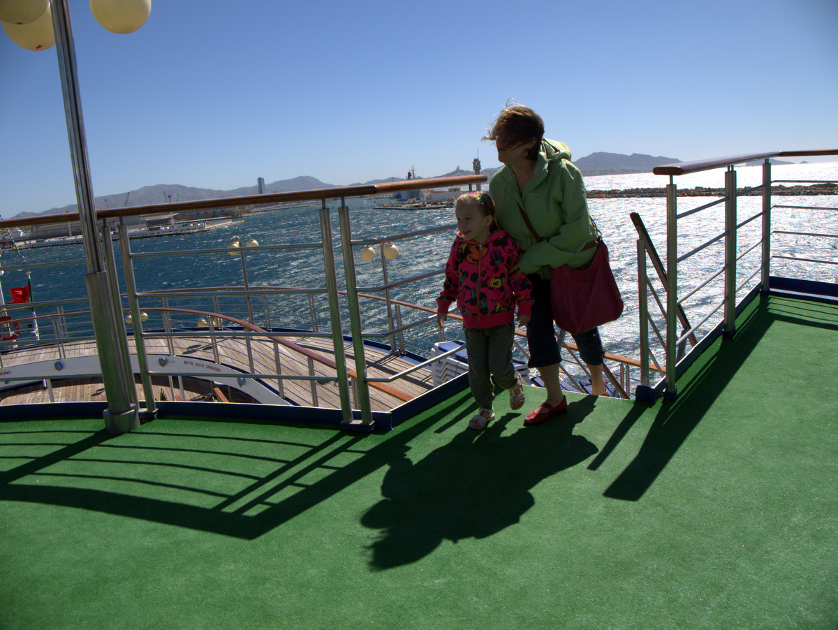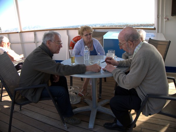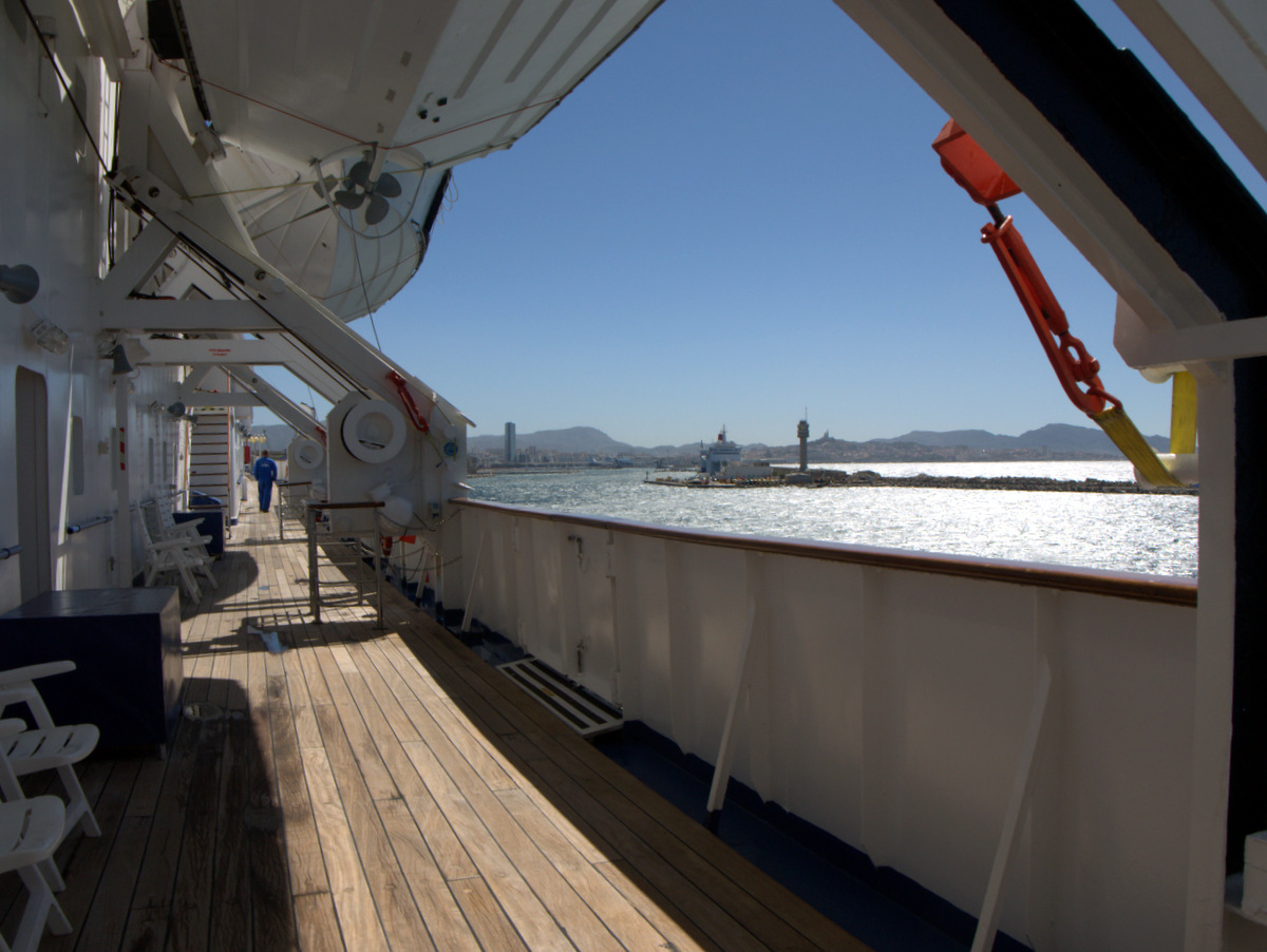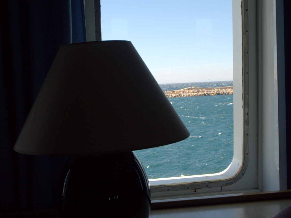 Après le drill de sécurité, je retourne dans mon aquarium et commence à écrire. Je rejoins le pont pour la Sailaway Party. Un vent à décorner les bœufs souffle sur le port! Le ciel est d’un bleu profond, presque indigo et la Méditerranée, bleue foncée, semble en colère. Nous voyons les ferries en partance pour la Corse ou le Maghreb quitter le port mais l’Athena reste à quai. Je commence à m’inquiéter. A 19 heures, une réunion est conviée: nous ne partirons pas aujourd’hui! Les services météo ont signalé des vents de Force 9 dans le Golfe du Lion et le commandant a décidé de ne pas prendre la mer. Le bateau restera donc au port jusqu’à au moins 8 heures du matin le lendemain.