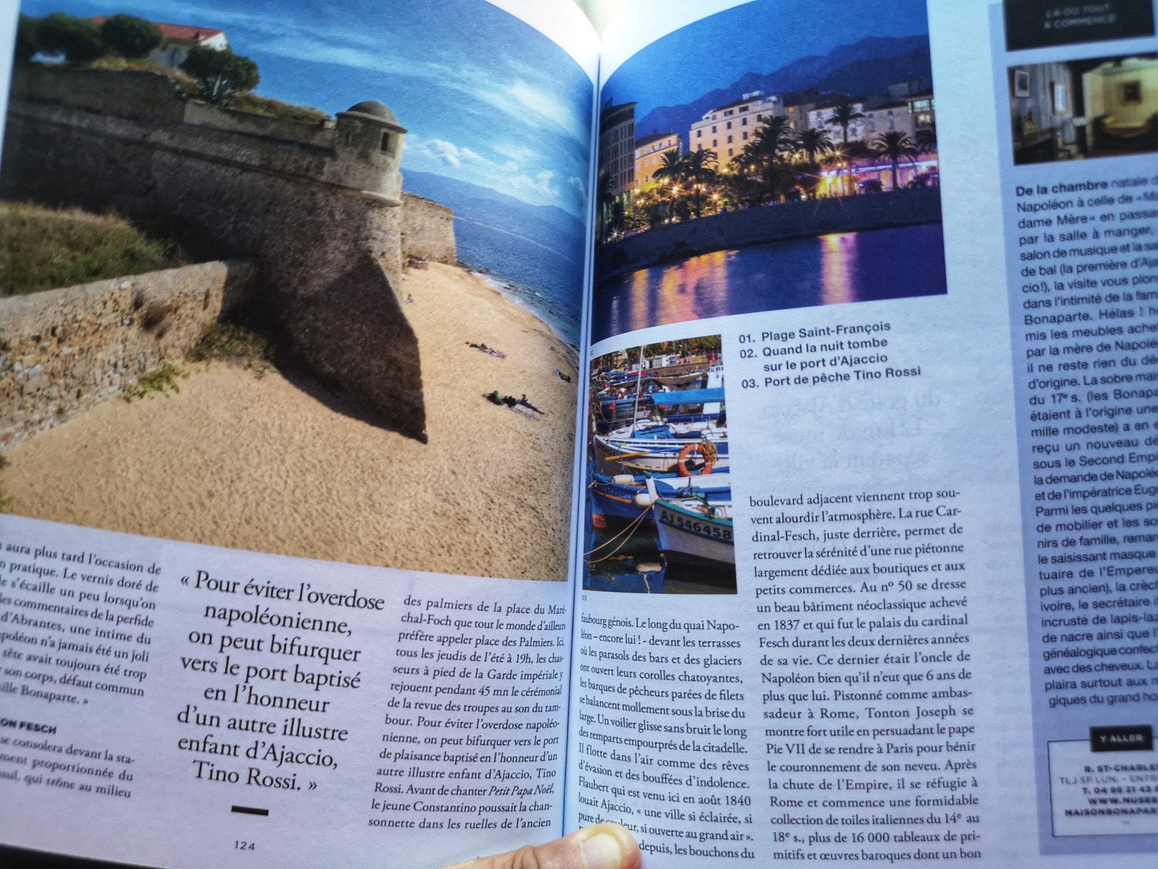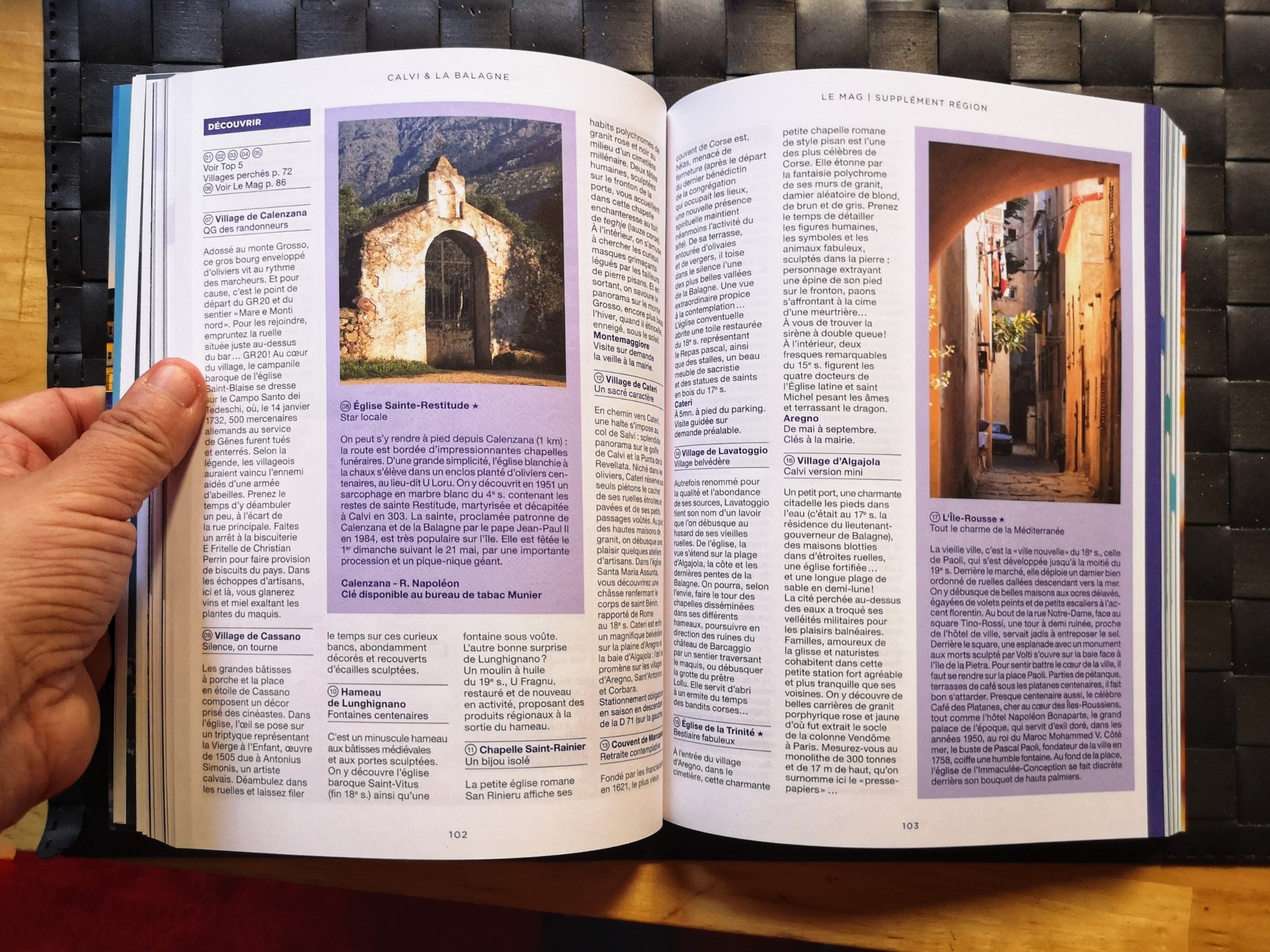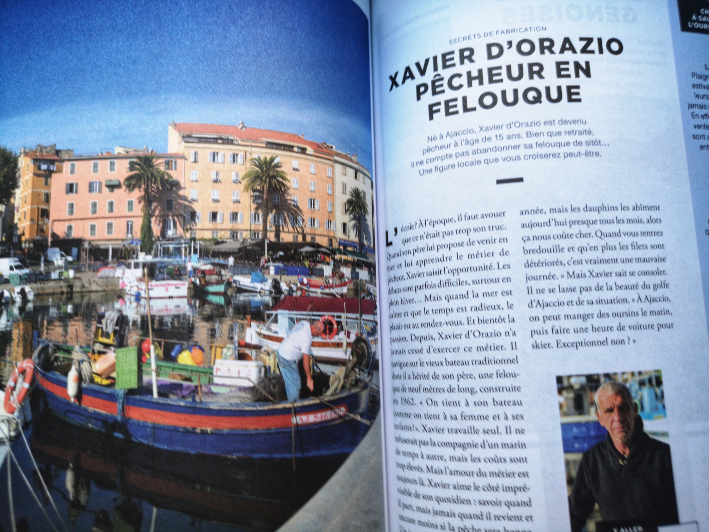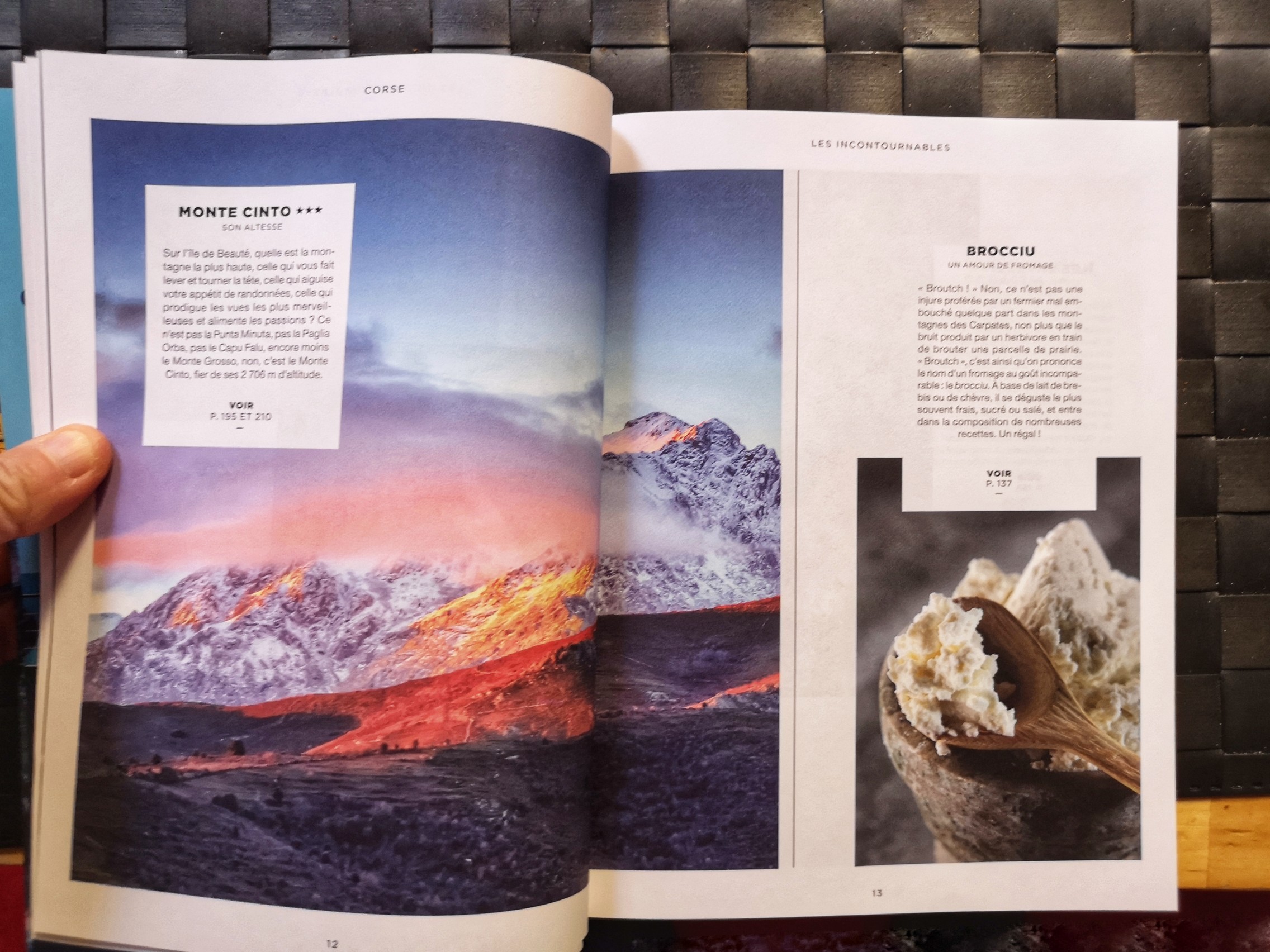 Ce qui m’a séduite, c’est un mélange entre le classique d’un guide (les adresses gourmandes du guide gastronomique et les adresses touristiques du guide vert) mais qui sont mélangées avec une partie qui ressemble à un magazine où l’on s’attarde un peu plus longtemps sur le patrimoine local, les produits typiques… et les Corses évidemment avec des portraits d’artisans, artistes, pêcheurs… le tout avec une mise en page qui donne envie de lire et de très belles photos qui pourraient figurer dans un magazine voyage mais aussi des graphiques et de dessins. On trouve même des recettes de cuisine et une petite playlist pour votre prochain roadtrip dans l’île de de Beauté. Bref, plutôt qu’un guide touristique, c’est un guide « lifestyle ». N’espérez pas y trouver tout ce que vous voudriez savoir sur la Corse mais bien une sélection d’adresses, d’expériences et des articles et insert qui vous permettront de mieux appréhender cette destination. Franchement, ça faisait longtemps (depuis les Bradt Guides qui restent pour moi le standard de ce que devrait être un guide) que je parcourrais bouquin du genre.