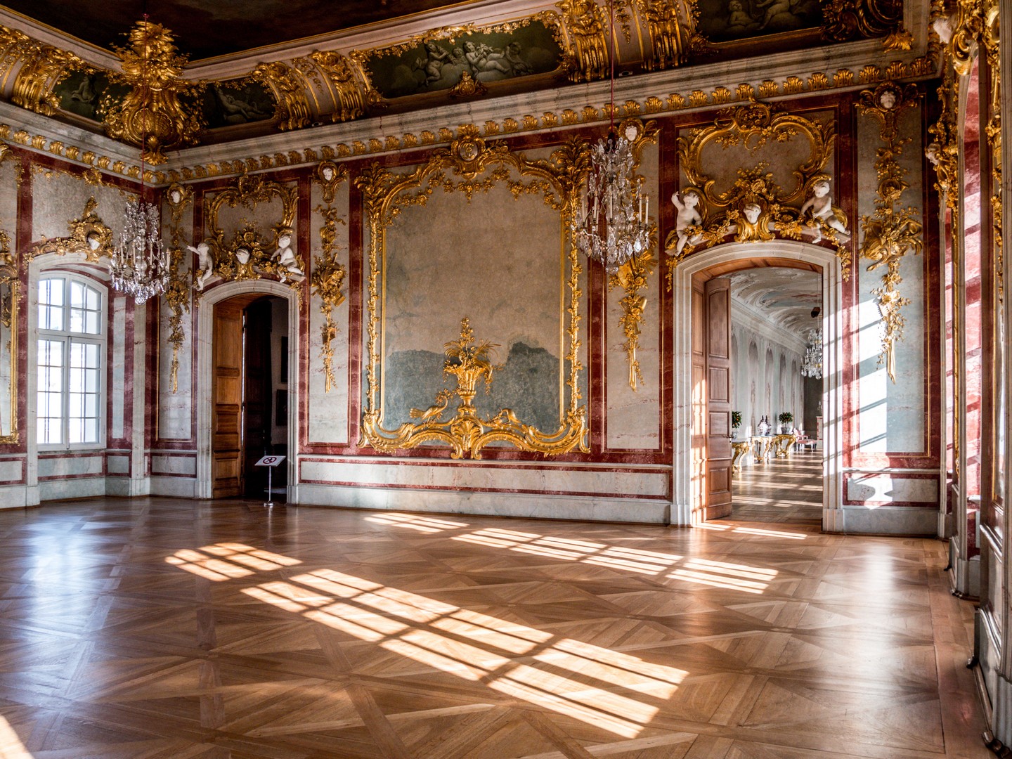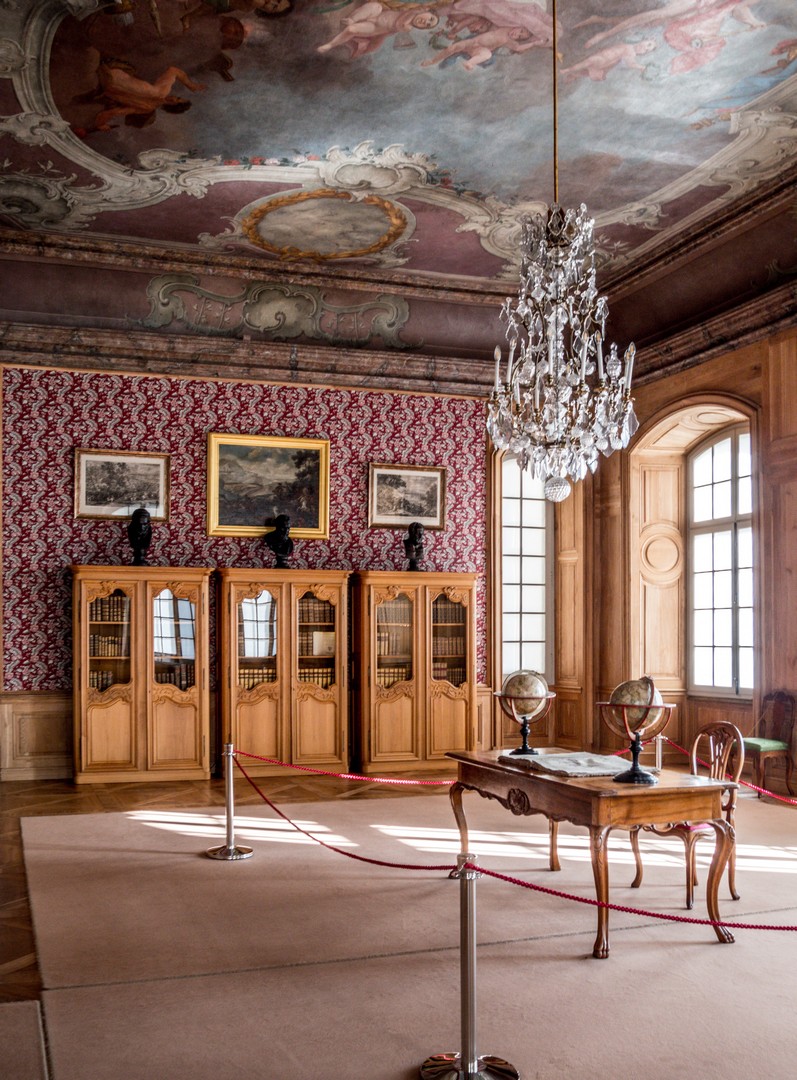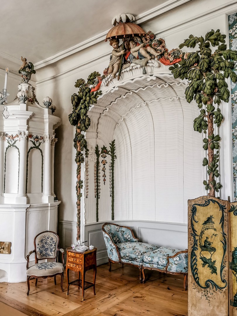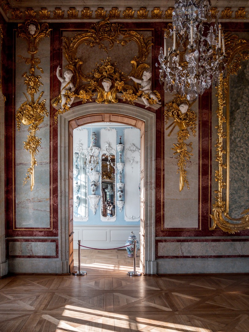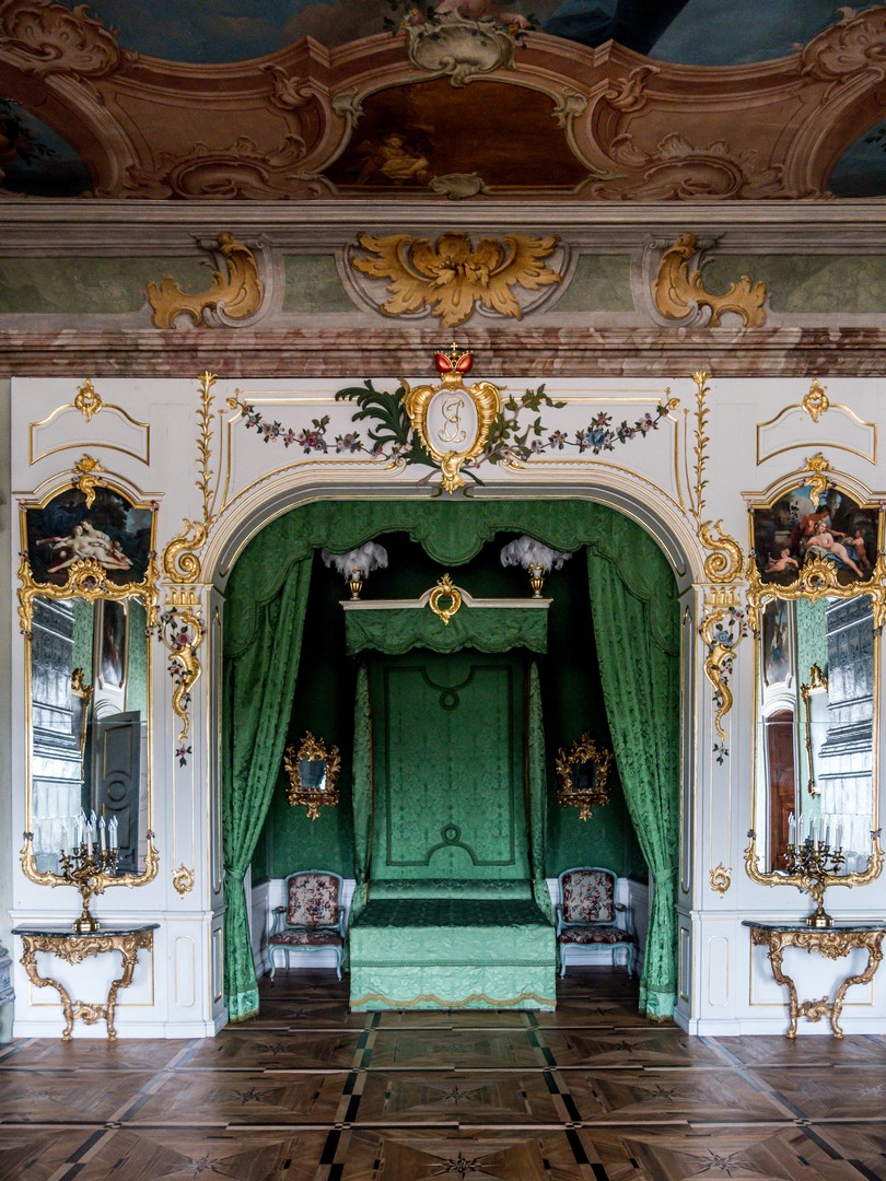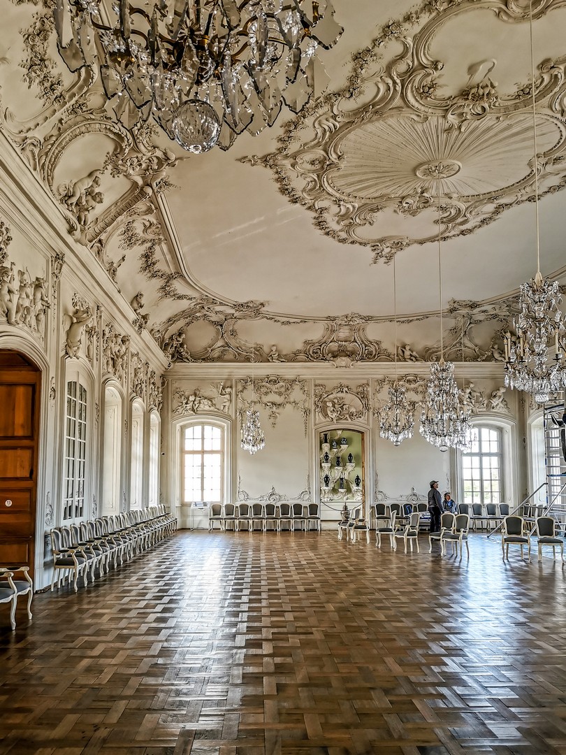 On pénètre d’abord dans l’antichambre de la célèbre chambre d’or. Peu d’éléments y sont d’origine, à l’exception notable du parquet et des portes, mais elle prépare parfaitement à ce qui suit. Juste à gauche de la porte pour accéder à la pièce suivante, prenez le temps de saluer Ernst-Johann von Biron, celui qui a fait construire le palais. La chambre d’or est, sans conteste, l’une des salles les mieux conservées du château. Elle est immense et comme le soleil a décidé de sortir des nuages, je me retrouve toute éblouie par le reflet de ses rayons sur les dorures qui garnissent les décors en plâtre qui sont encore d’origine. Le parquet date des années 1860, et même le plafond, repeint au XIXᵉ siècle, a relativement bien traversé le temps. Les rénovations ont permis d’en retrouver les teintes et la texture initiales. On ne sait trop où poser le regard tant la décoration est foisonnante et on comprend pourquoi cette pièce était faîte pour impressionner : c’était ici que le duc avait son trône, l’unique meuble de la chambre d’or ! Je prends tout de même le temps de tourner sur moi-même pour détailler la fresque centrale peinte au plafond : l’apothéose du duc Ernst-Johann, rien que ça. Ce n’est que la deuxième salle, et j’ai déjà le tournis !