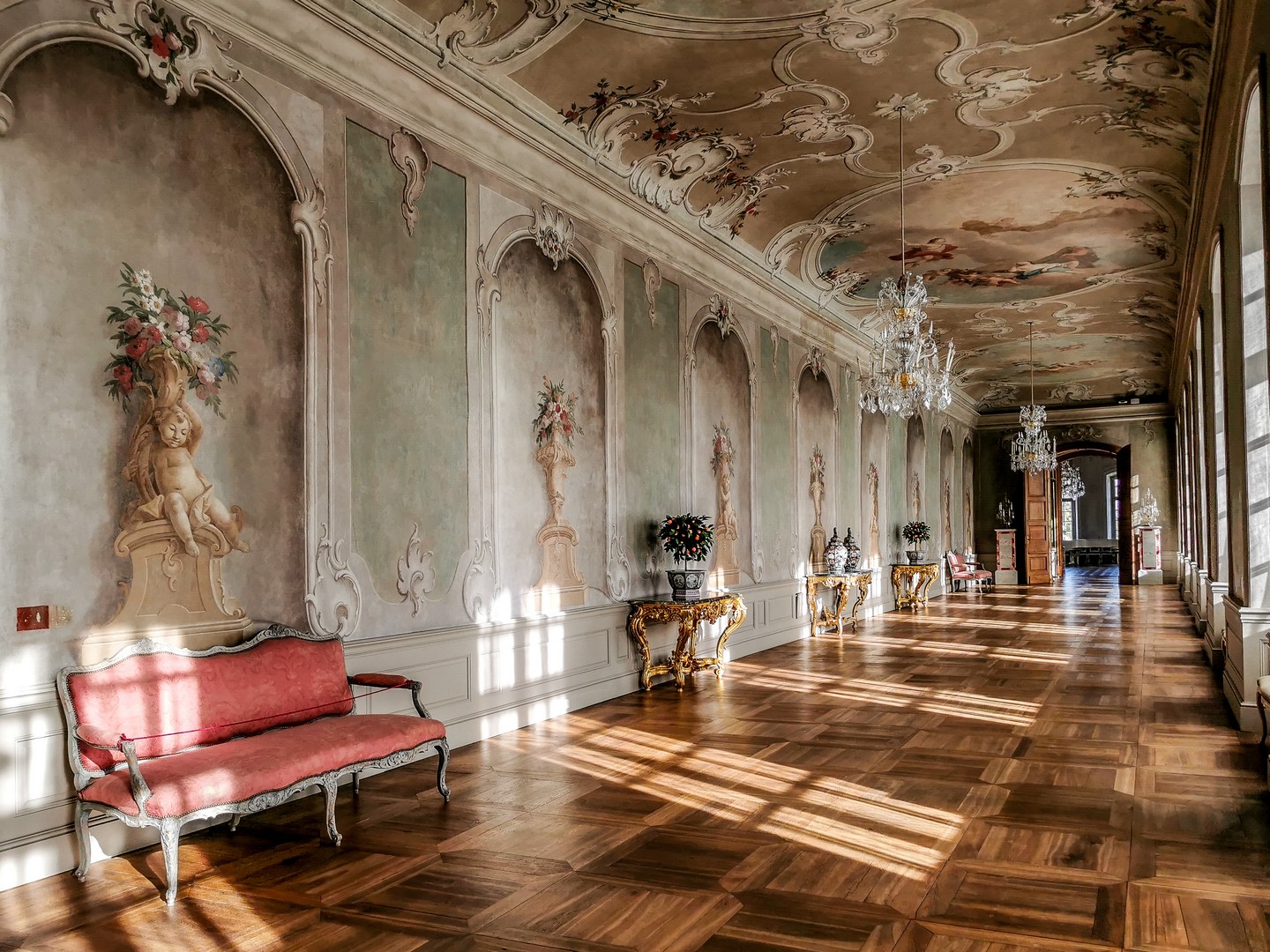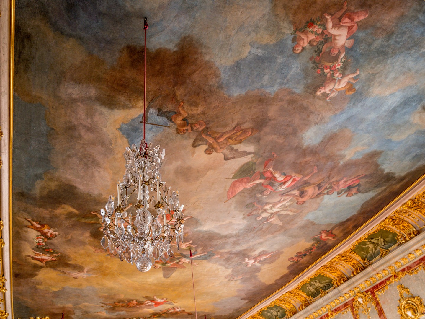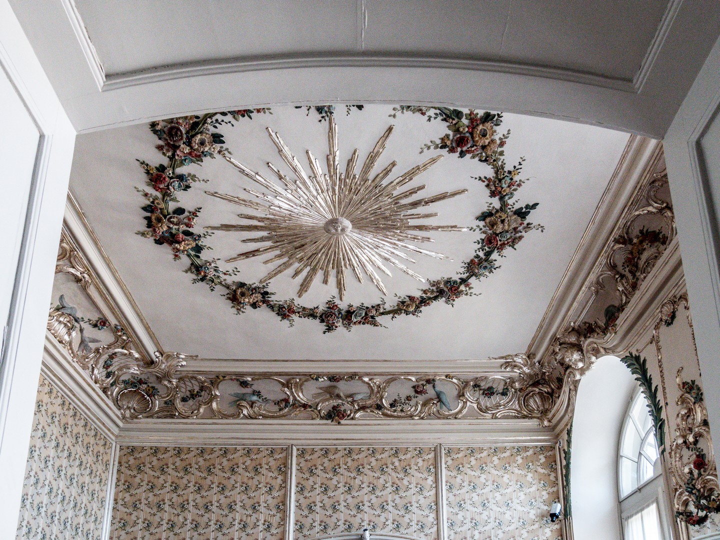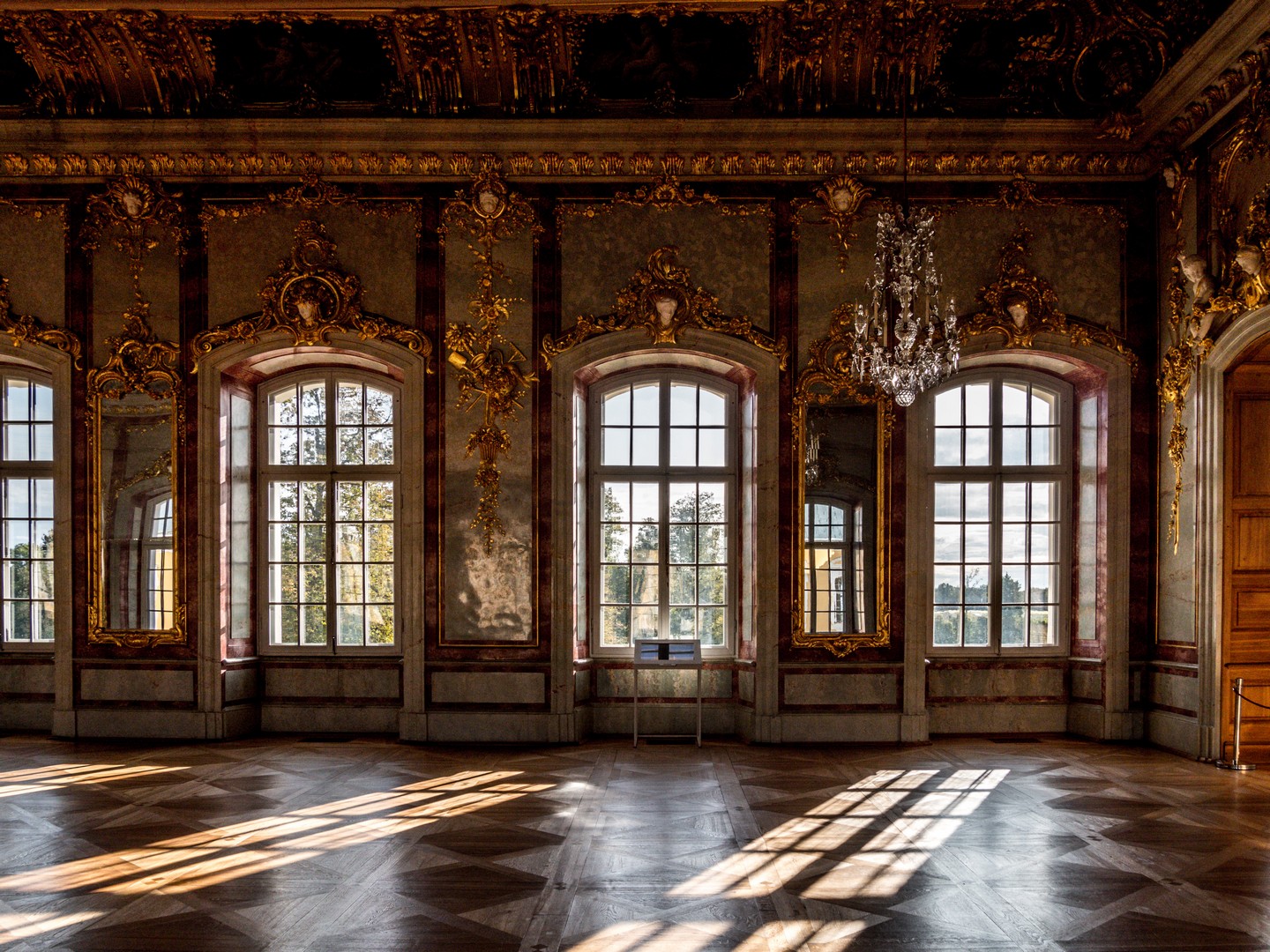 On pénètre d’abord dans l’antichambre de la célèbre chambre d’or. Peu d’éléments y sont d’origine, à l’exception notable du parquet et des portes, mais elle prépare parfaitement à ce qui suit. Juste à gauche de la porte pour accéder à la pièce suivante, prenez le temps de saluer Ernst-Johann von Biron, celui qui a fait construire le palais. La chambre d’or est, sans conteste, l’une des salles les mieux conservées du château. Elle est immense et comme le soleil a décidé de sortir des nuages, je me retrouve toute éblouie par le reflet de ses rayons sur les dorures qui garnissent les décors en plâtre qui sont encore d’origine. Le parquet date des années 1860, et même le plafond, repeint au XIXᵉ siècle, a relativement bien traversé le temps. Les rénovations ont permis d’en retrouver les teintes et la texture initiales. On ne sait trop où poser le regard tant la décoration est foisonnante et on comprend pourquoi cette pièce était faîte pour impressionner : c’était ici que le duc avait son trône, l’unique meuble de la chambre d’or ! Je prends tout de même le temps de tourner sur moi-même pour détailler la fresque centrale peinte au plafond : l’apothéose du duc Ernst-Johann, rien que ça. Ce n’est que la deuxième salle, et j’ai déjà le tournis !