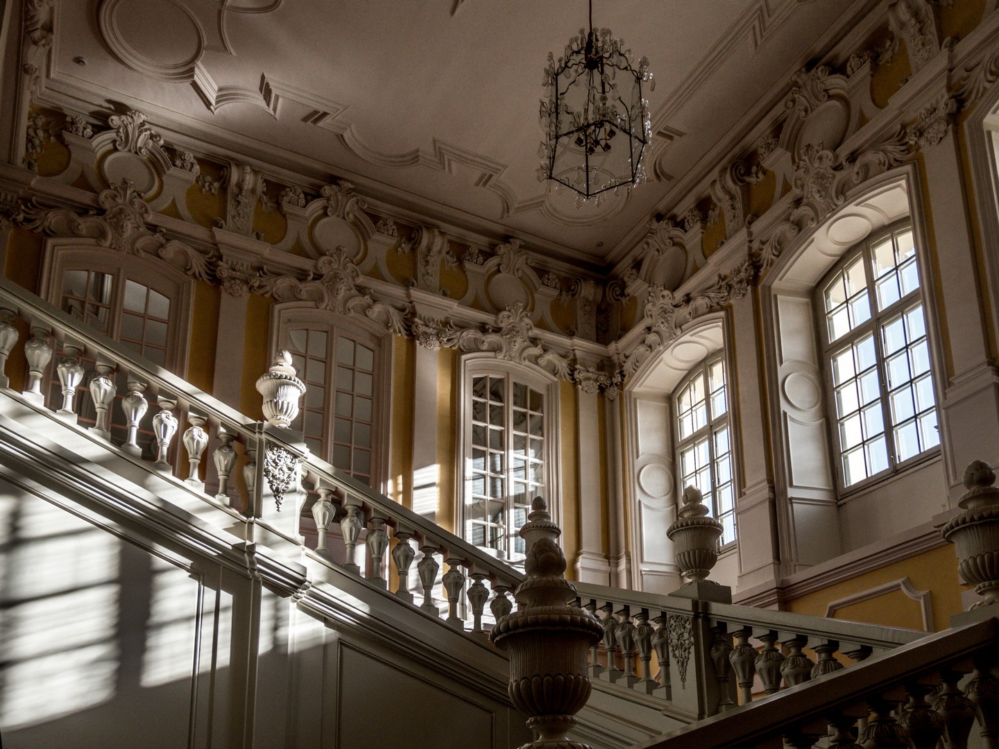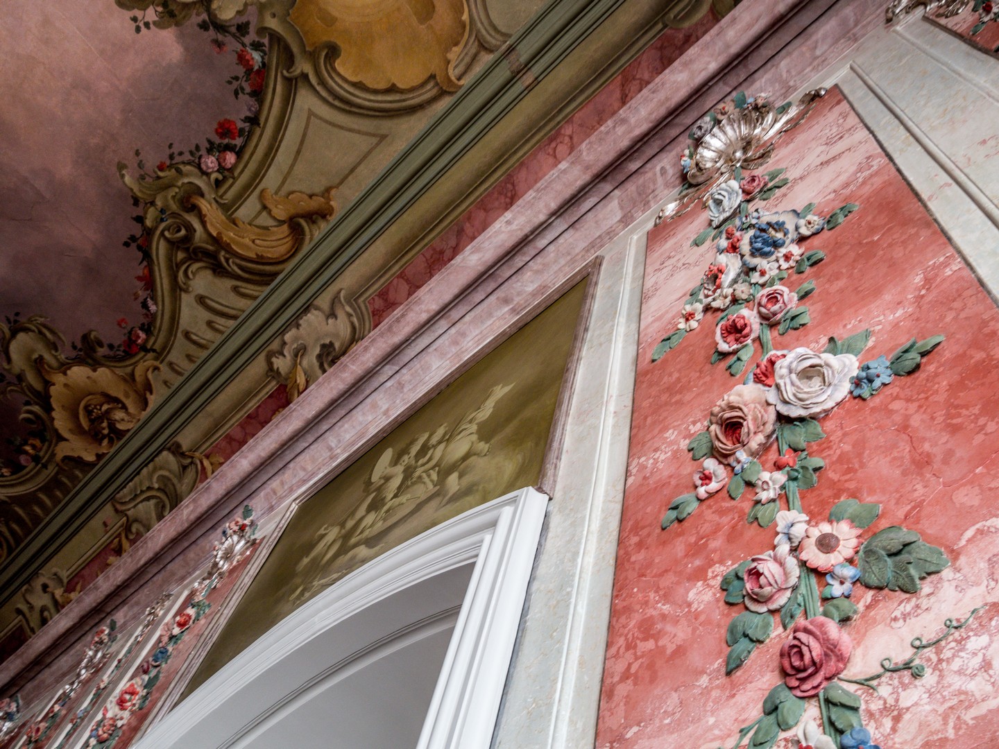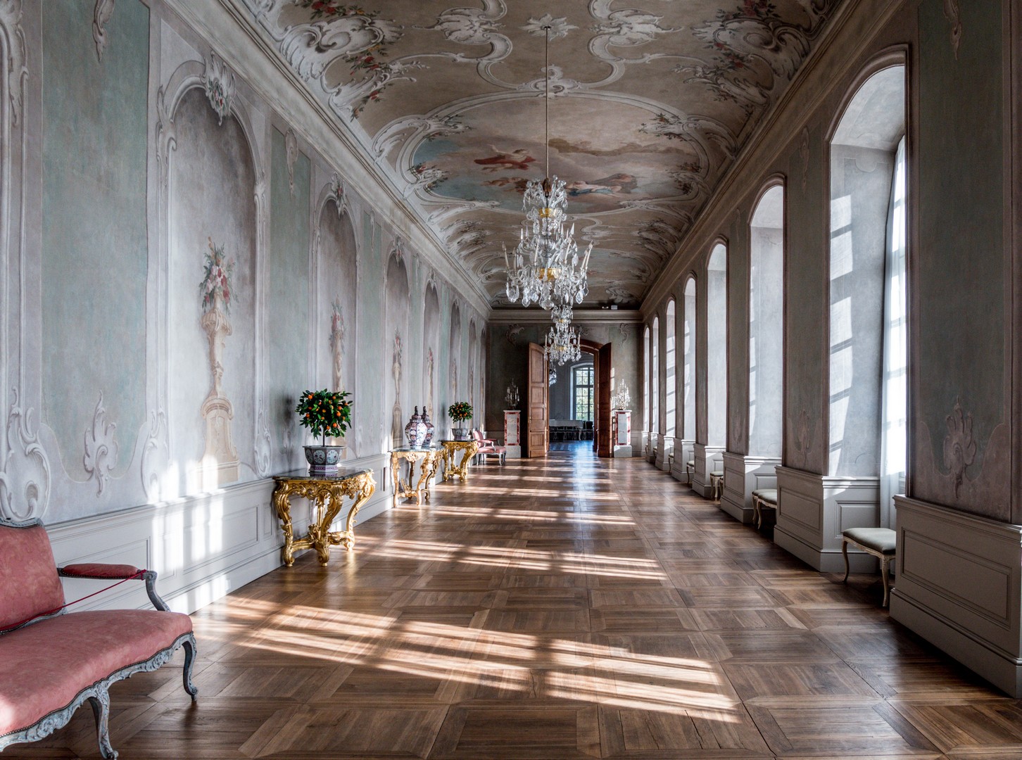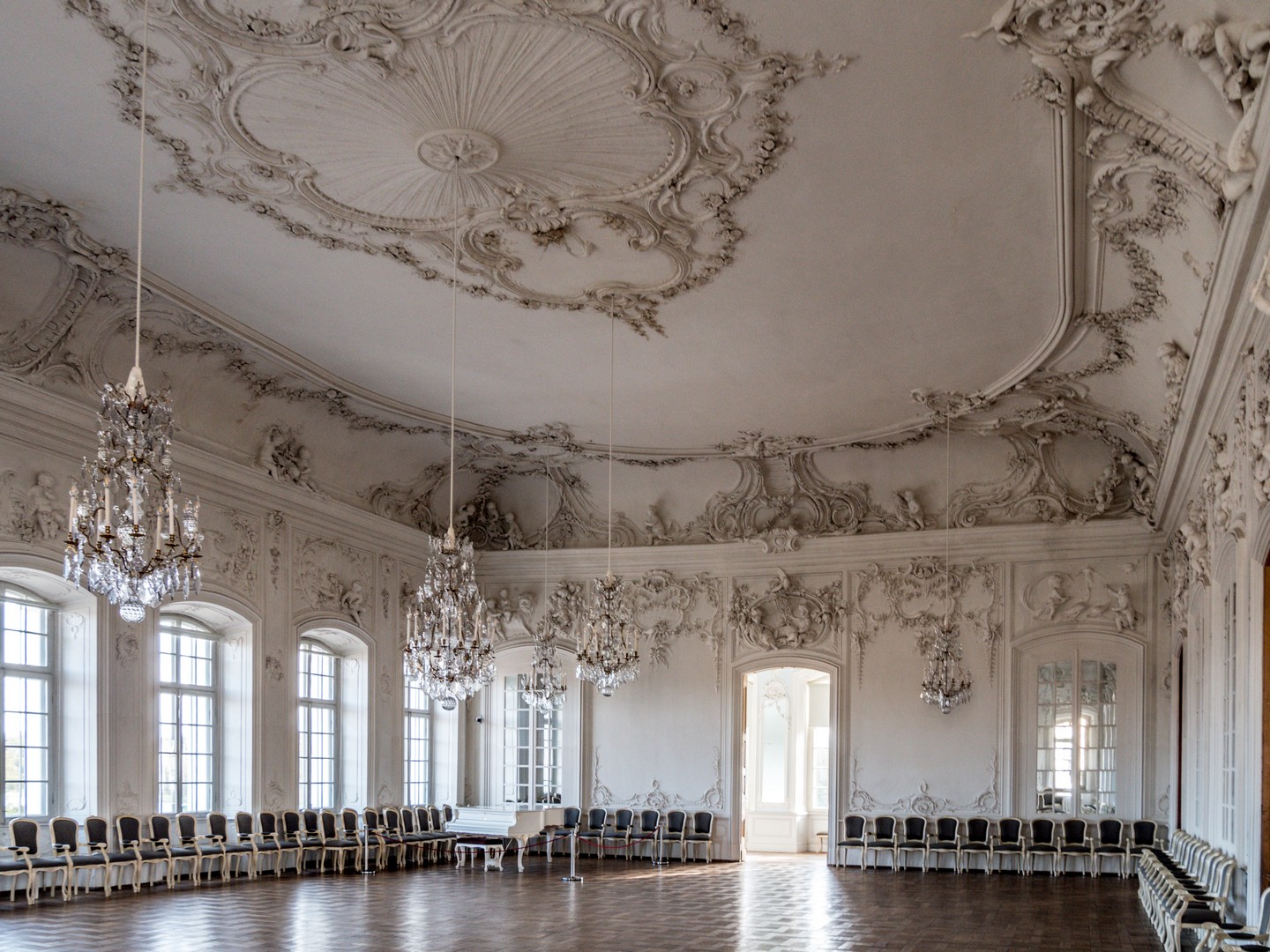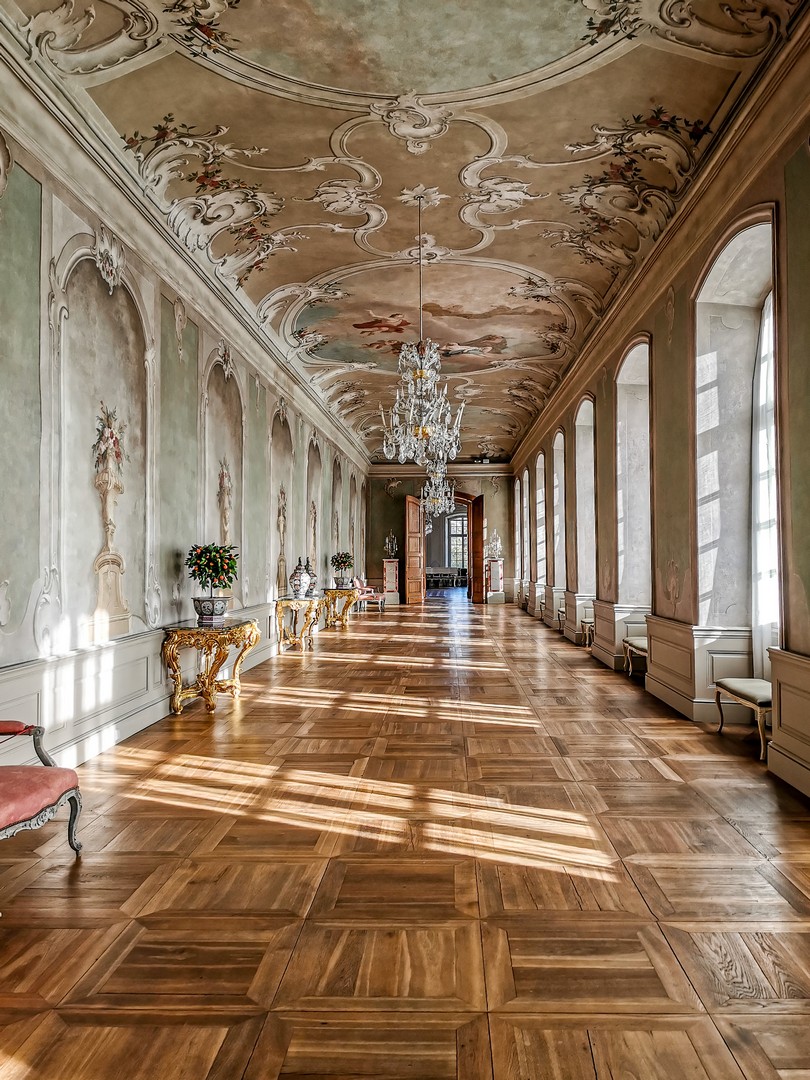 La salle blanche mérite à elle seule une longue pause. D’abord conçue pour être une chapelle, elle sera finalement destinée… aux bals, elle porte ce nom depuis le XVIIIᵉ siècle. Ici, tout a été pensé pour créer une atmosphère lumineuse et légère. Après l’exubérance de la chambre d’or, cette salle passerait pour minimaliste, si on ne faisait pas attention aux dizaines d’ornements qui la décorent, un véritable chef-d’œuvre de Johann Michael Graff, le décorateur principal du palais. Dans toute cette blancheur, on peut facilement imaginer que les robes des dames et costumes des messieurs devaient apparaître encore plus chatoyants !