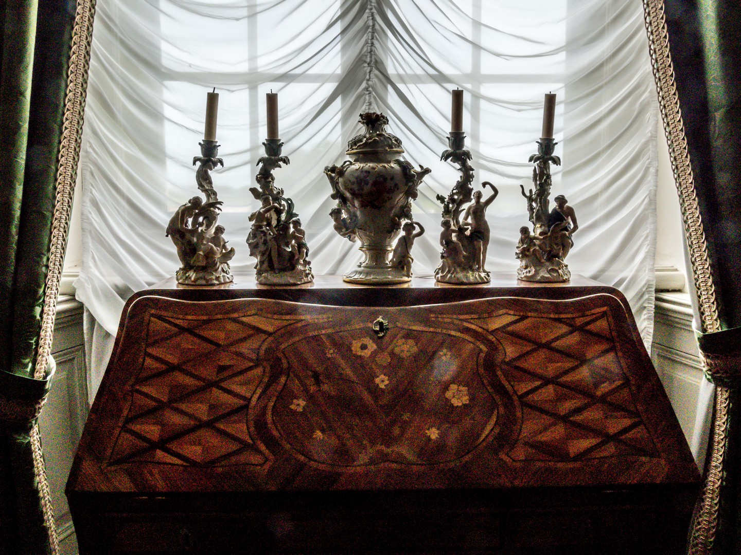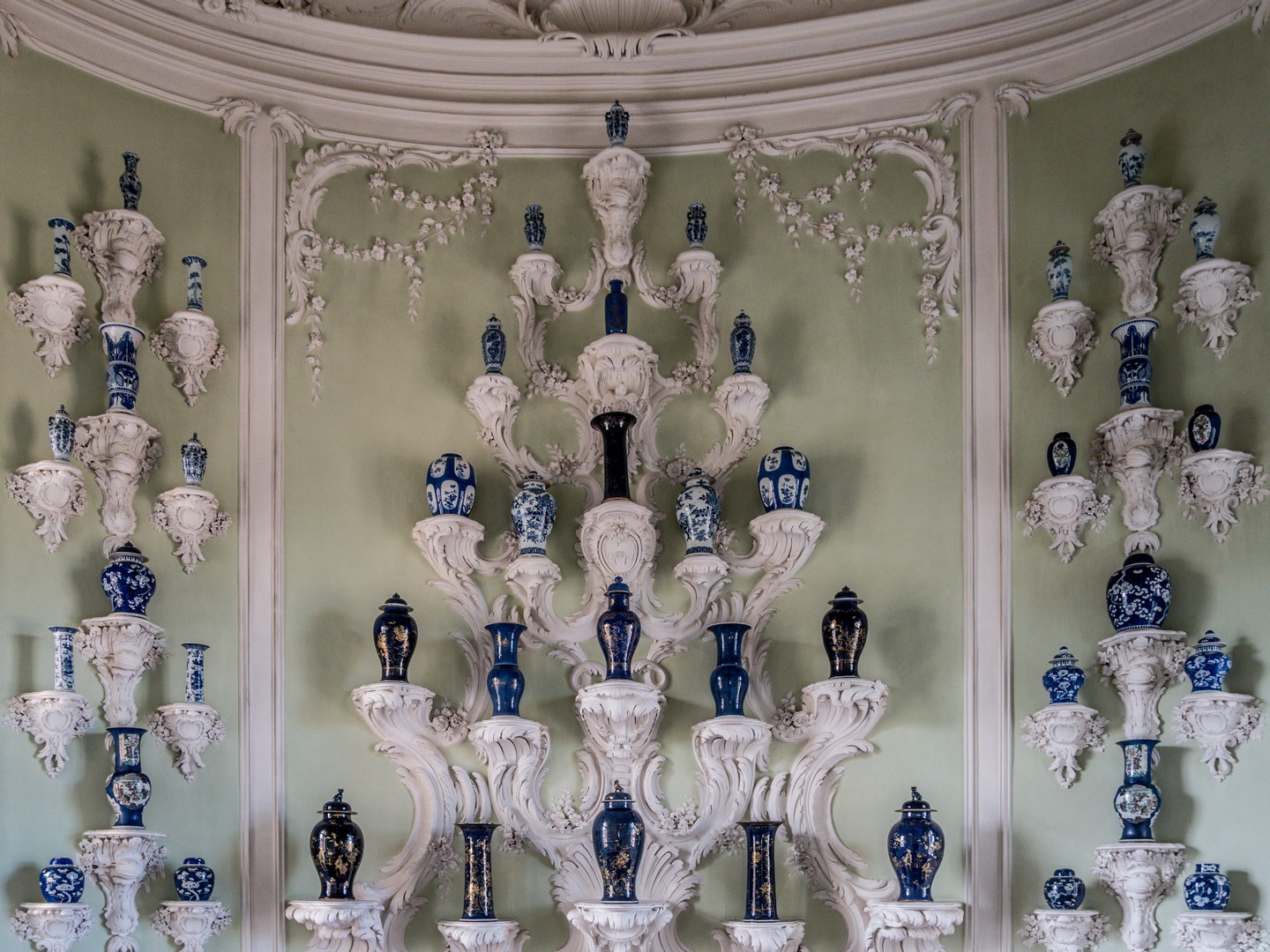 À l’ouest de la salle blanche se niche l’une des pièces les plus insolites du château, là où normalement, devait se trouver un escalier pour la chapelle qui ne fut jamais construite : le cabinet ovale de porcelaines. Il déploie un spectaculaire décor de 45 consoles faites à la main. Alignées puis entrelacées dans un jeu de courbes presque organiques, elles évoquent une cascade figée, soutenant des porcelaines chinoises et japonaises. On dirait littéralement une « fontaine de porcelaine », c’est charmant !