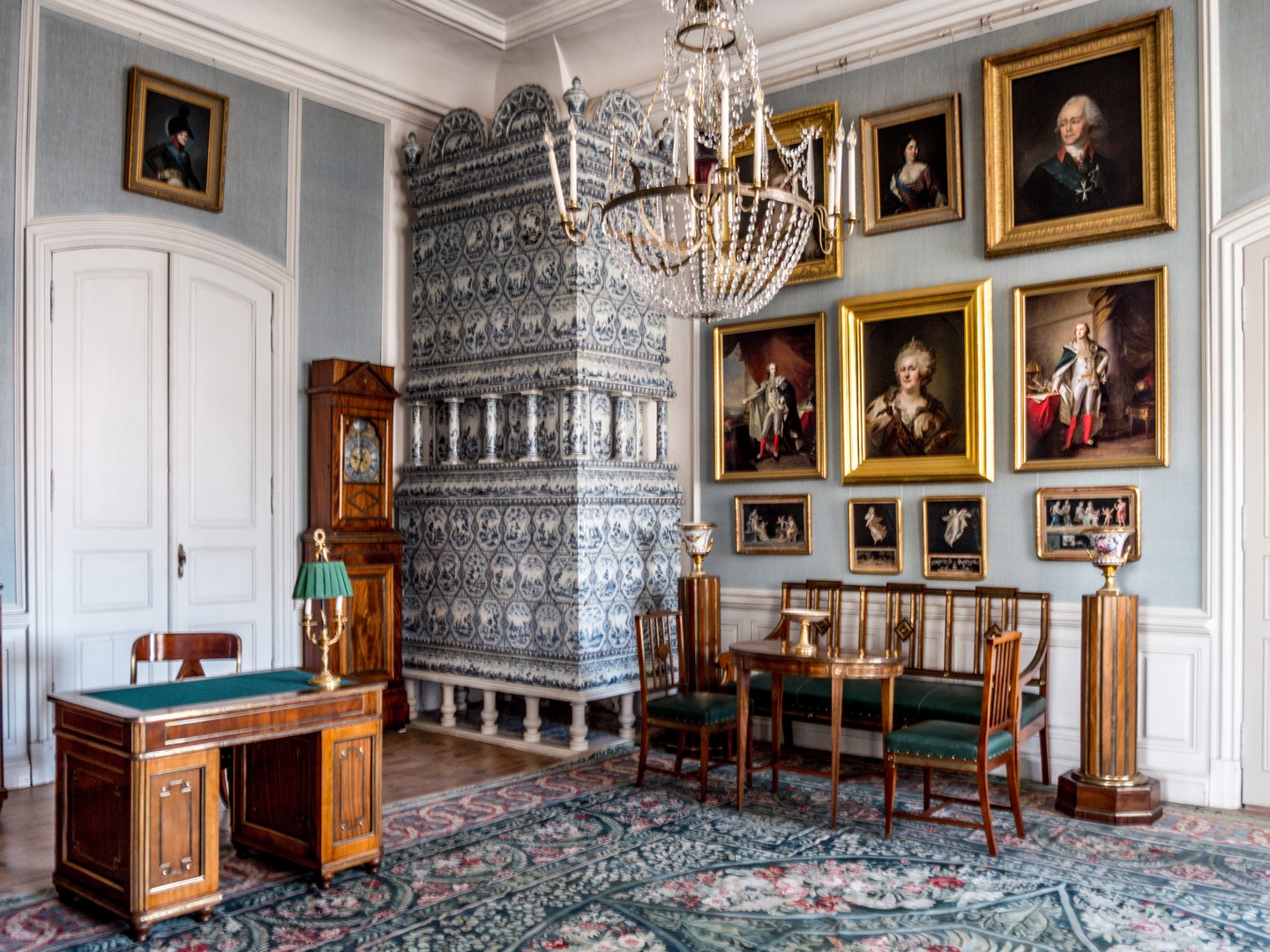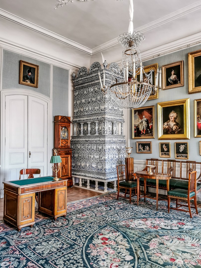 La visite s’achève par la salle de billard, témoignage de l’importance des jeux dans la bonne société de l’époque, et par le cabinet d’étude du duc et une étrange enfilade de pièces dédiées à sa toilette (salle de bain et vestiaire). Sur le chemin, je croise les visages des plus importants successeurs des ducs de Courlande : les Shouvalov. Ils héritent du palais via mariage et le détiendront jusqu’à la première indépendance de la Lettonie, à la fin de la Première guerre. Une ancienne antichambre leur est dédiée où l’on peut y admirer des peintures (et une photo) des trois générations de Shouvalov qui habitaient ici, ainsi que des portraits de tsars et tsarines de Russie.