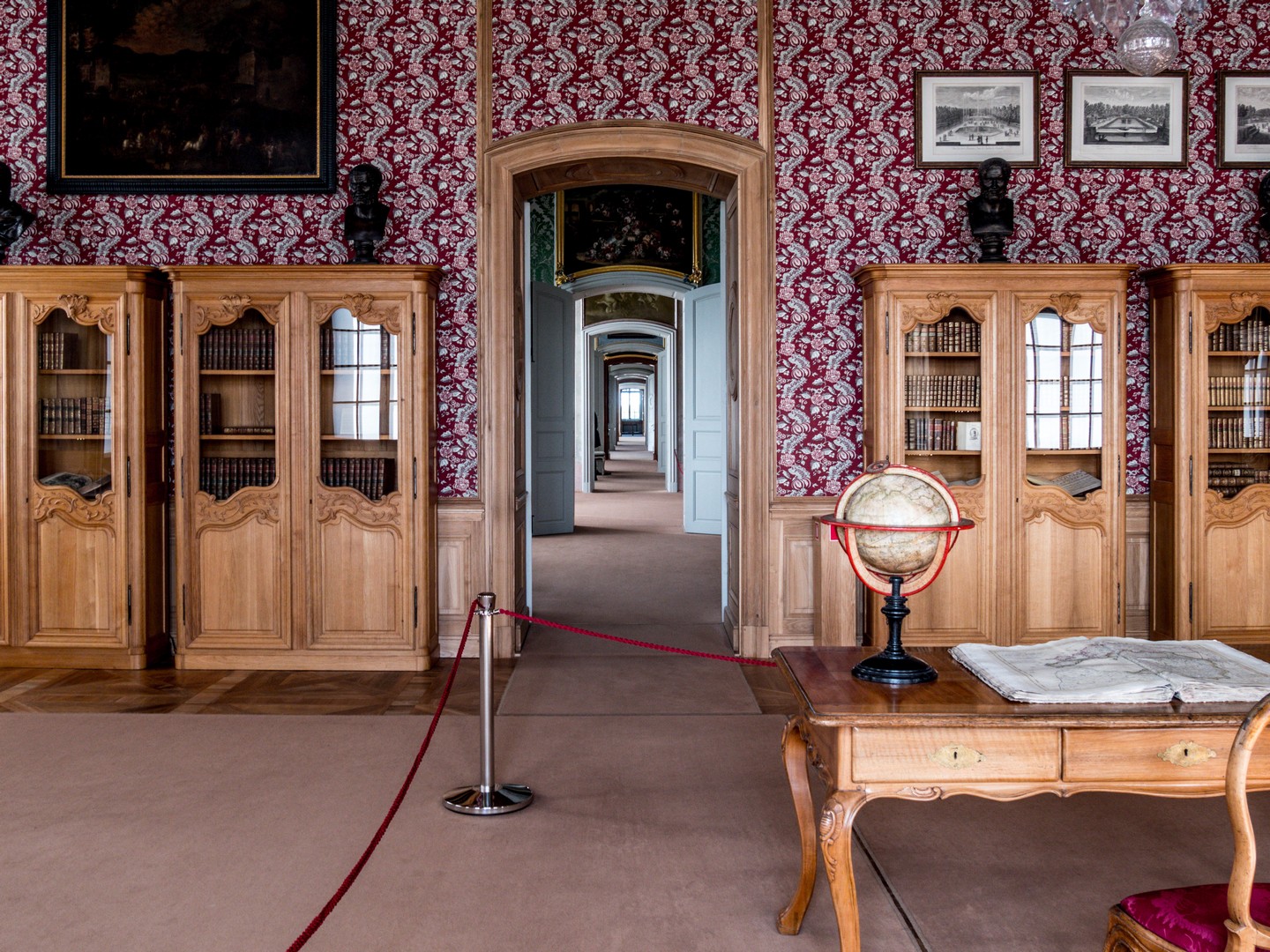 De là, on accède aux anciens appartements du duc, organisés en deux longues enfilades parallèles. Côté jardin, on traverse bibliothèque, chambre à coucher et salle de billard ; côté nord se succèdent chambres privées, cabinets, garde-robe et salles de bains. Chaque pièce surprend par sa palette de couleurs, toujours différente de la précédente.