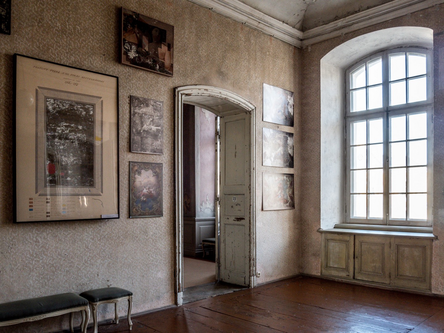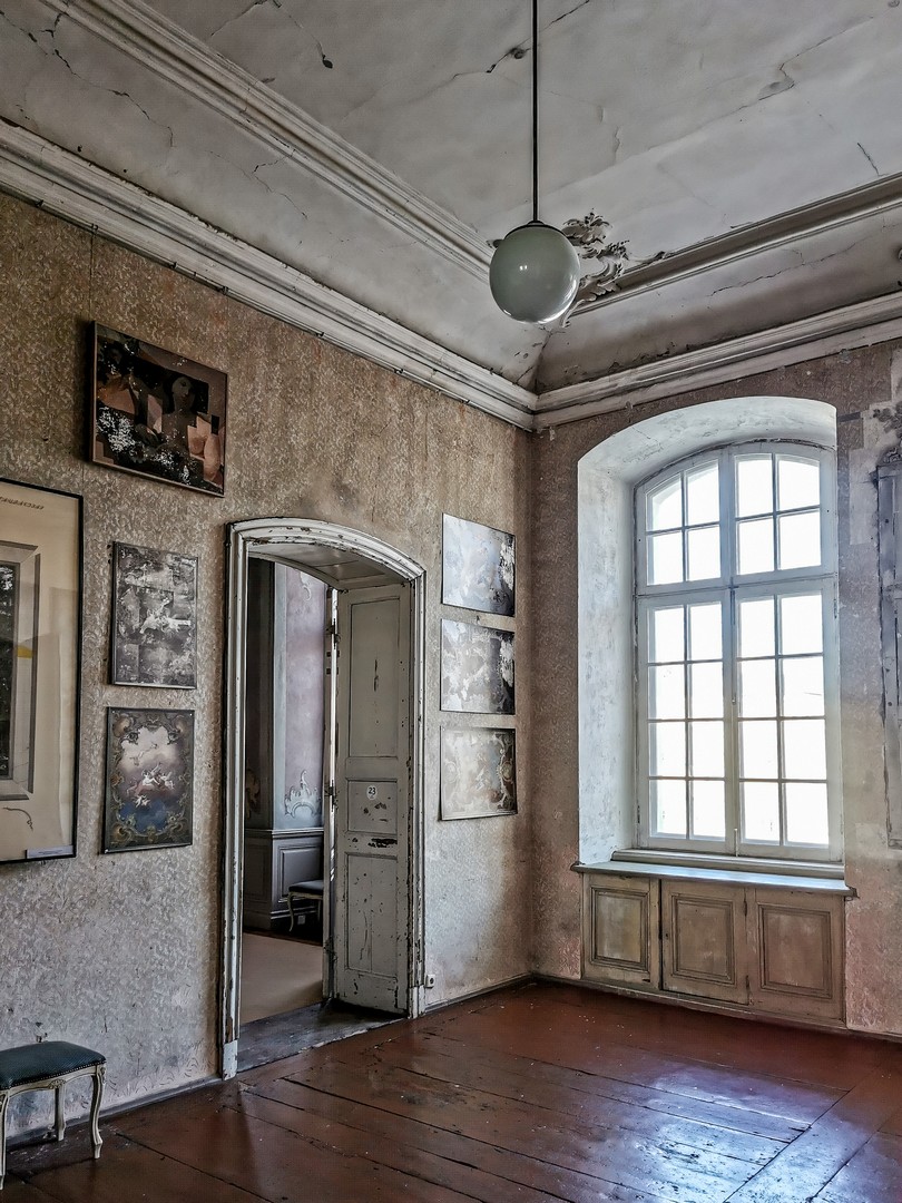 Des décors peints de blanc couvrent murs et plafonds : à première vue symétriques, ils se révèlent tous différents. Scènes de vie villageoise, métiers d’autrefois, allégories des saisons et des éléments… le regard ne sait où se poser, comme pour la Chambre d’or. Au centre du plafond trône le célèbre nid de cigognes, composé de vraies branches légèrement recouvertes de plâtre. Le parquet, quant à lui, a dû être remplacé à la fin du XIXᵉ siècle, trop usé par les pas des danseurs. Lors de mon passage, les rénovations étaient quasi finies, vous devriez trouver la salle blanche pimpante comme aux premiers jours !