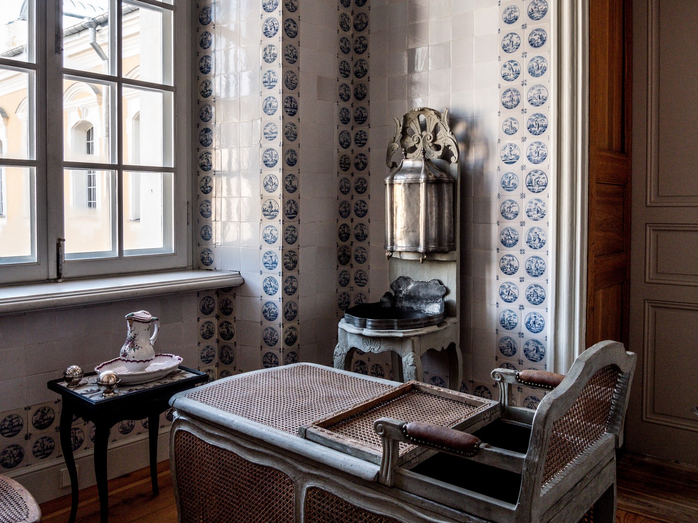 La bibliothèque dévoile encore une devise latine au plafond, Laborem in victoria nemo sentit (Personne ne ressent l’effort dans la victoire) tandis que la chambre rose séduit par sa délicatesse, ses décors floraux et ses touches d’argent, inspirés des goûts architecturaux prussiens (un autre fait d’arme de J.M. Graff). Plus loin, le salon hollandais, le vaste bureau du duc et la chambre ou il s’habillait (oui, oui, toute une pièce juste pour se faire beau) se traversent avec des étoiles dans les yeux ! Juste avant la partie la plus privée des appartements ducaux, la chambre des portraits raconte, à travers peintures et tapisseries, les liens politiques et familiaux du duché de Courlande avec les grandes puissances européennes (la Prusse, l’Autriche, la Russie, la Pologne…).