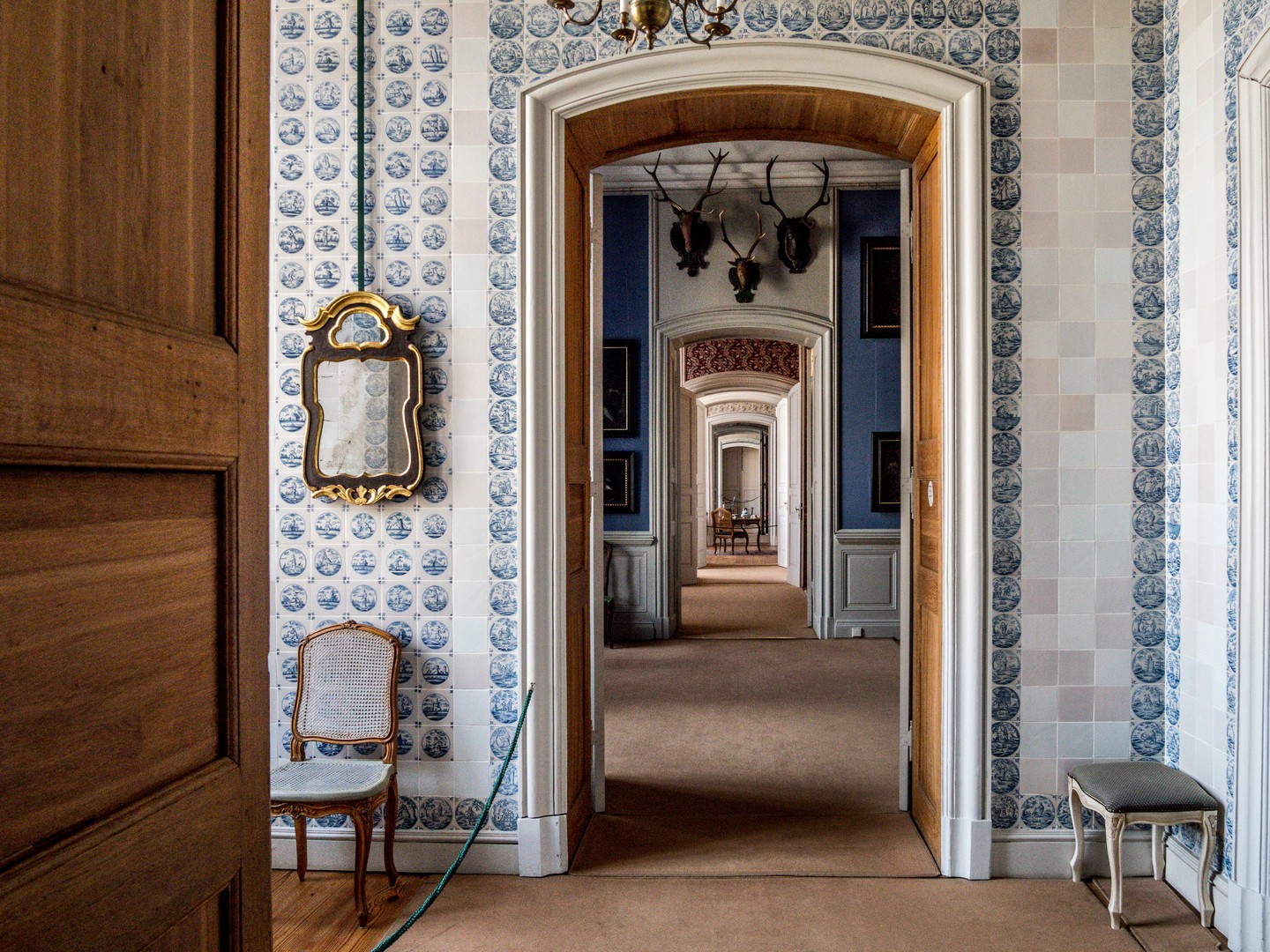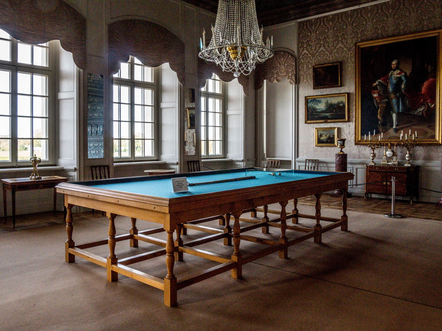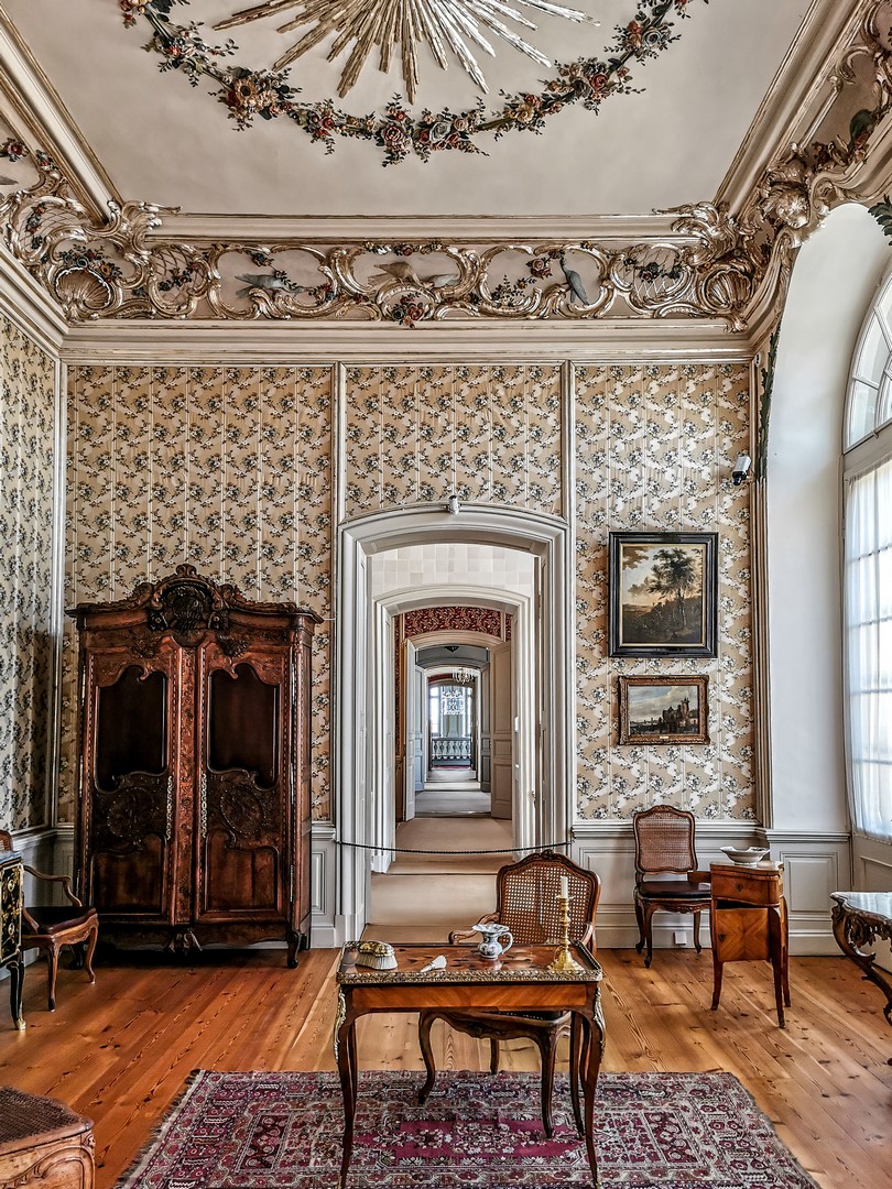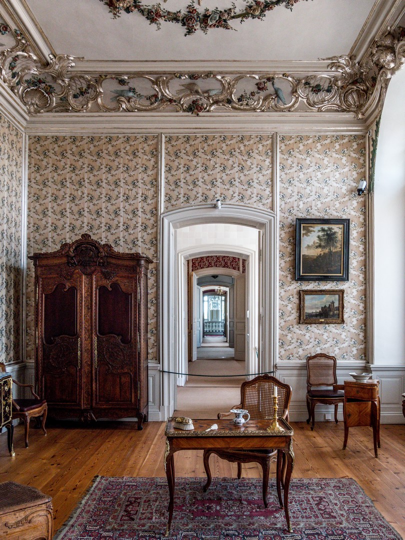 Dernière pièce « publique », le salon bleu retient particulièrement l’attention avec ses murs tendus de soie bleue et ses nombreuses natures mortes peintes par des artistes flamands et hollandais, que Peter, le successeur de Ernst-Johann, appréciait particulièrement et collectionnait avidement.