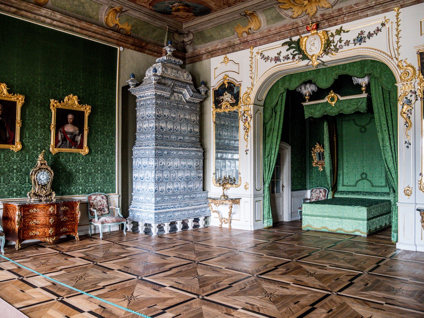 Au centre de cette enfilade se trouve la chambre à coucher du duc, véritable pièce maîtresse. Le parquet baroque, posé en 1739, est considéré comme l’un des plus remarquables de Lettonie. La cheminée en porcelaine bleue, unique à n’avoir jamais été modifiée, attire immédiatement le regard. Tout ici est symbolique, jusqu’au choix très mesuré des tableaux. Mais c’est surtout le lit, mis en scène dans une niche comme s’il était lui-même une scène théâtre, qui retient toute l’attention.