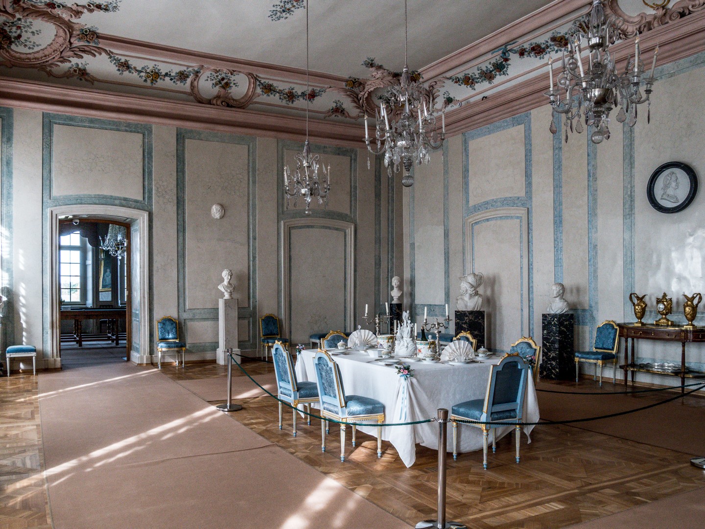 Le même thème continue au salon italien, avec de la soie bleue en guise de décoration, plutôt que rouge. Il témoigne de l’amour du duc Peter pour l’Italie où il ne passa pas moins d’un an, en famille, entre Rome, Florence ou Venise. De là, on passe à la salle à manger personnelle du duc, qui mêle textures sobres et plafonds richement décorés de stucs colorés. La table est dressée comme s’y on attendait les Courlande et leurs invités à tout moment.