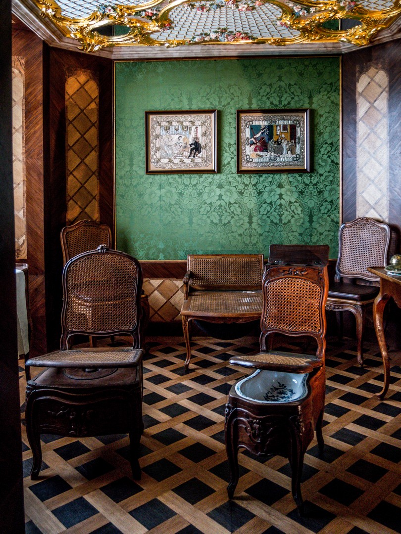 Enfin, les appartements de la duchesse, offrent une plongée dans l’intimité de la vie de cour. Beaucoup moins fastes et plus petits, ils témoignent d’une vie plus « domestique ». Seuls le boudoir (et sa magnifique niche à canapé en forme de coquillage) et la chambre à coucher présentent un peu d’extravagance. Ces appartements servent en partie à une des expositions permanentes du palais sur la mode au XVIIIe siècle (si vous aimez les belles robes, vous allez vous régaler), la famille de la duchesse Dorothea…