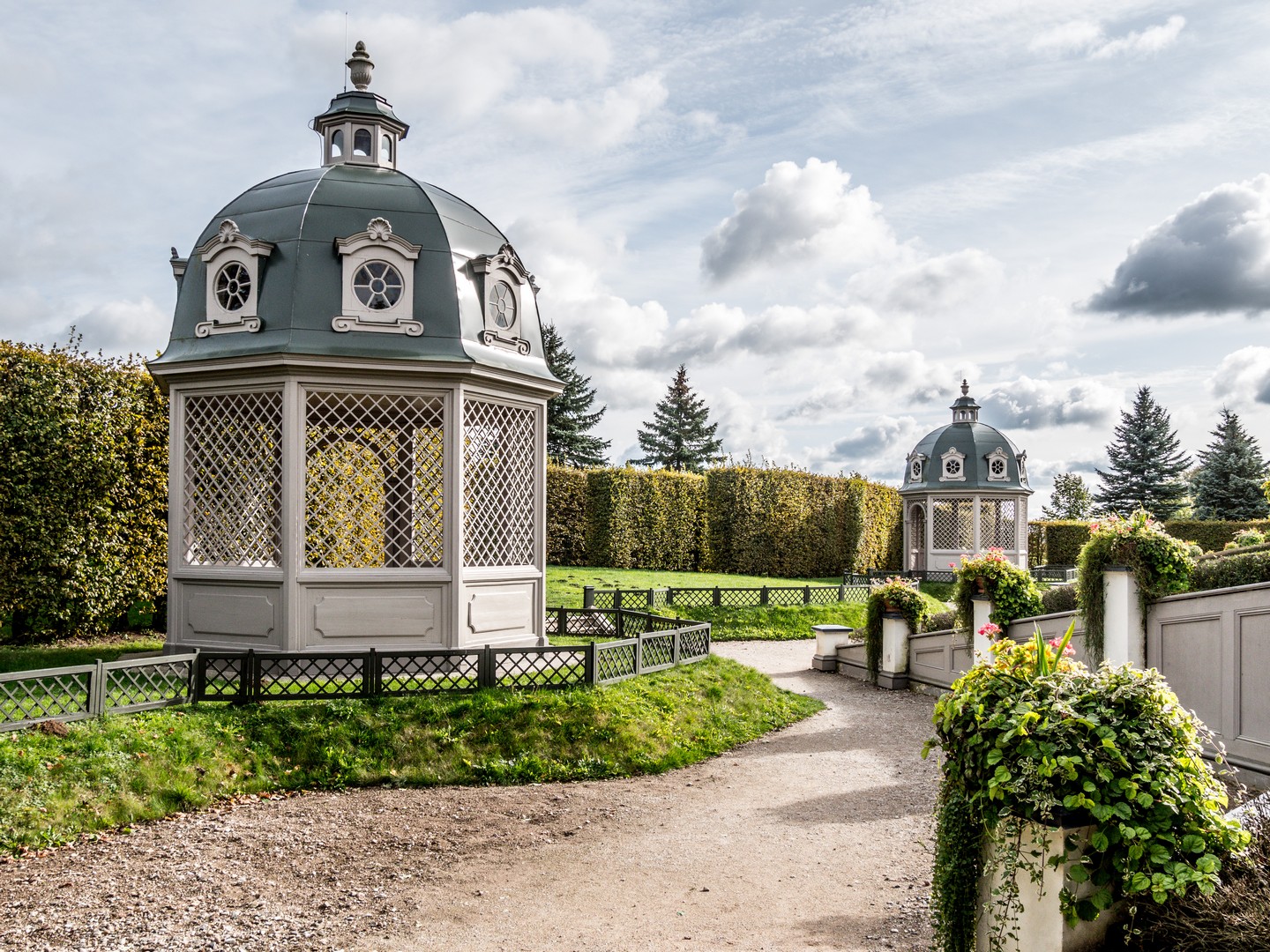 Pour un tel palais, il fallait des jardins qui suivent ! Pour cela, von Biron fait appel aux frères Christopher et Michael Weyland qui, sur les plans de Rastrelli, lui concoit un jardin baroque à la française, avec de grandes allées, un plan d’eau, des pavillons, un théâtre de verdure… propices à la promenade, pour voir et être vus. À l’origine, les jardins étaient bien plus que de simples agréments. On y trouvait aussi un verger avec divers arbres fruitiers, et même une houblonnière ! Si les jardins ont peu été touchés par la vogue des parcs à l’anglaise au XIXe siècle, il était en bien mauvais état à l’époque soviétique. Assez que pour qu’on s’occupe de le rénover dans les années 1970.