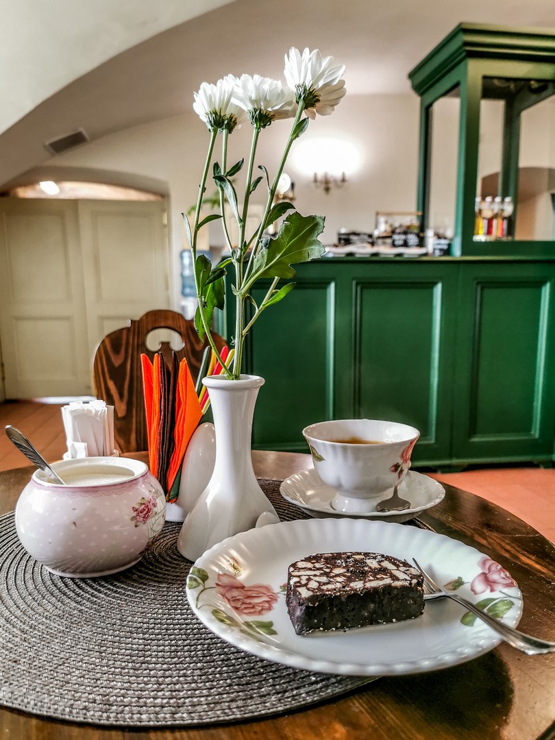 Il faut redescendre un peu sur terre après tout ce faste et ce luxe : nous voilà donc de retour « à la cave » où se loge le mignon café du château : le Pilskrogs. C’est le moment de prendre un café, de grignoter une pâtisserie ou de faire un lunch léger : ambiance rustique, petites fleurs champêtre séchées, l’ambiance est bien différente de tout ce qu’on a vu jusqu’ici, on pourrait être à la « cantine des domestiques ». Mais la pause est bien nécessaire avant de parcourir les immenses jardins du palais.