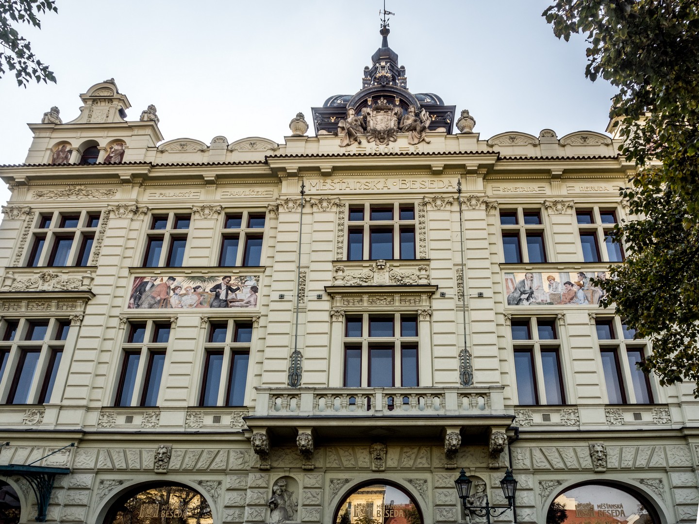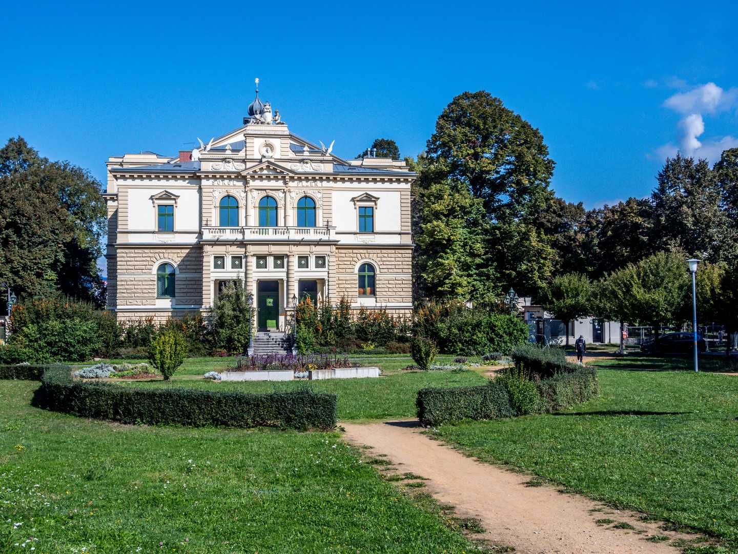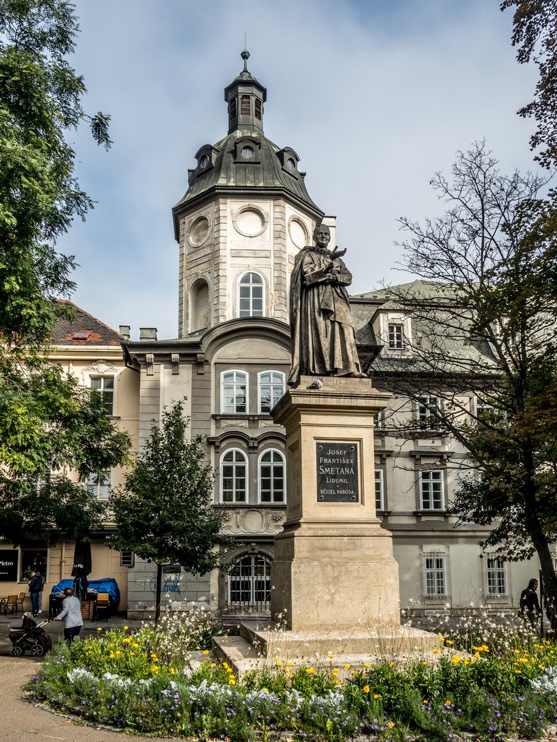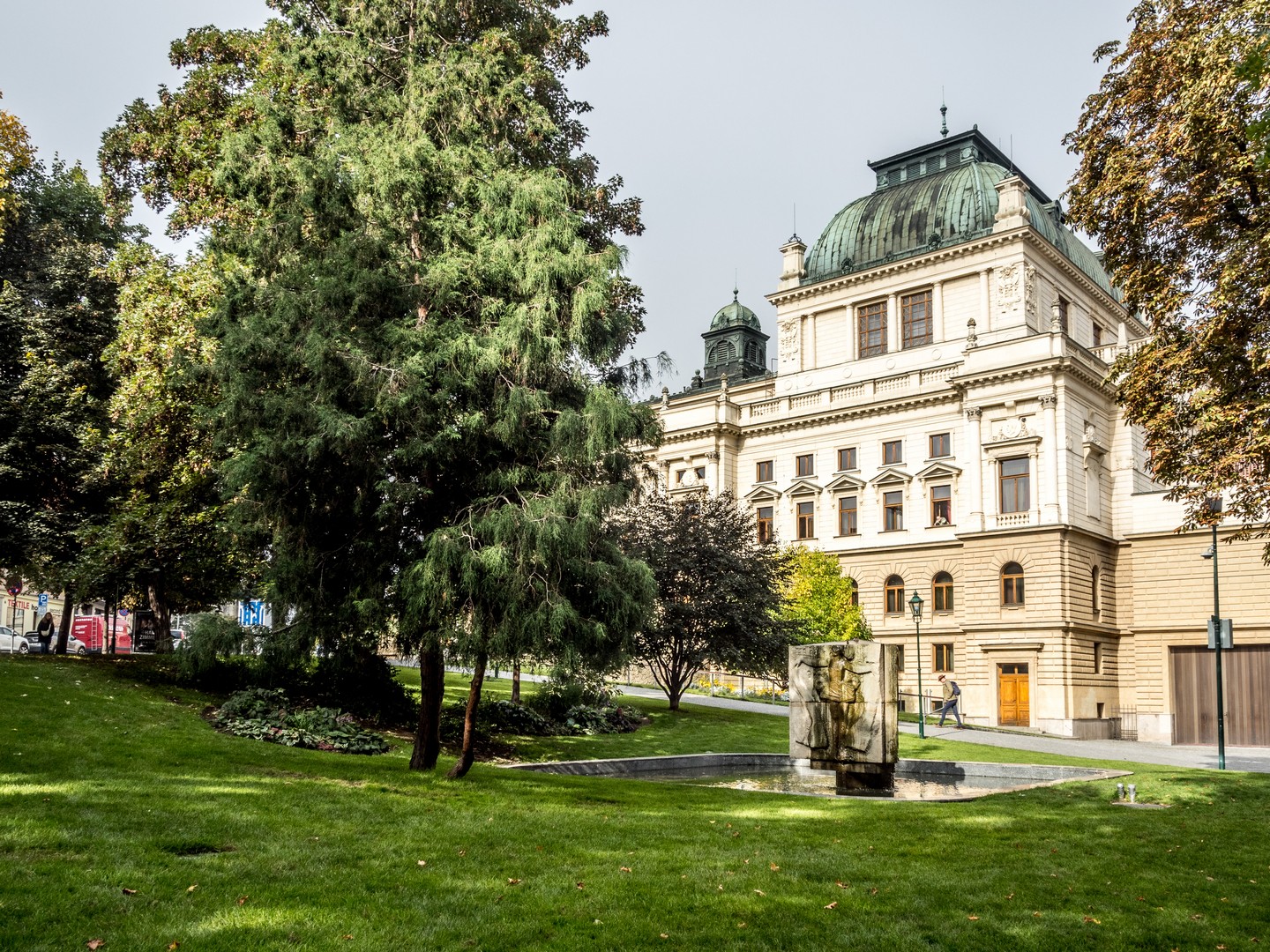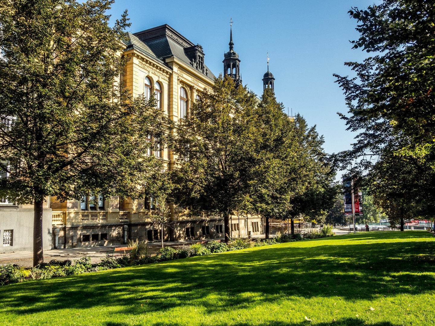 Un peu plus loin, le Burghers’ Hall, l’une des plus belles façades de la ville, se distingue par ses fresques Art nouveau célébrant le savoir et la culture. Bien des évènements (concerts, festivals, bals, réunions…) se sont tenus et se tiennent encore entre ses murs et j’aurai adoré visiter les lieux. Si le plumage se rapporte au ramage, il doit être merveilleux (je suis allée voir les photos, il l’est). Vous pourrez en avoir un avant-goût au restaurant Beseda 1901, au rez-de-chaussée. J’ai failli y aller boire un café, mais malheureusement, il ne me restait qu’une demi-heure pour compléter ma visite de Pilsen. La rue mène ensuite à un petit poumon vert marquant les limites de la vieille ville, là où se dressaient autrefois les murailles de défense : le Circuit des jardins de la ville, une chaîne de parcs et de jardins qui ceinture cette partie de Pilsen. Les jardins de Smetana et de Kopecký longent le Grand Théâtre et l’impressionnant Musée de Bohême occidentale (que je n’ai pas eu le temps de visiter).
