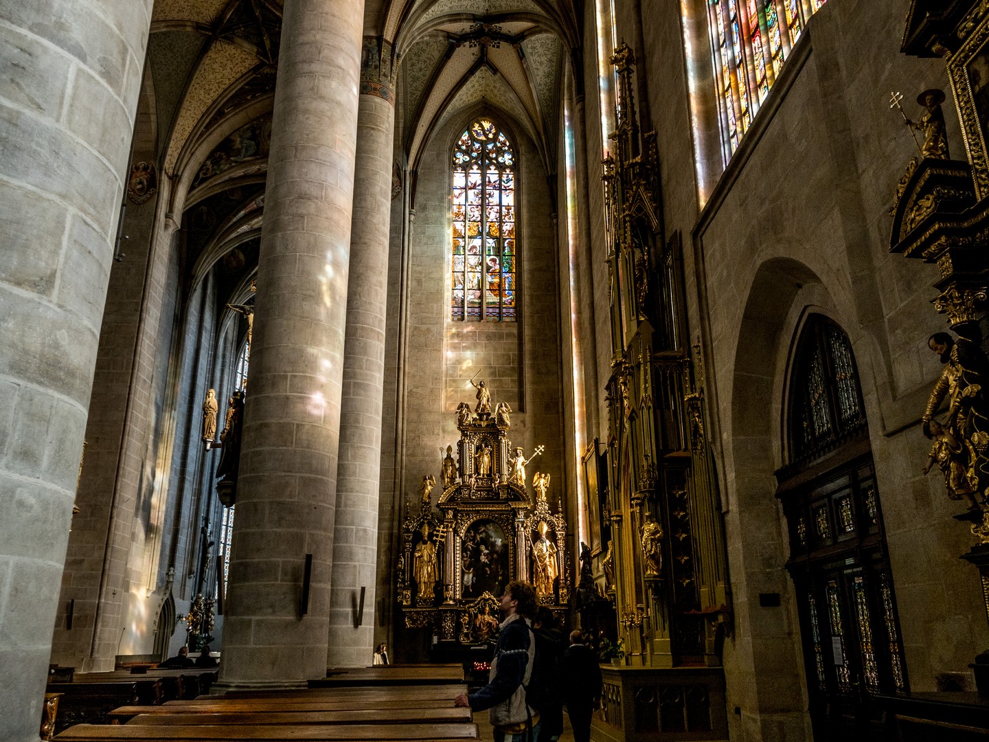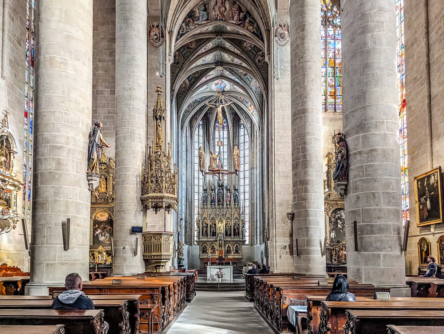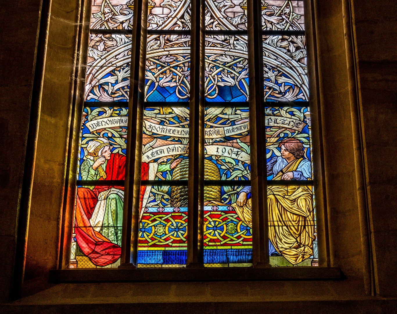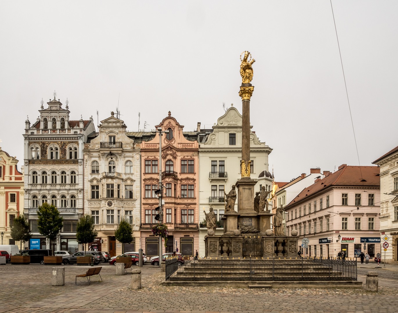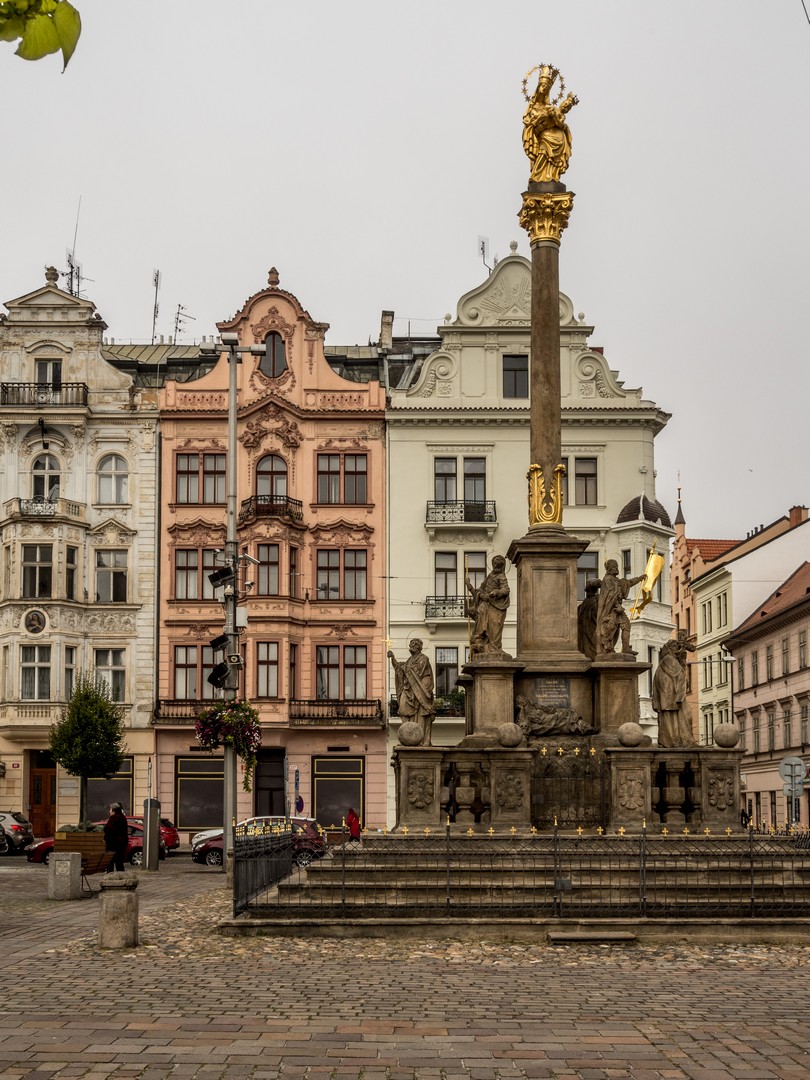 Trônant au milieu de la place, la basilique Saint-Barthélemy, de style gothique, mais au décor intérieur baroque, illustre bien ce mélange d’époques. Parlant de peste, une « colonne de peste » baroque (objet de culte courant dans l’ancien empire autrichien dont la Bohème faisait alors partie) s’élève à deux pas de la cathédrale. Construite en 1680 et dédiée à la Vierge, elle fut élevée en remerciement pour celle qui aurait intercédé auprès de Dieu pour épargner la ville, elle représente Notre-Dame de Pilsen entourée de Saints.