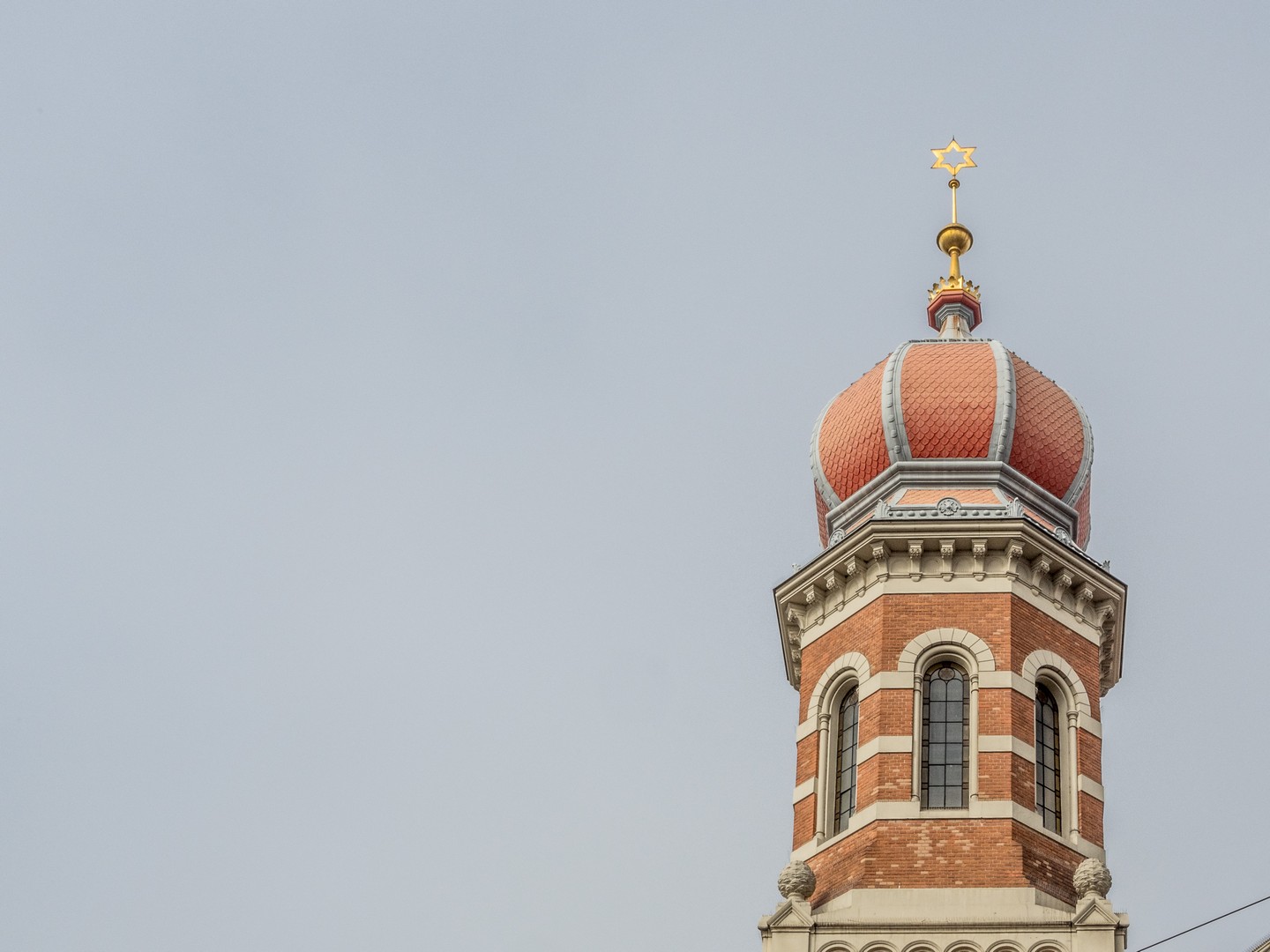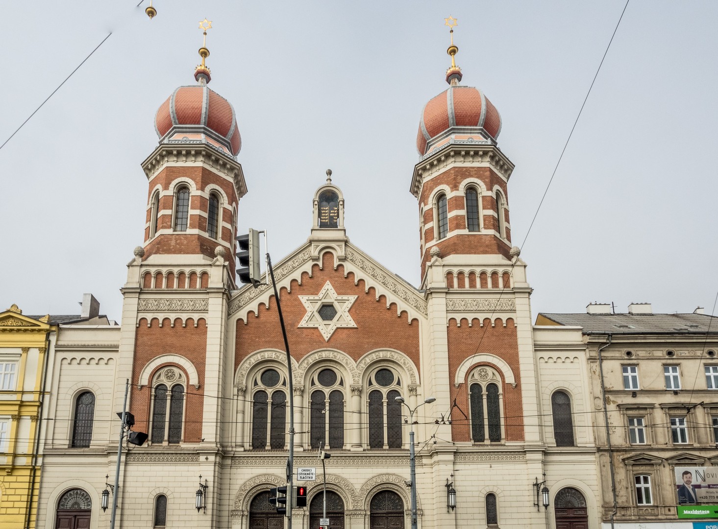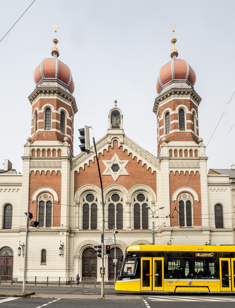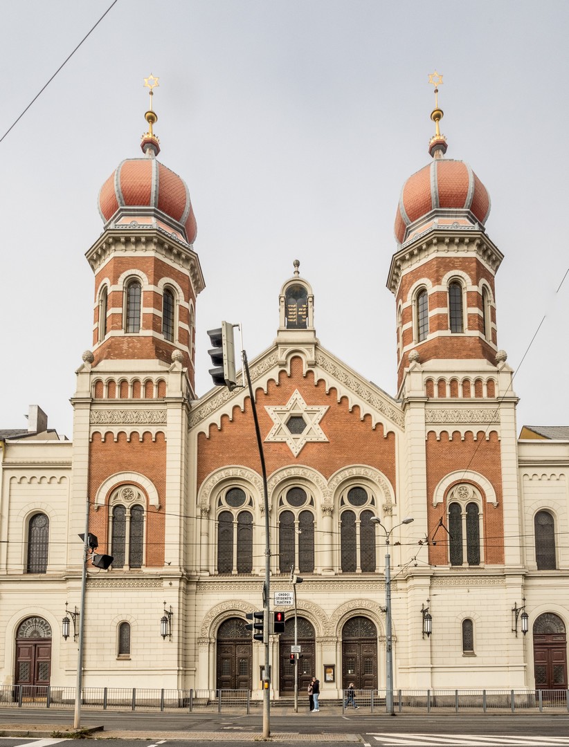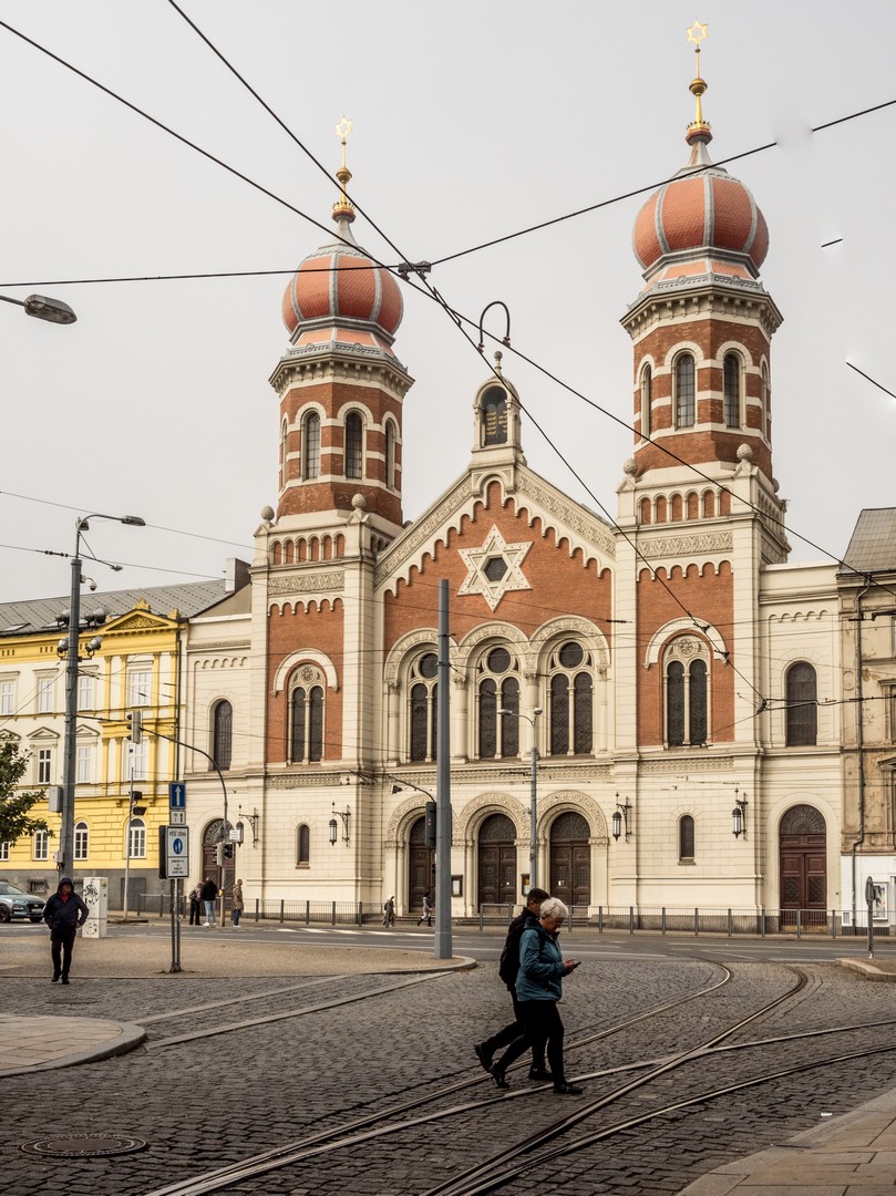 Pilsen comptait, jusqu’à la Seconde Guerre mondiale, une importante communauté juive, très active dans l’économie locale. La Grande Synagogue, peinte en rose, témoigne encore de cette présence. Aujourd’hui, il ne resterait qu’envrion deux cents personnes de confession juive à Pilsen, trop peu pour faire vivre ce monument à son plein potentiel mais elle continue d’être un lieu de culte et organise aussi des activités culturelles.