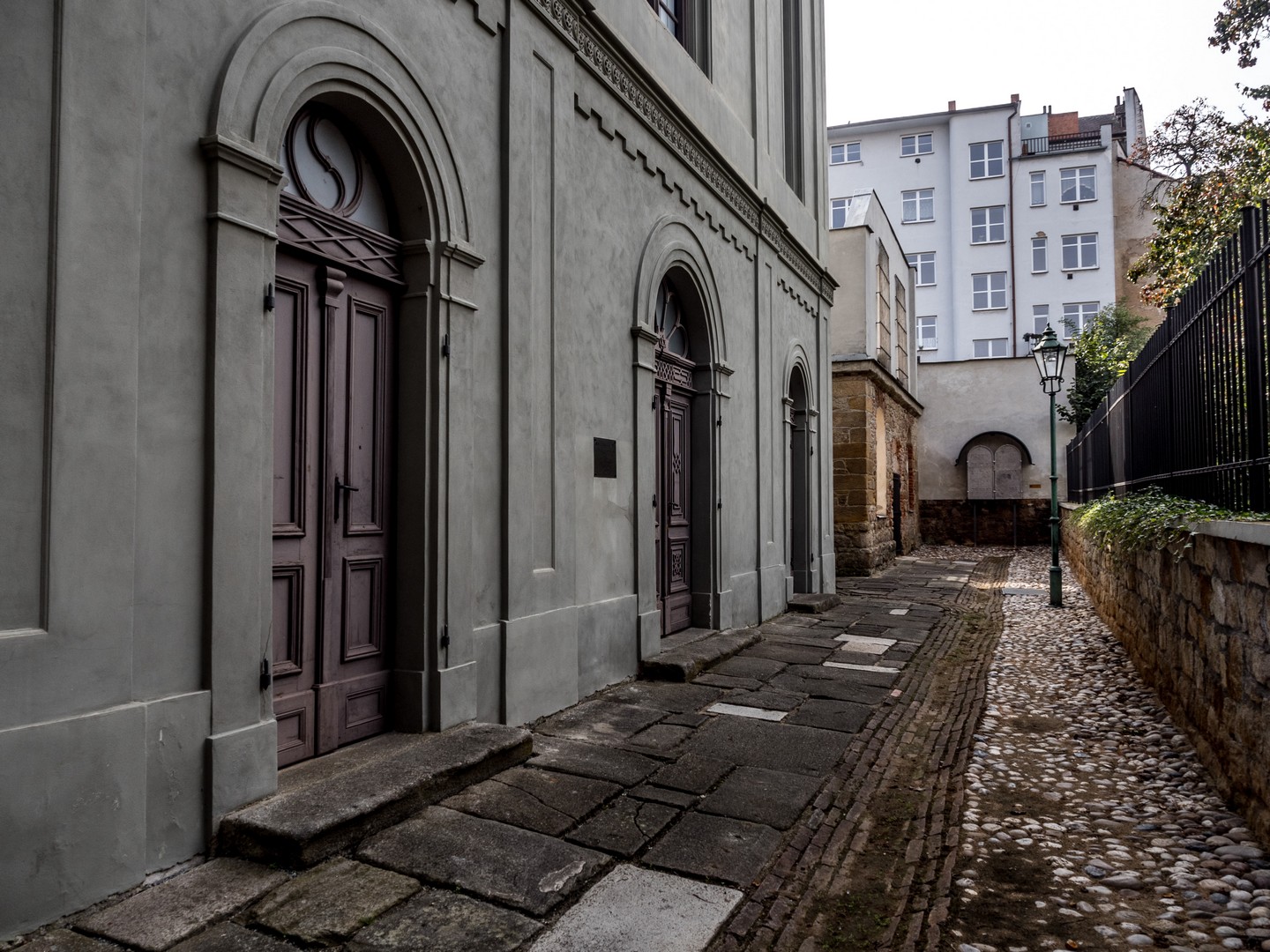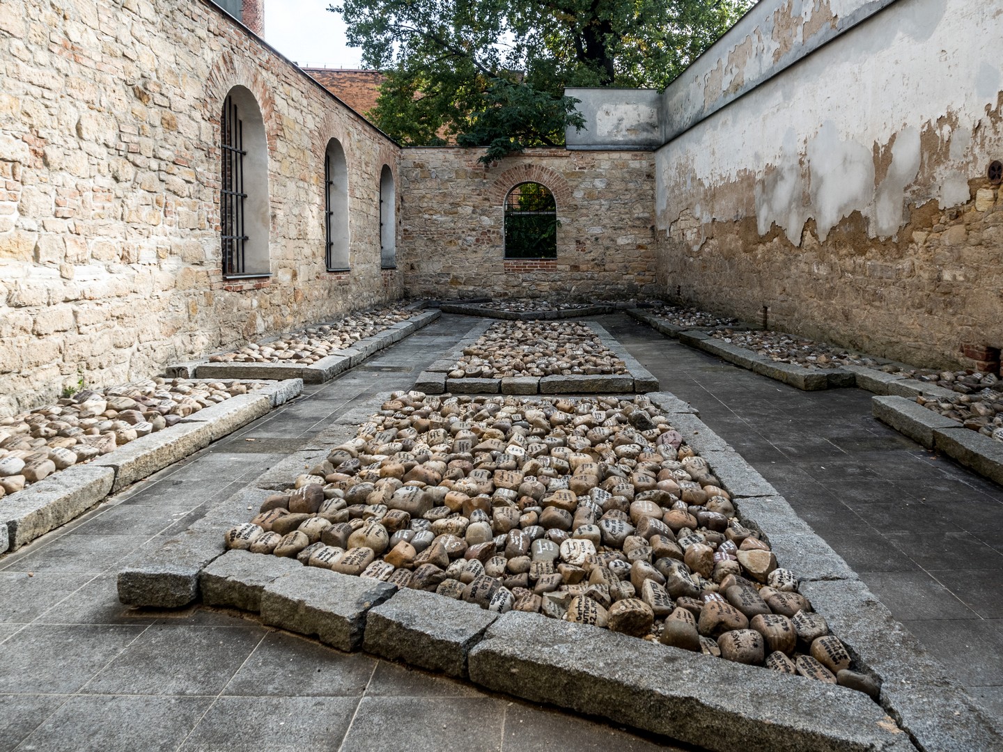 En continuant vers le superbe Grand Théâtre, bâti dans le goût des grandes scènes françaises, on tombe sur l’Ancienne Synagogue. Enfin, “tomber” est un grand mot : elle se cache derrière une façade d’immeuble ! C’est en remarquant une arche et un petit tunnel avec une publicité pour des cours d’hébreu que j’ai compris que j’avais trouvé ce que je cherchais, après plusieurs minutes à faire des aller-retours dans la rue. Dans une petite cour, on découvre la synagogue, modeste, et les ruines d’un bâtiment annexe transformé en jardin du souvenir, parsemé de pierres blanches gravées de noms et de dates. Coïncidence : ma visite a lieu le jour de Yom Kippour.