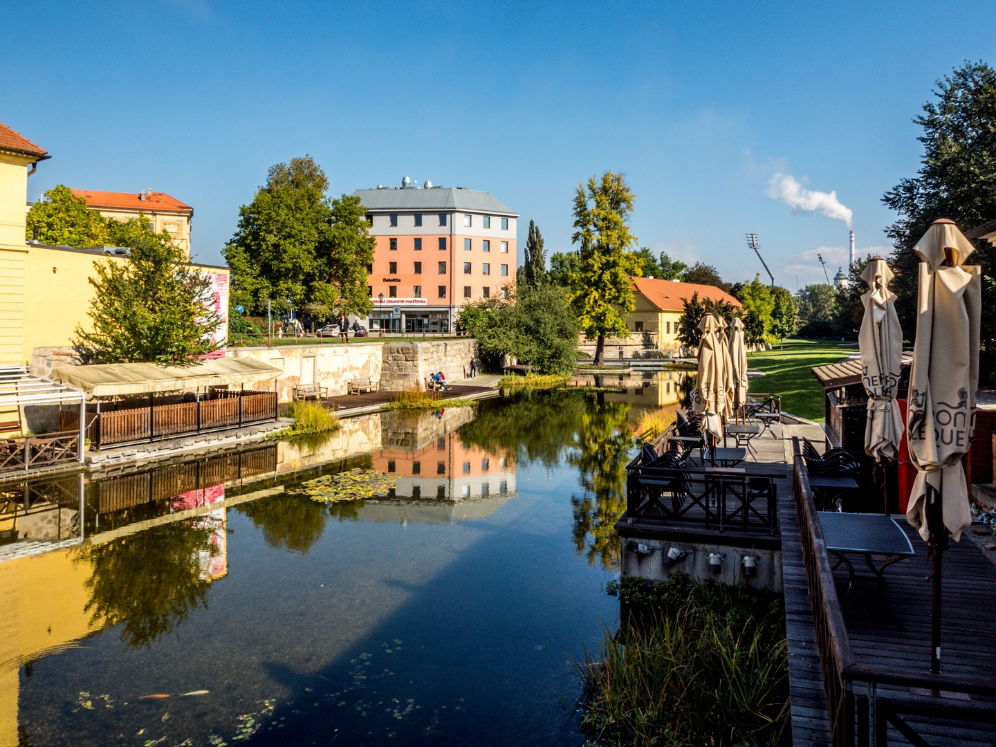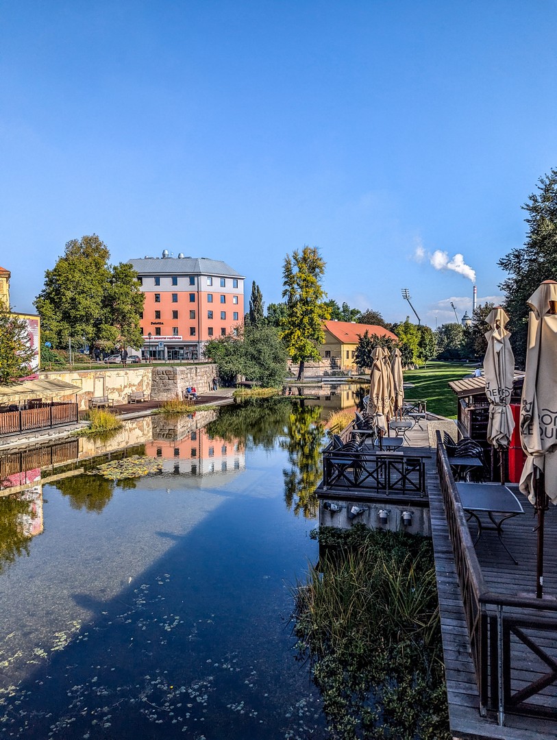 J’aurais pu poursuivre le long du Circuit des jardins et serais arrivée au même point : le Moulin de la source (Mlýnská strouha), l’un des coins les plus bucoliques et romantiques de Pilsen. Surnommé « la Venise de Pilsen », le lieu s’organise autour d’un étang — ancien bras de la rivière — bordé d’un parc, d’un pont élégant enjambant l’eau et d’un petit café à la charmante terrasse (Strouha – coffee & wine & spirits) qui me fait de l’œil. L’endroit rêvé pour un pique-nique au soleil ! Pas de chance : je n’ai que dix minutes pour rejoindre le lobby de l’hôtel et commencer le programme du jour !