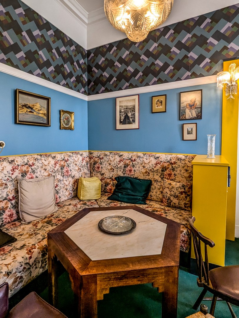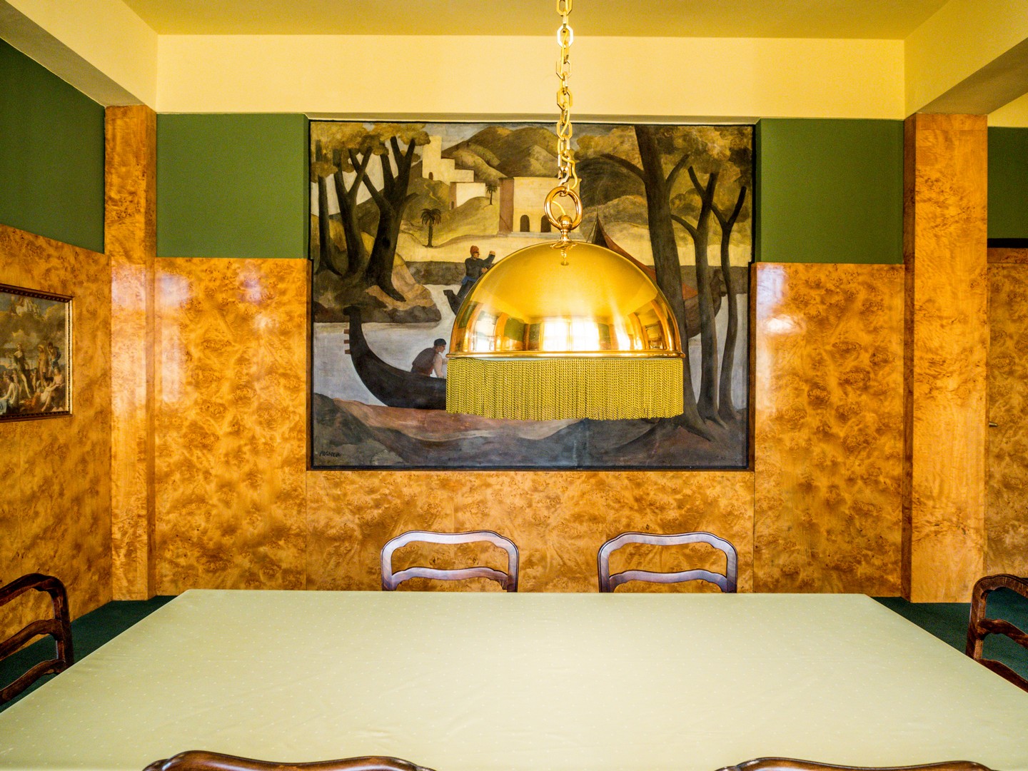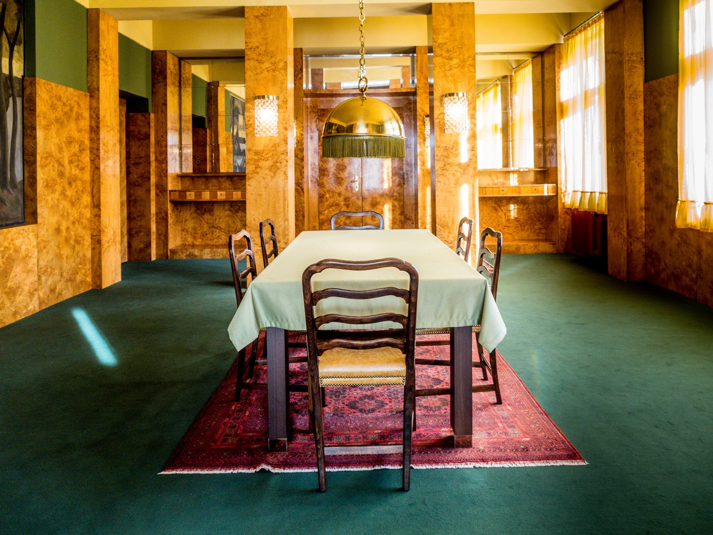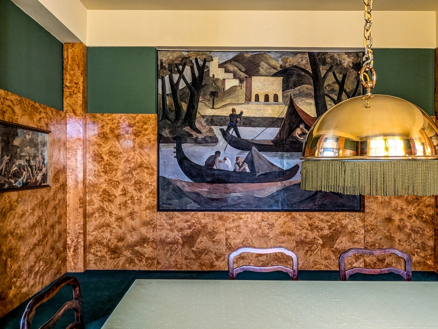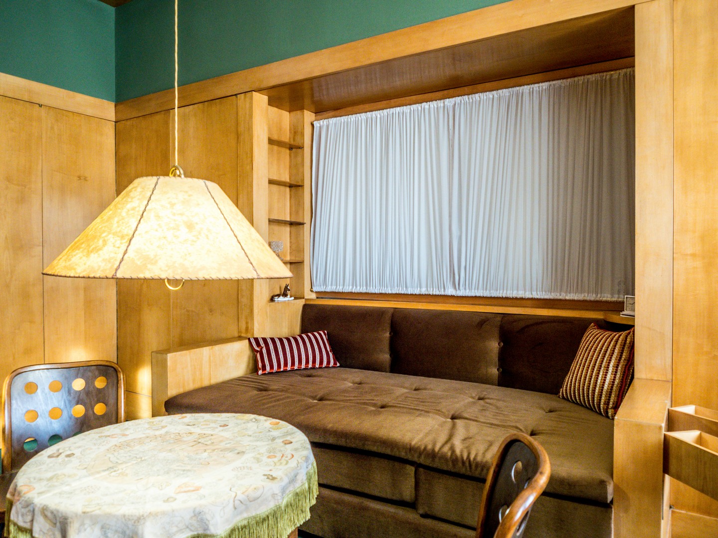 Dans la salle à manger, baignée d’une lumière dorée, j’ai un flash : cela rappelle le Style Prairie de l’architecte de Chicago Frank Lloyd Wright – mêmes lignes droites, horizontales et verticales (même si Wright ne dédaignait pas les ornements, souvent peints au pochoir). Ce parallèle n’a rien d’étonnant : ils furent contemporains.