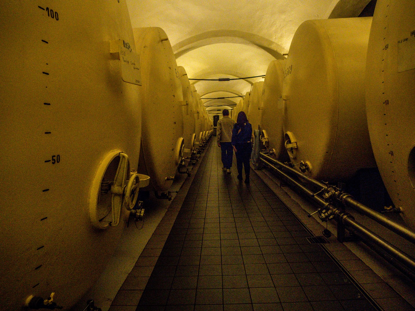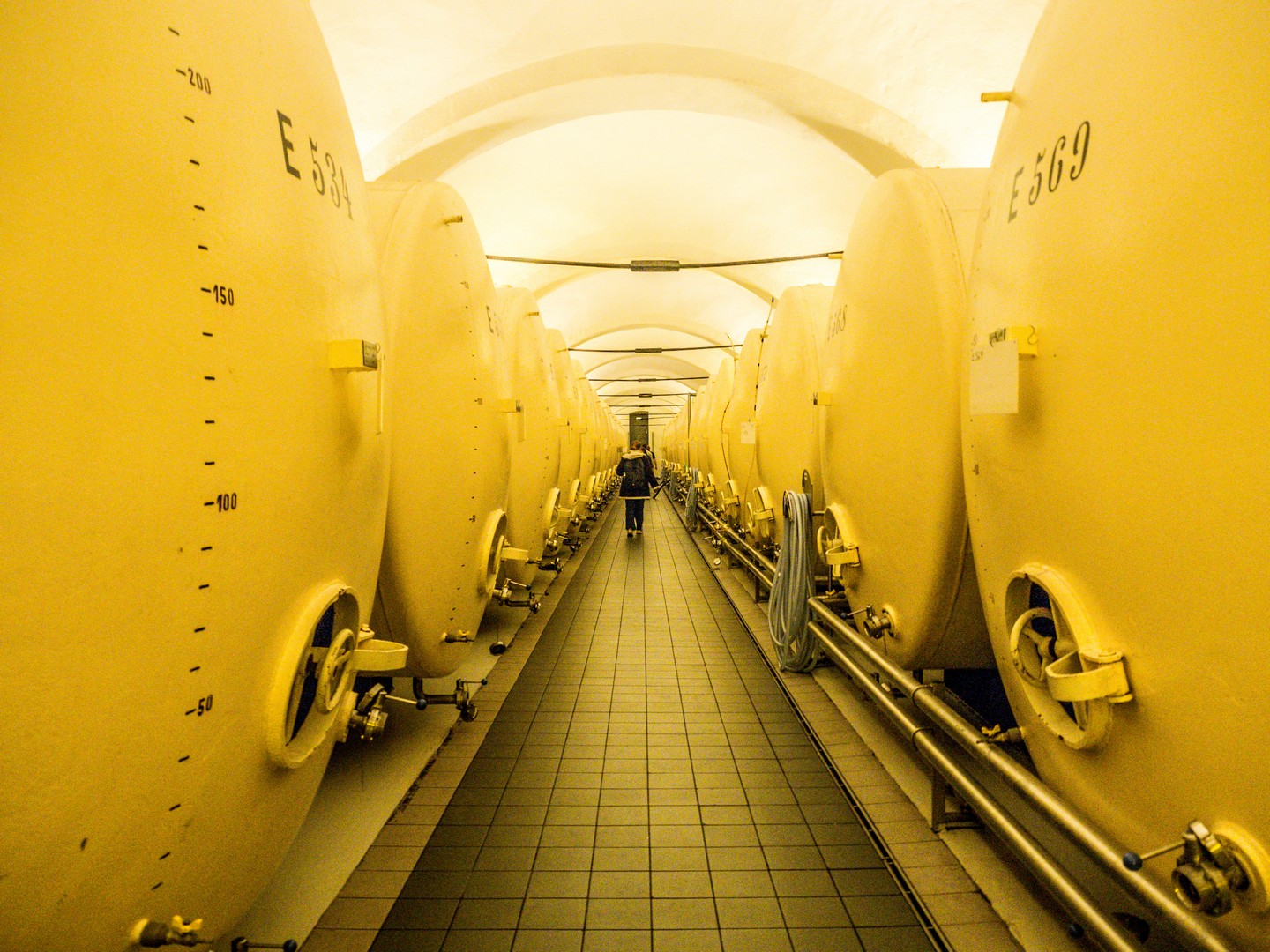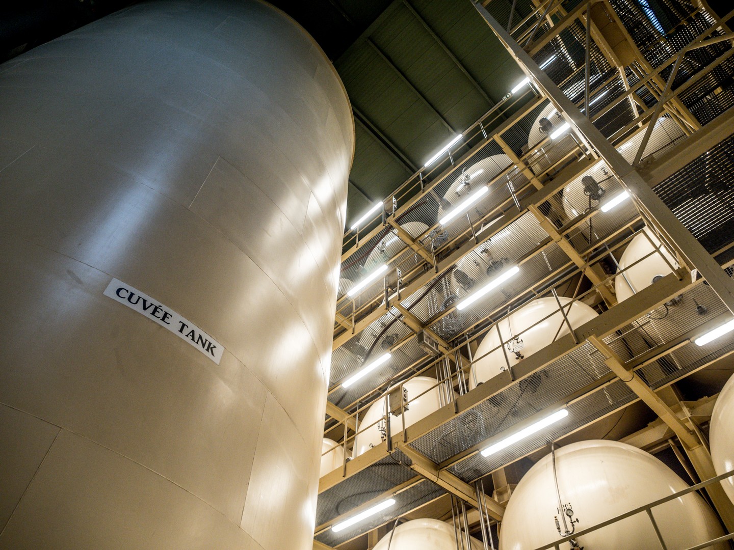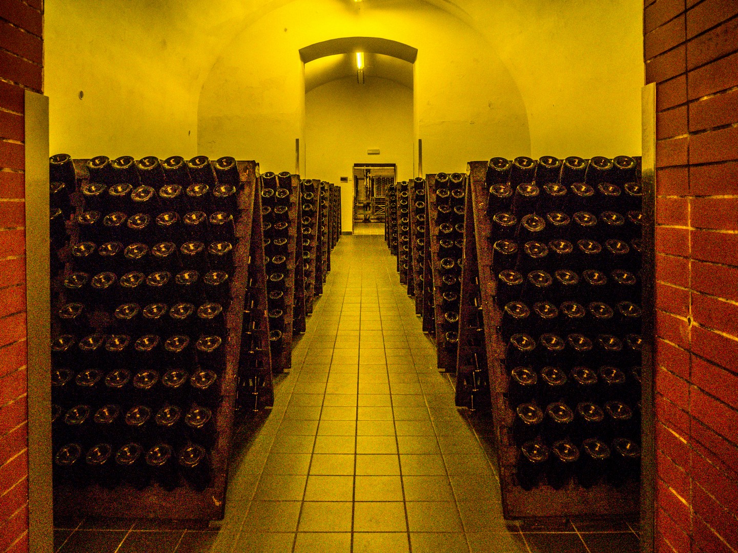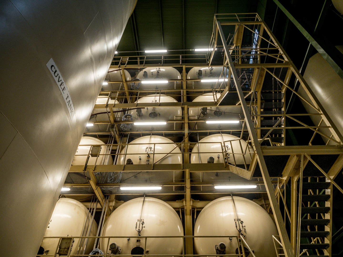 Moi qui connais plutôt les petites caves, j’ai ici constaté qu’il s’agit d’un processus quasi industriel : les pupitres traditionnels côtoient les gyropalettes… Dans des caves baignées d’une lumière jaune (paraît-il que ça aide), le vin repose tranquillement.