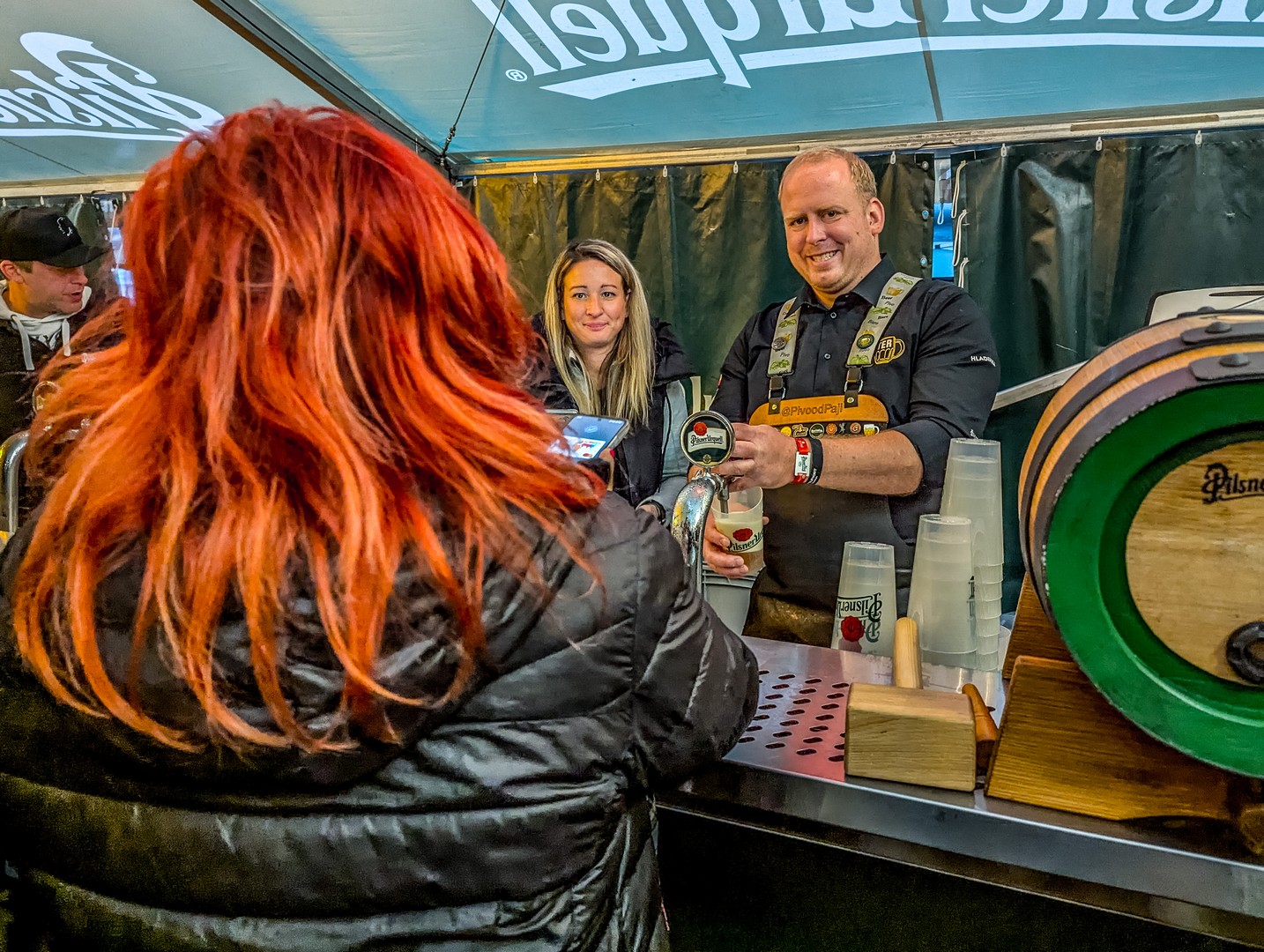 Tout autour de la place, des tentes portent le nom des continents où la pils est commercialisée (tous, sauf l’Antarctique), et sur des écrans géants sont diffusés des messages venus des quatre coins du monde : des patrons de bars déclarant leur amour à la pils. Partout, l’Urquell coule à flot dans une ambiance joyeuse, les barmen jouant de la tireuse sans discontinuer !