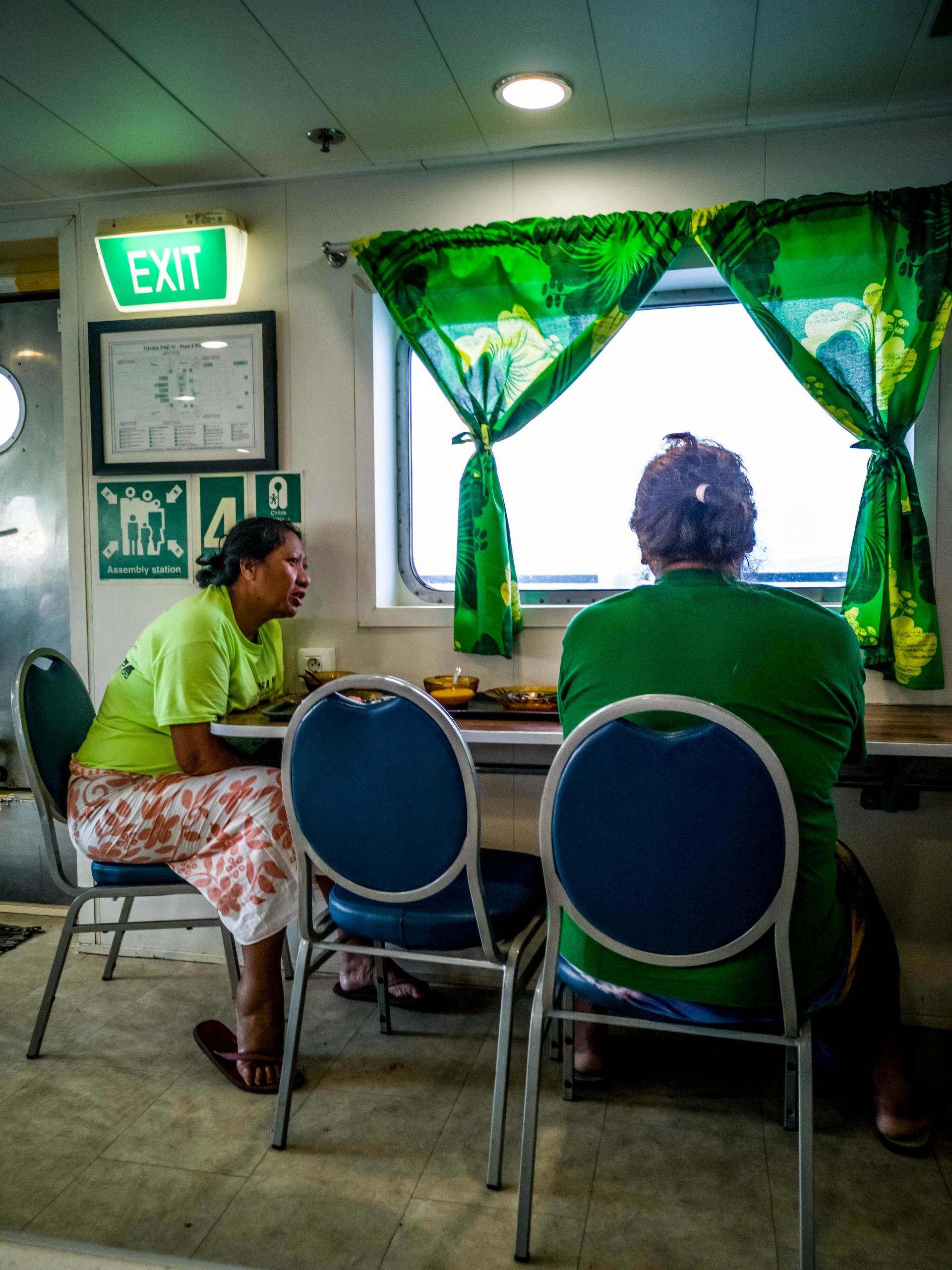 Pendant que l’équipage s’affaire, les passagers eux, somnolent comme moi ou lisent. Il n’y a que Mamie Odette, qui vient de Rapa, qui s’occupe en tressant des fleurs en feuilles de pandanus séchées et deux petites filles qui jouent dans le dortoir. Tout le monde essaie de faire en sorte que la journée passe plus vite en dormant. Je ne verrais même pas l’unique autre Européen. Il dort en cabine et doit sans doute soigner un mal de mer puisqu’il était invisible à l’heure des repas.