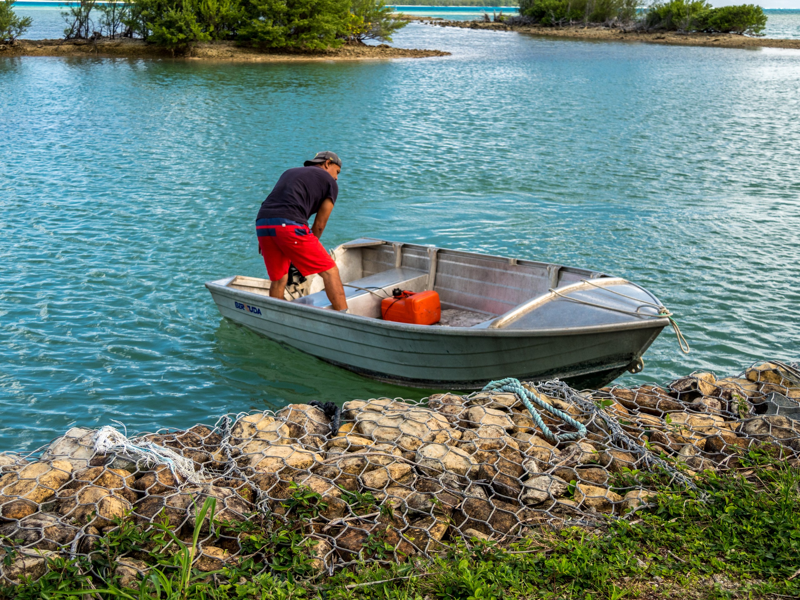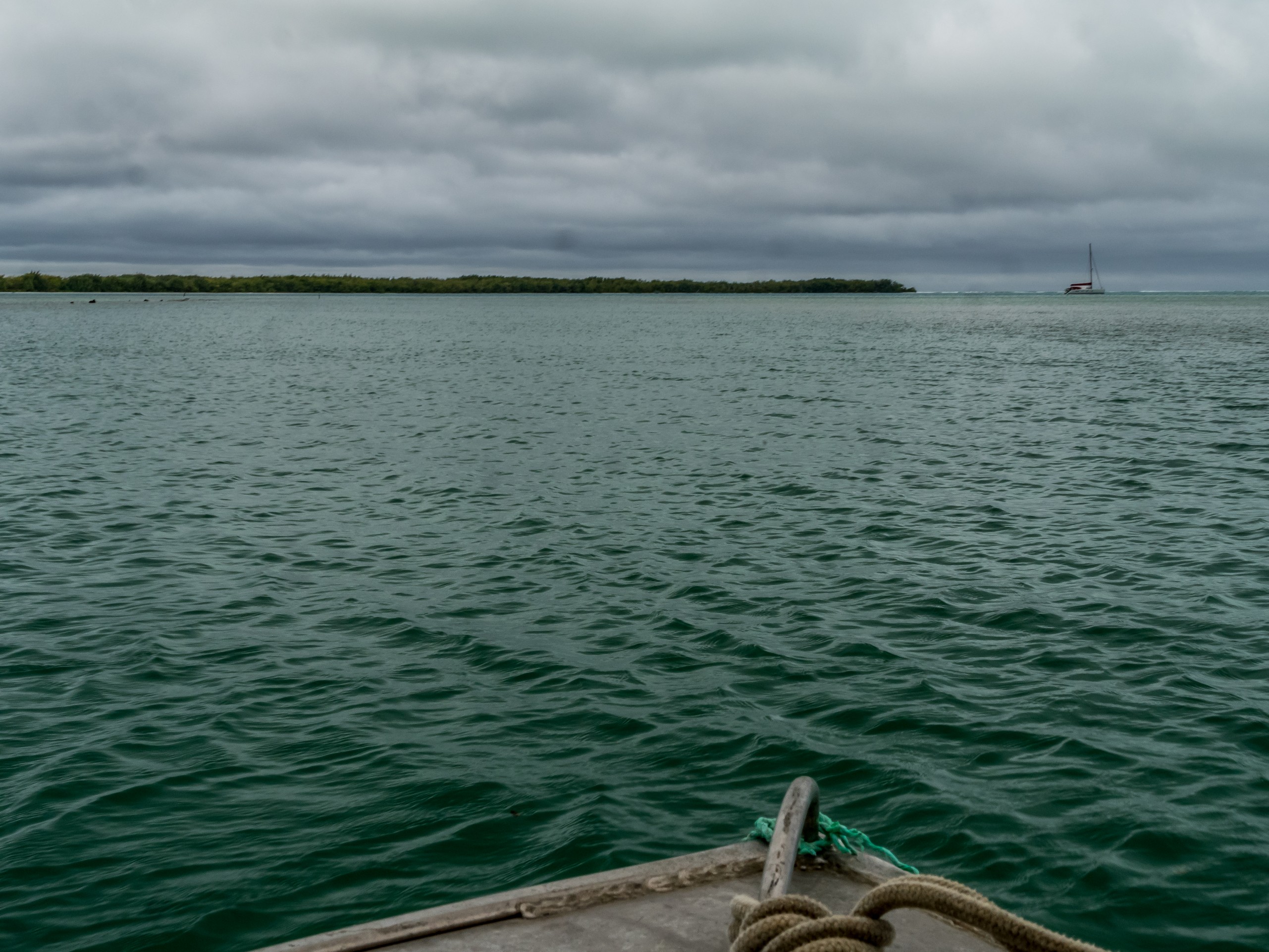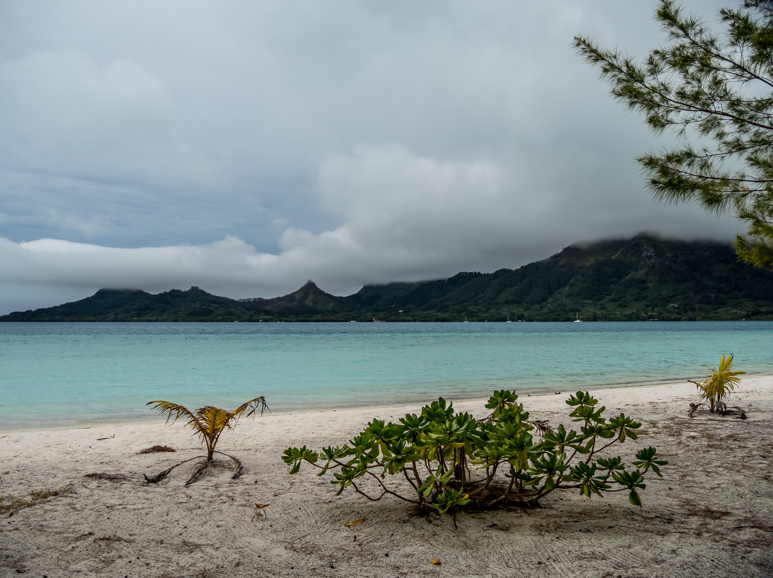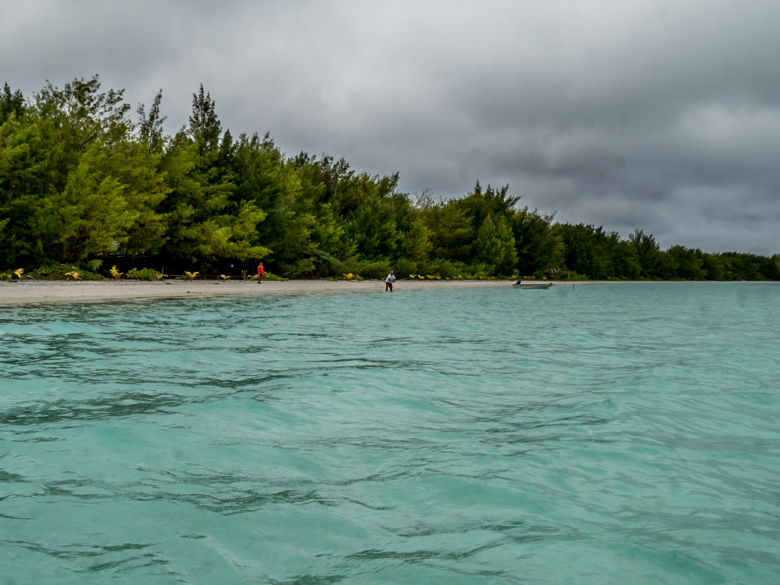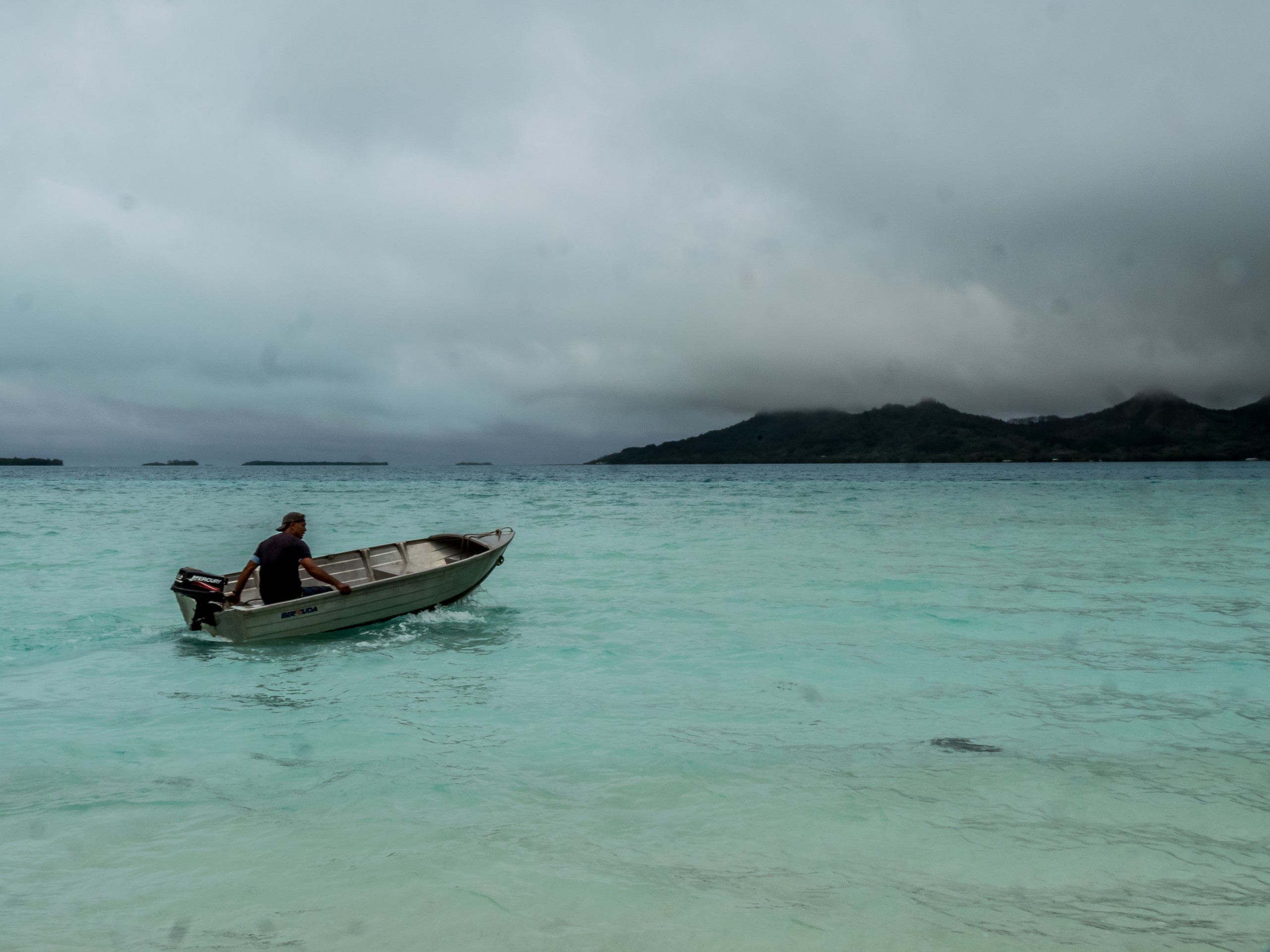 Avec moi sur le motu, un couple qui vient de Tahiti et leur petit bébé et une mère et son fils qui voyagent ensemble. Claire, la maman, vient de Nice et elle profite de ses vacances pour retrouver son fiston Félix, chef cuisinier en Nouvelle-Zélande, et à Wanaka de surcroît. Il n’en faut plus pour briser la glace et lancer une longue conversation pendant que le vent se déchaîne et la pluie s’abat dehors. Patrick et Irène ne sont pas en reste non plus et nous parlent un peu de leur vie. Bien à l’abri des éléments, l’ambiance me fait penser à un petit refuge de montagne ! Vu la météo, on vient nous chercher plus tôt et c’est à la fois enchantée de ma journée à échanger, mais dépitée de ne pas avoir profité des beautés du motu à son plein potentiel.
