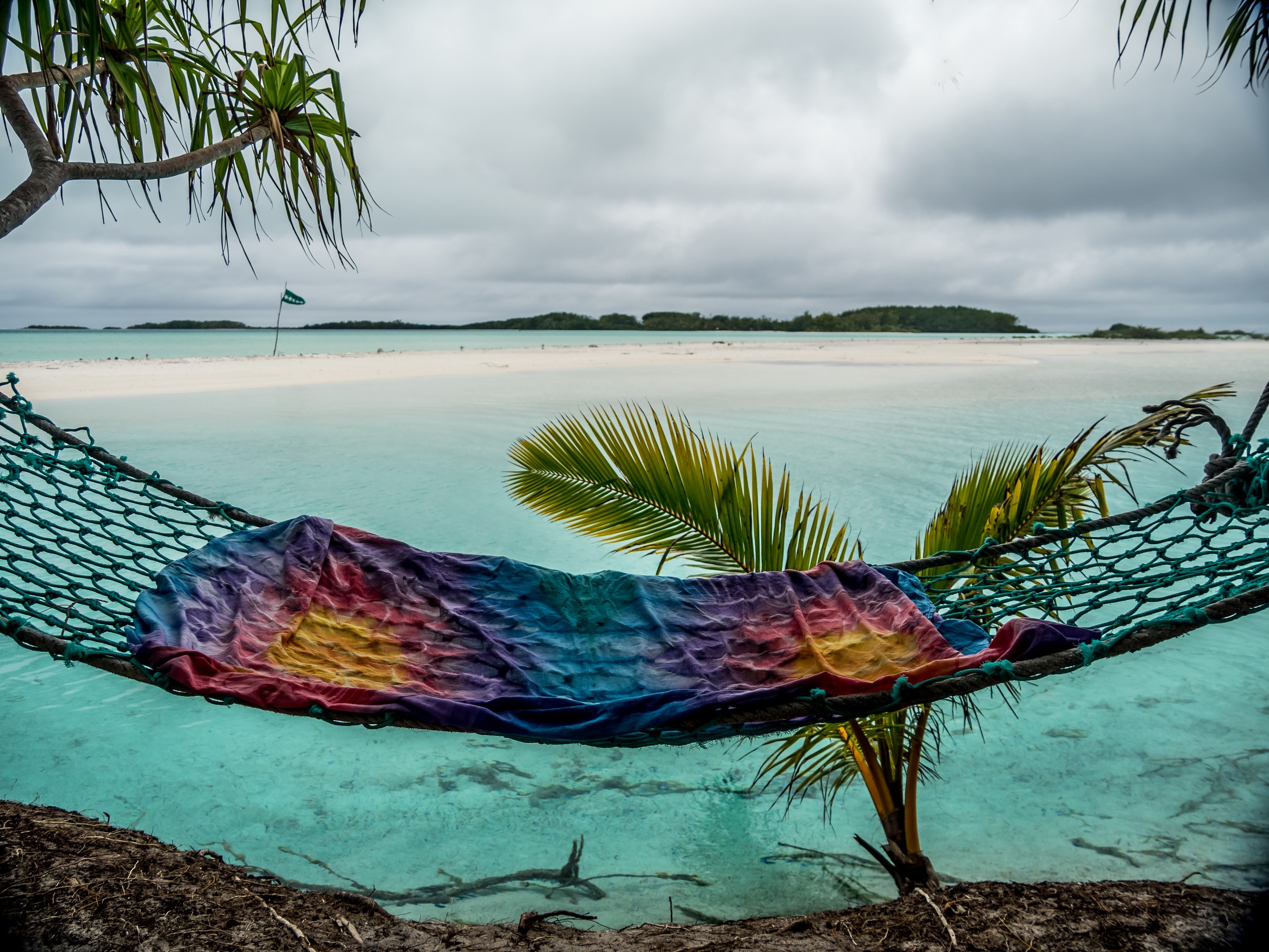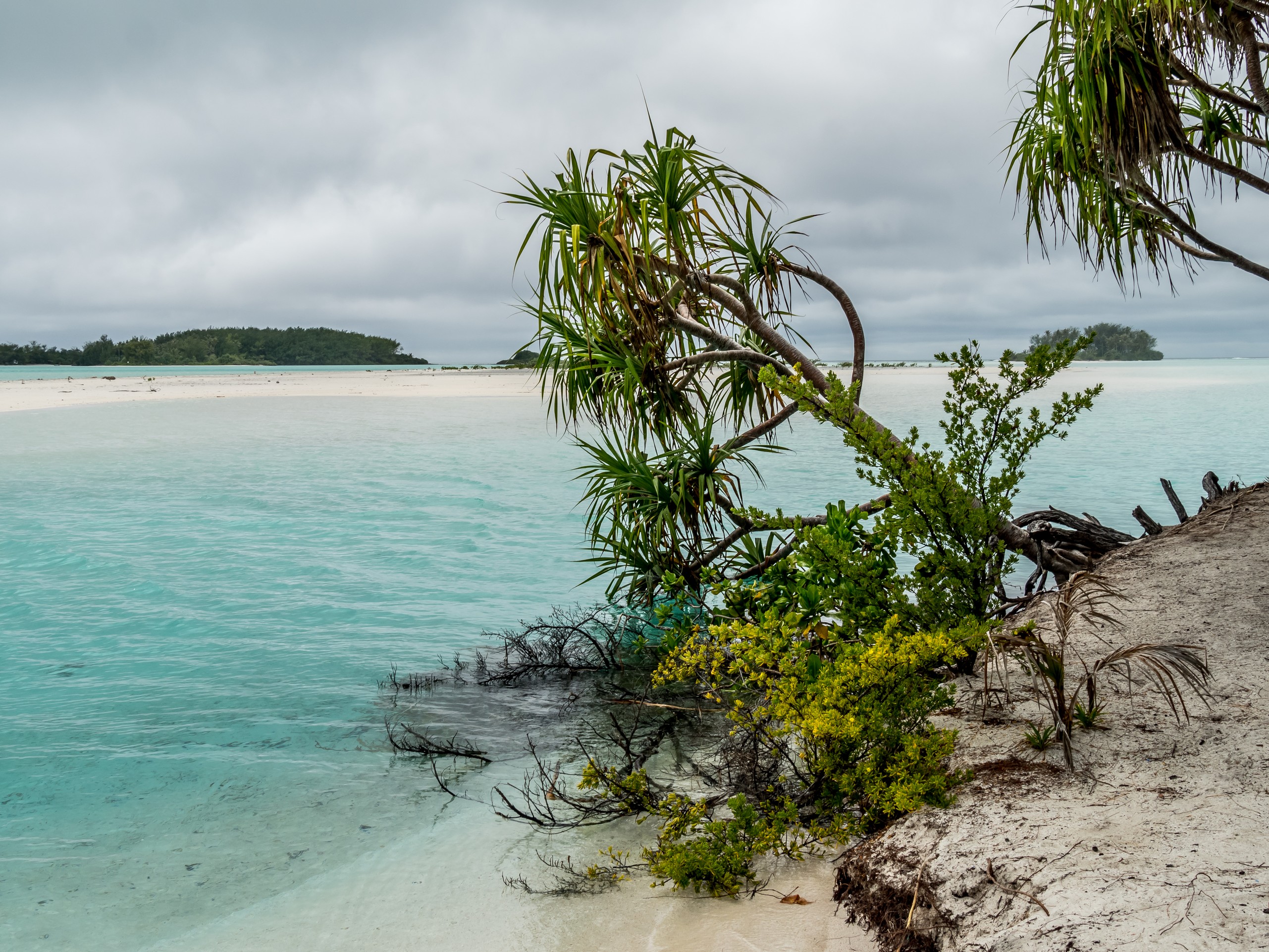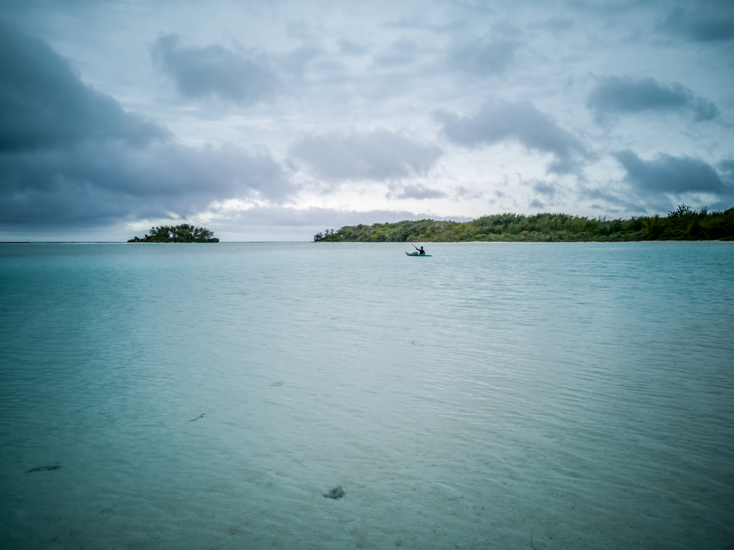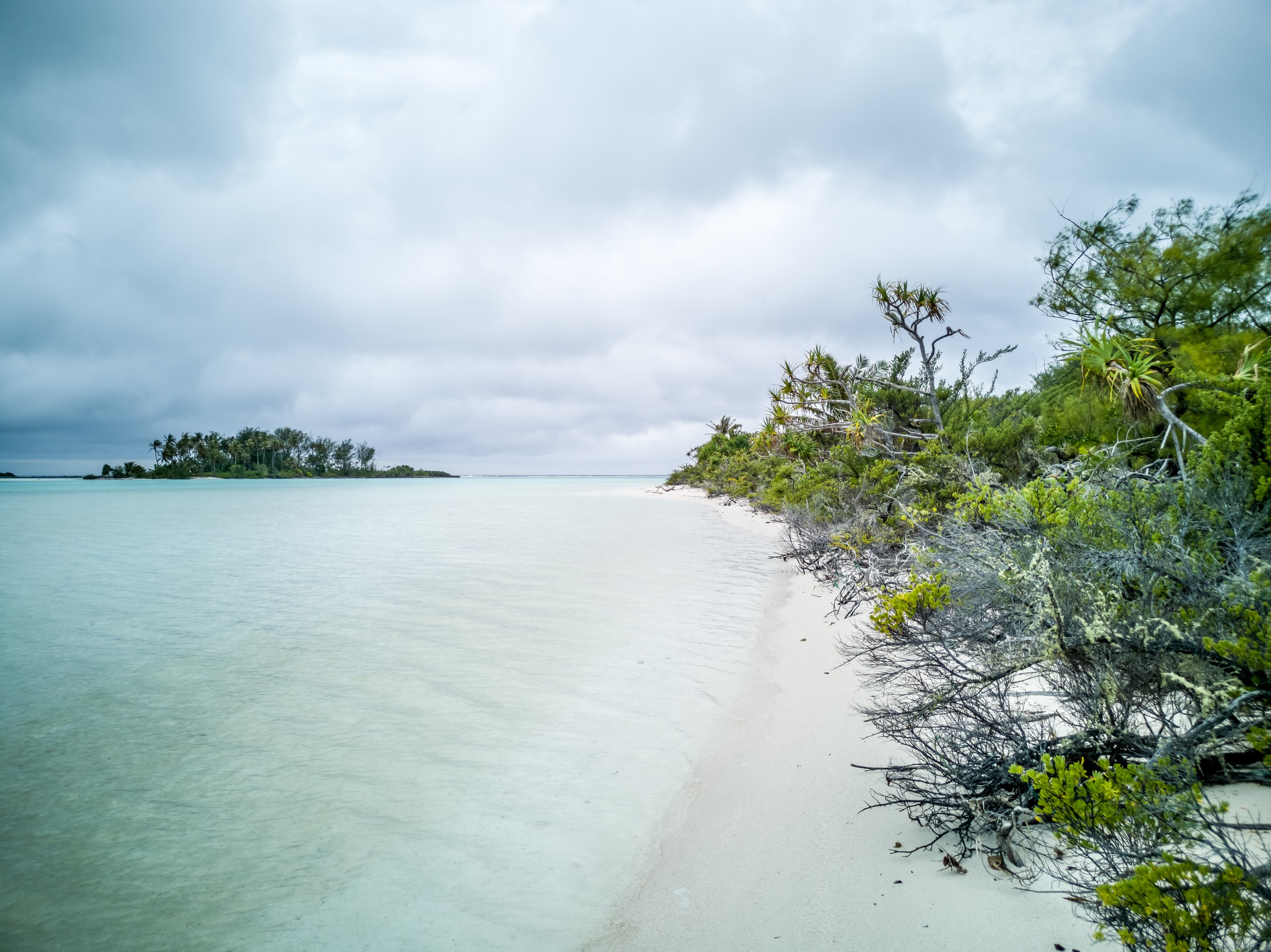 Même sous ciel gris, le lagon de Raivavae garde des couleurs intenses de menthe à l’eau, de turquoise et de bleu marine. Ça tient presque de l’ensorcellement ! Il y a évidemment la fameuse piscine qui donne son surnom au motu : un petit espace d’eau contenu entre le motu et un banc de sable, du même turquoise que les carrelages d’une piscine. Il s’agrandit et se rétrécit au fur et à mesure des marées, révélant d’autres couleurs et permettant au visiteur d’y passer sans perdre pied. N’espérez pas y voir beaucoup de poissons par contre. Il n’y a qu’une seule patate de corail fréquentée par quelques bestioles à nageoires. Les racines des arbres qui plongent dans l’eau sont aussi quelques abris de choix mais pour en trouver plus, il faudra aller jusqu’à la pointe du motu, là où gronde l’océan.