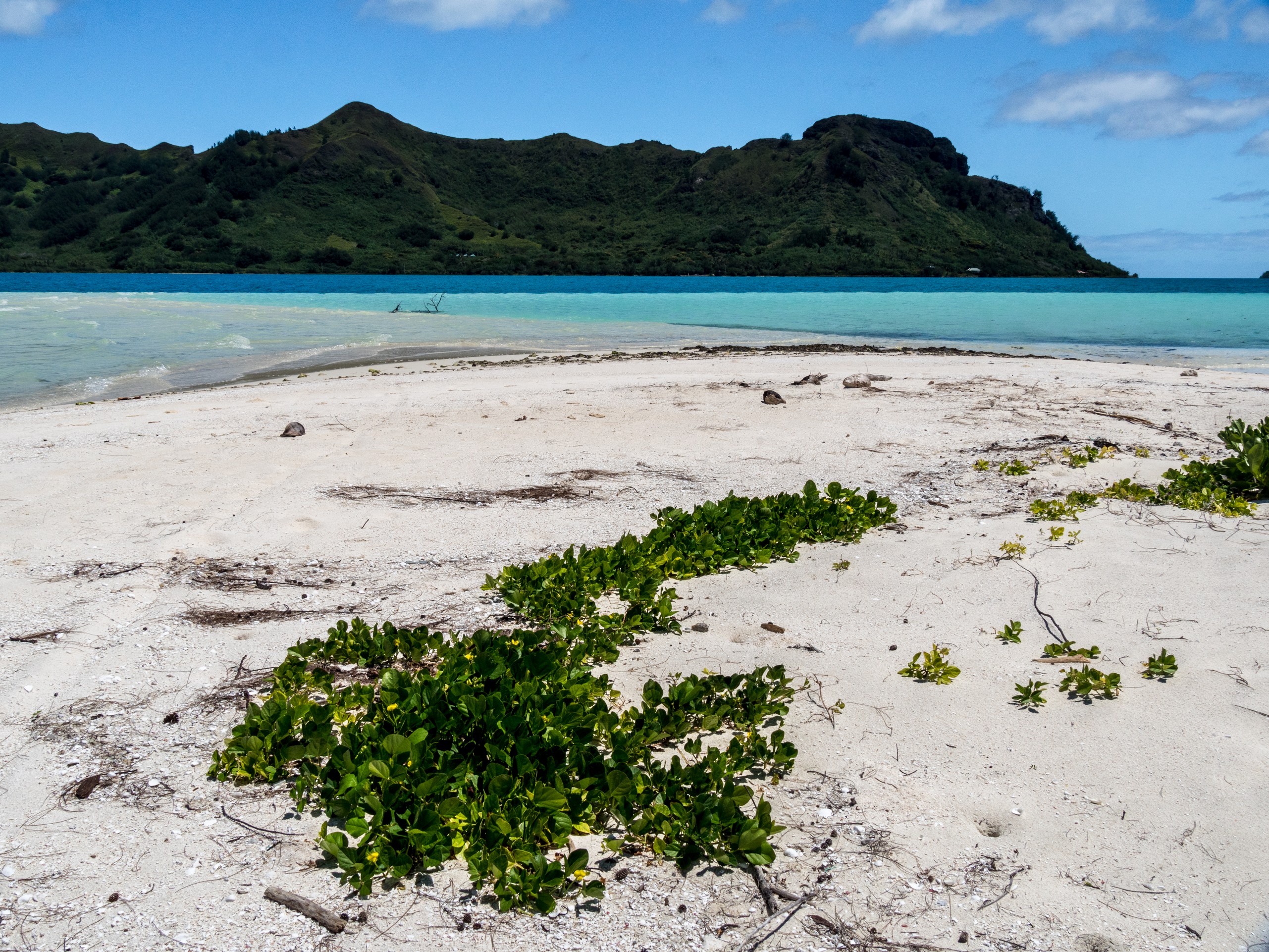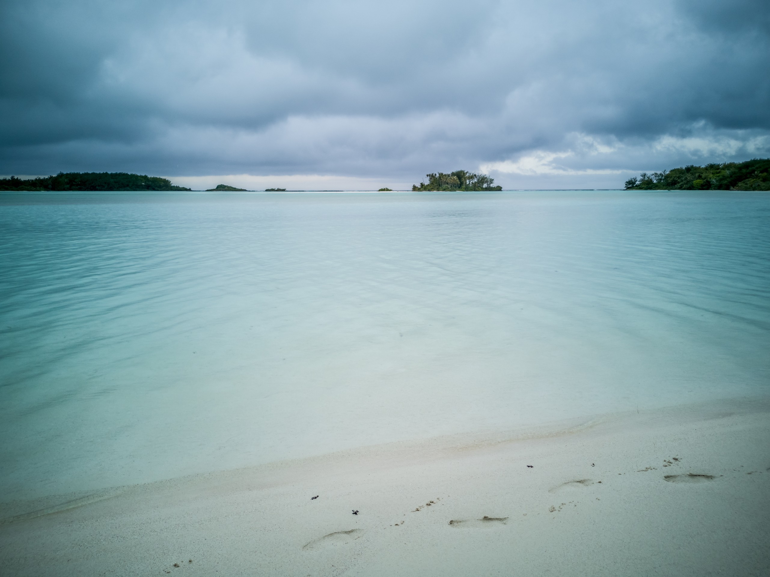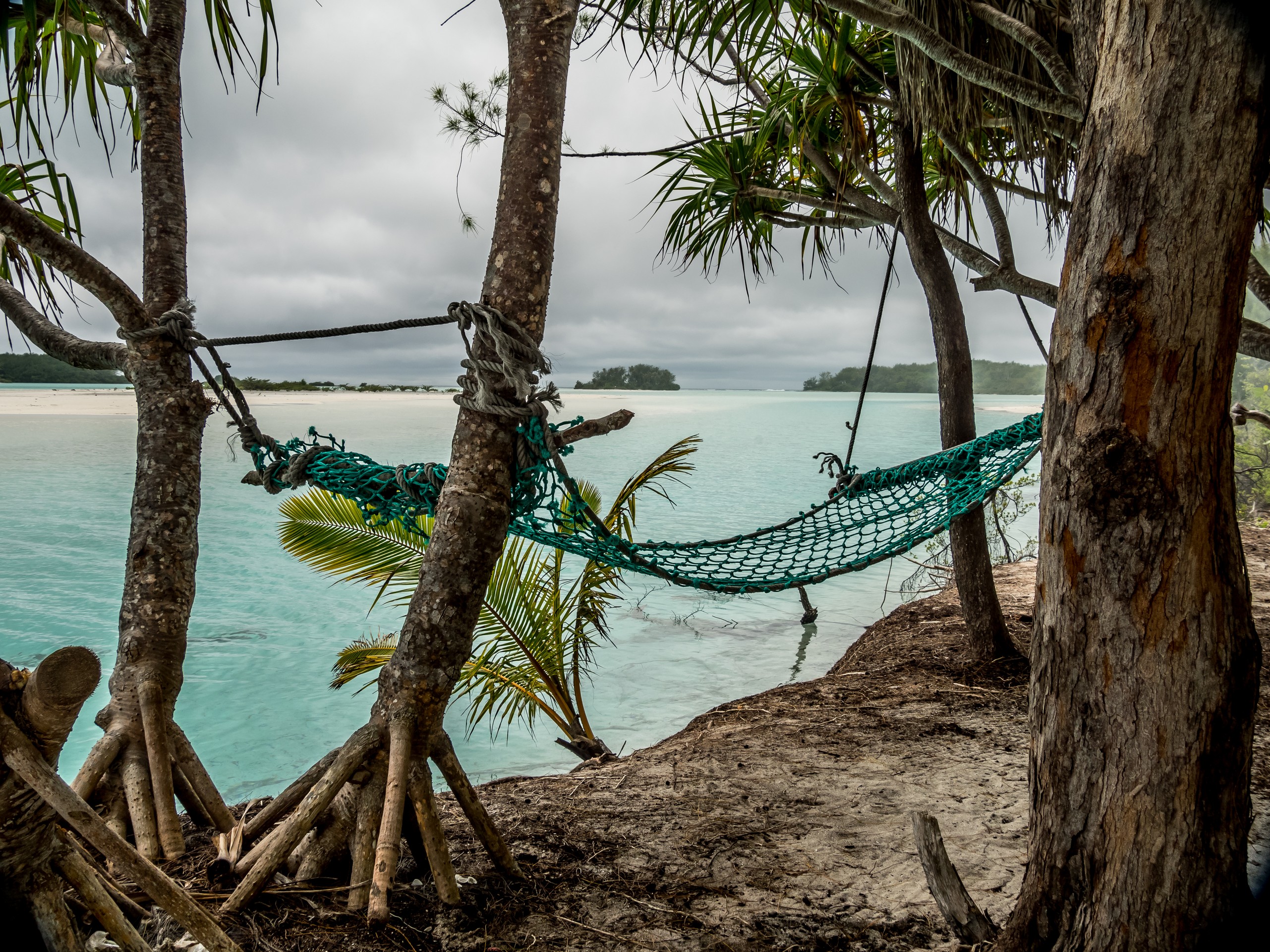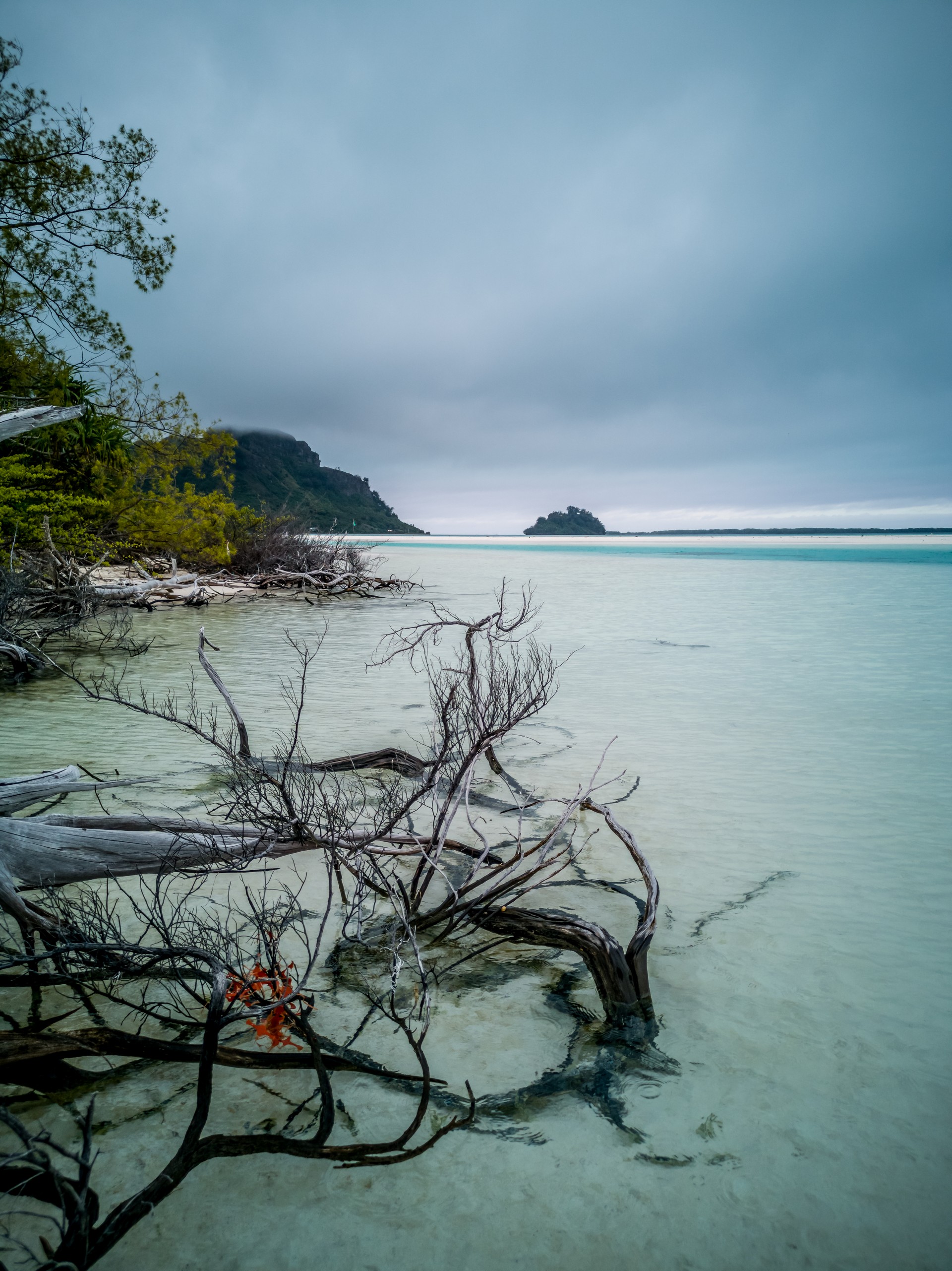 Même sous ciel gris, le lagon de Raivavae garde des couleurs intenses de menthe à l’eau, de turquoise et de bleu marine. Ça tient presque de l’ensorcellement ! Il y a évidemment la fameuse piscine qui donne son surnom au motu : un petit espace d’eau contenu entre le motu et un banc de sable, du même turquoise que les carrelages d’une piscine. Il s’agrandit et se rétrécit au fur et à mesure des marées, révélant d’autres couleurs et permettant au visiteur d’y passer sans perdre pied. N’espérez pas y voir beaucoup de poissons par contre. Il n’y a qu’une seule patate de corail fréquentée par quelques bestioles à nageoires. Les racines des arbres qui plongent dans l’eau sont aussi quelques abris de choix mais pour en trouver plus, il faudra aller jusqu’à la pointe du motu, là où gronde l’océan.