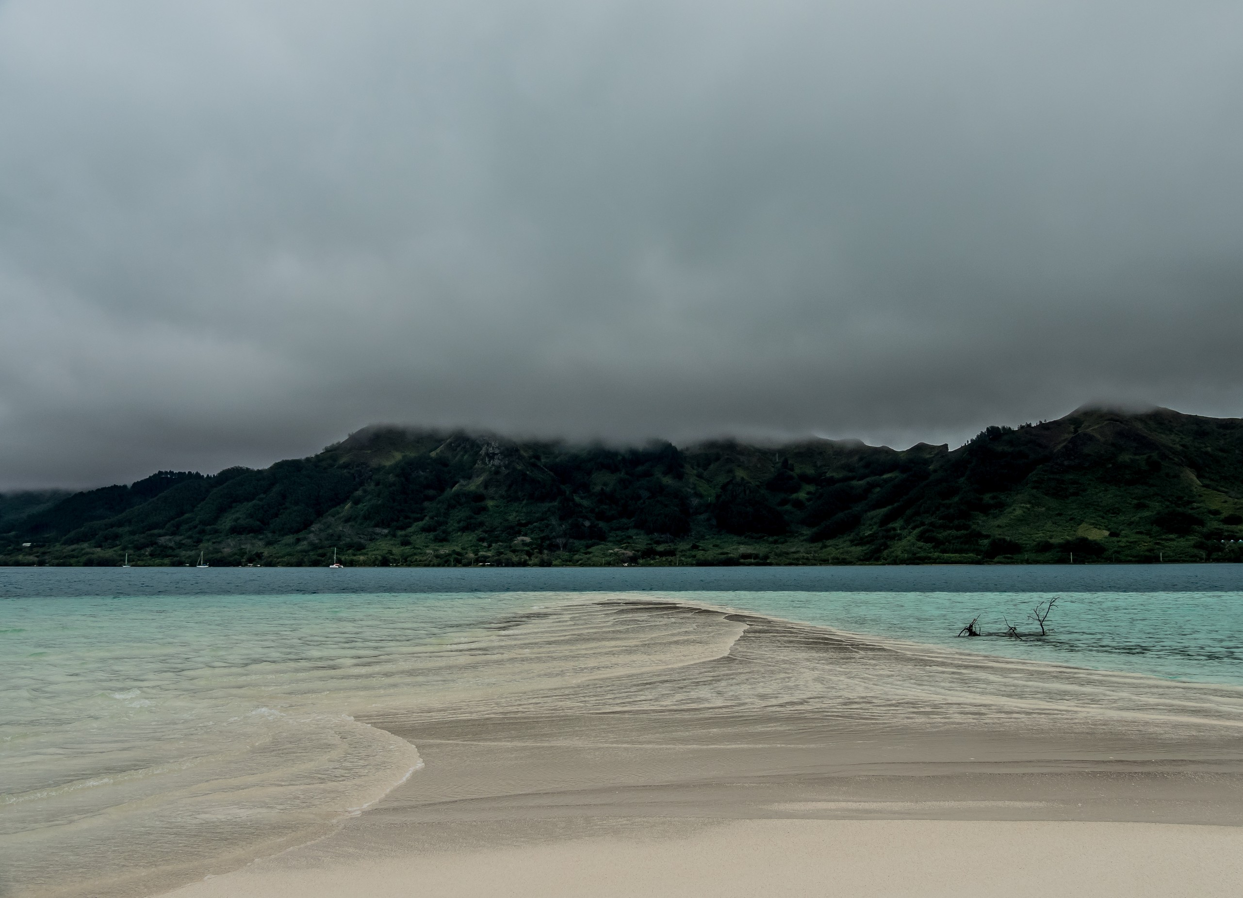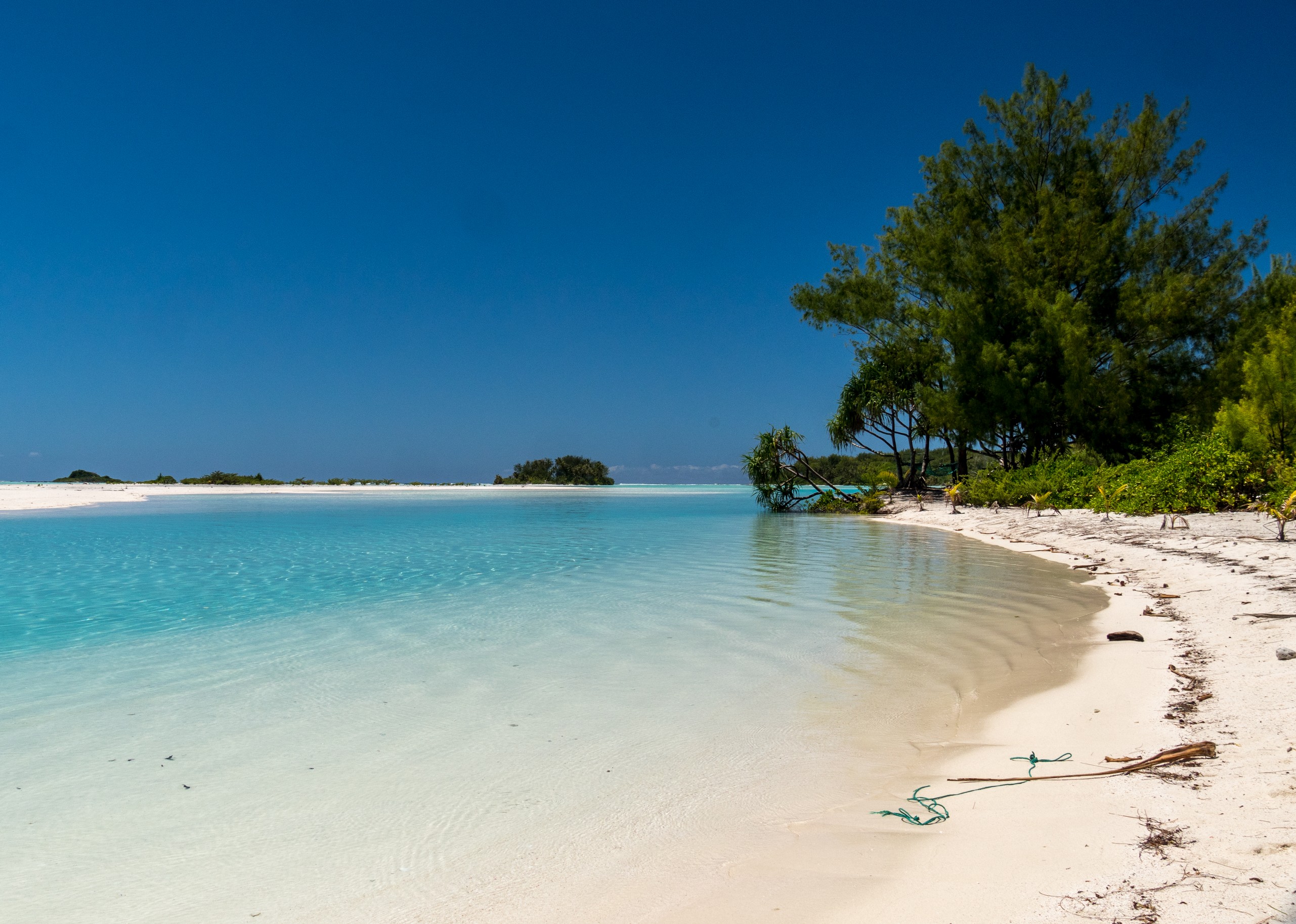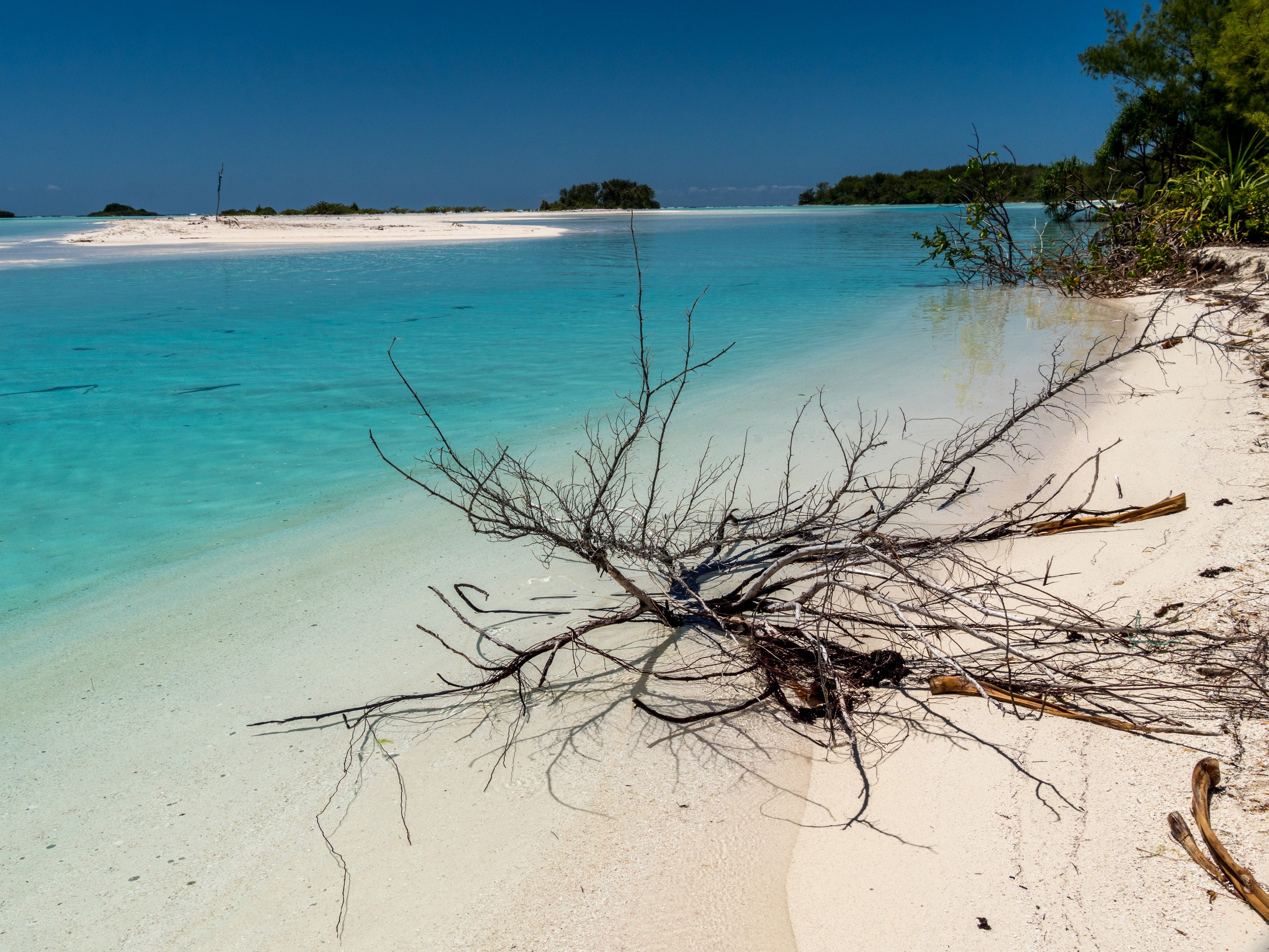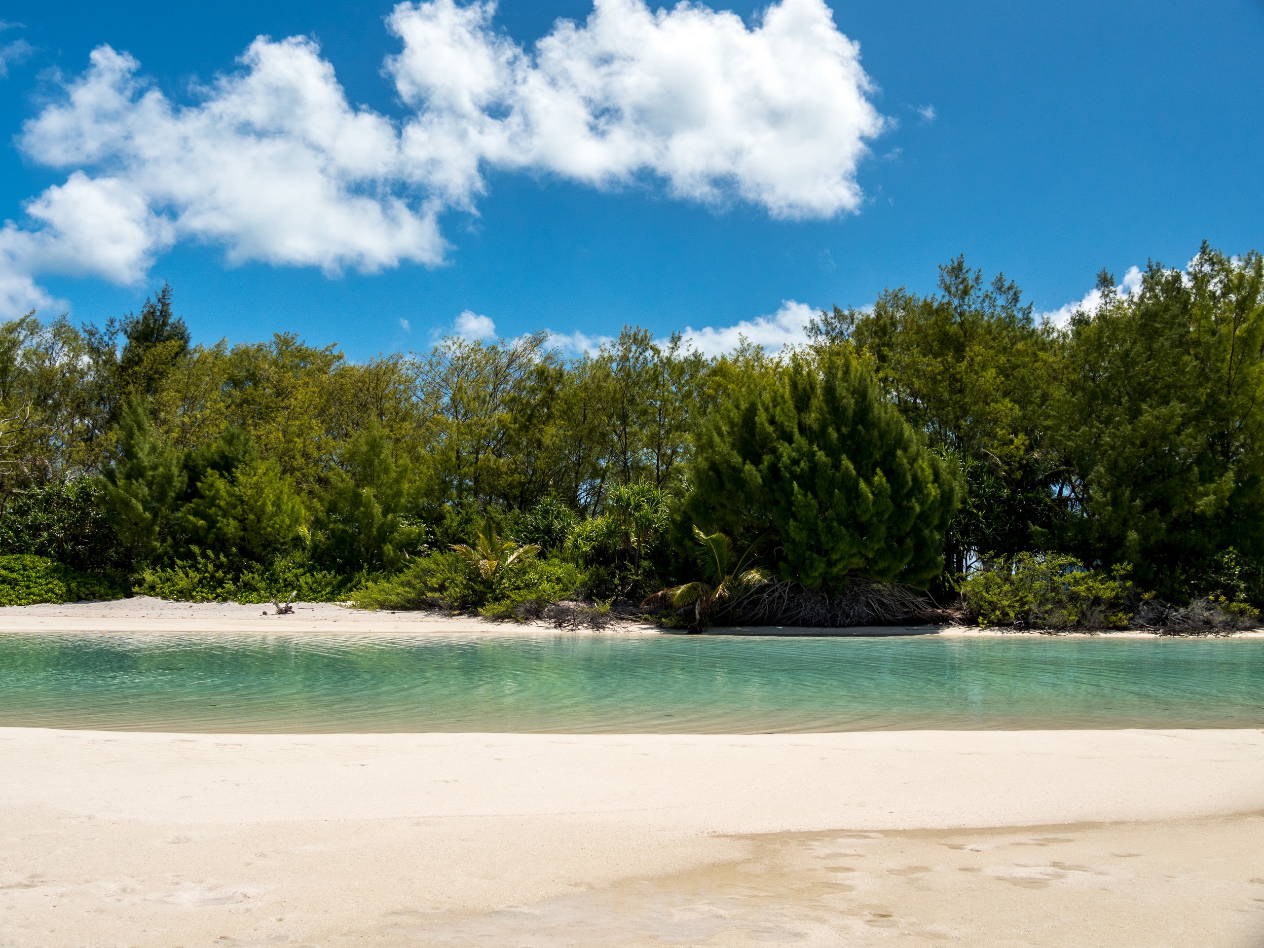 Même sous ciel gris, le lagon de Raivavae garde des couleurs intenses de menthe à l’eau, de turquoise et de bleu marine. Ça tient presque de l’ensorcellement ! Il y a évidemment la fameuse piscine qui donne son surnom au motu : un petit espace d’eau contenu entre le motu et un banc de sable, du même turquoise que les carrelages d’une piscine. Il s’agrandit et se rétrécit au fur et à mesure des marées, révélant d’autres couleurs et permettant au visiteur d’y passer sans perdre pied. N’espérez pas y voir beaucoup de poissons par contre. Il n’y a qu’une seule patate de corail fréquentée par quelques bestioles à nageoires. Les racines des arbres qui plongent dans l’eau sont aussi quelques abris de choix mais pour en trouver plus, il faudra aller jusqu’à la pointe du motu, là où gronde l’océan.