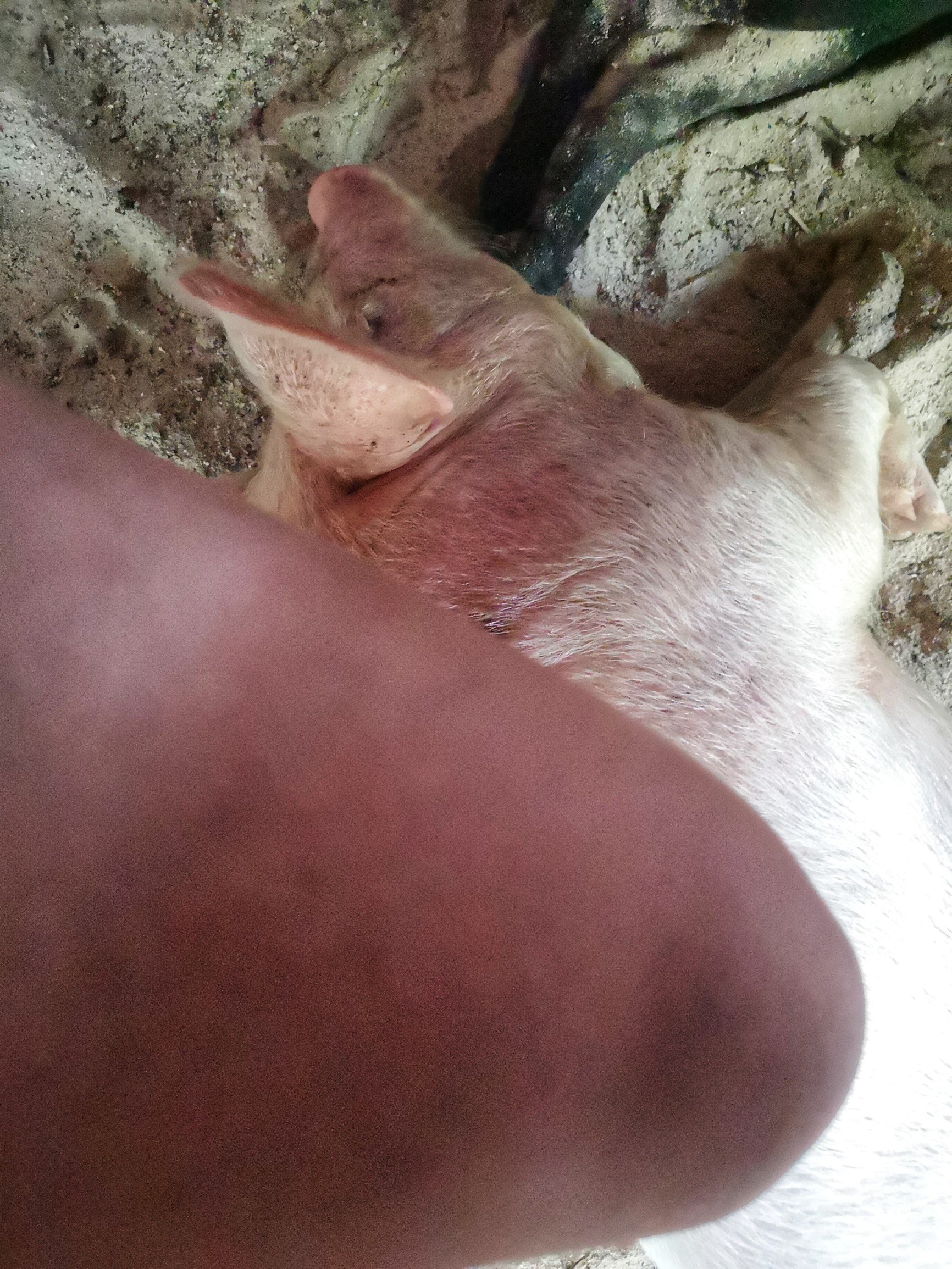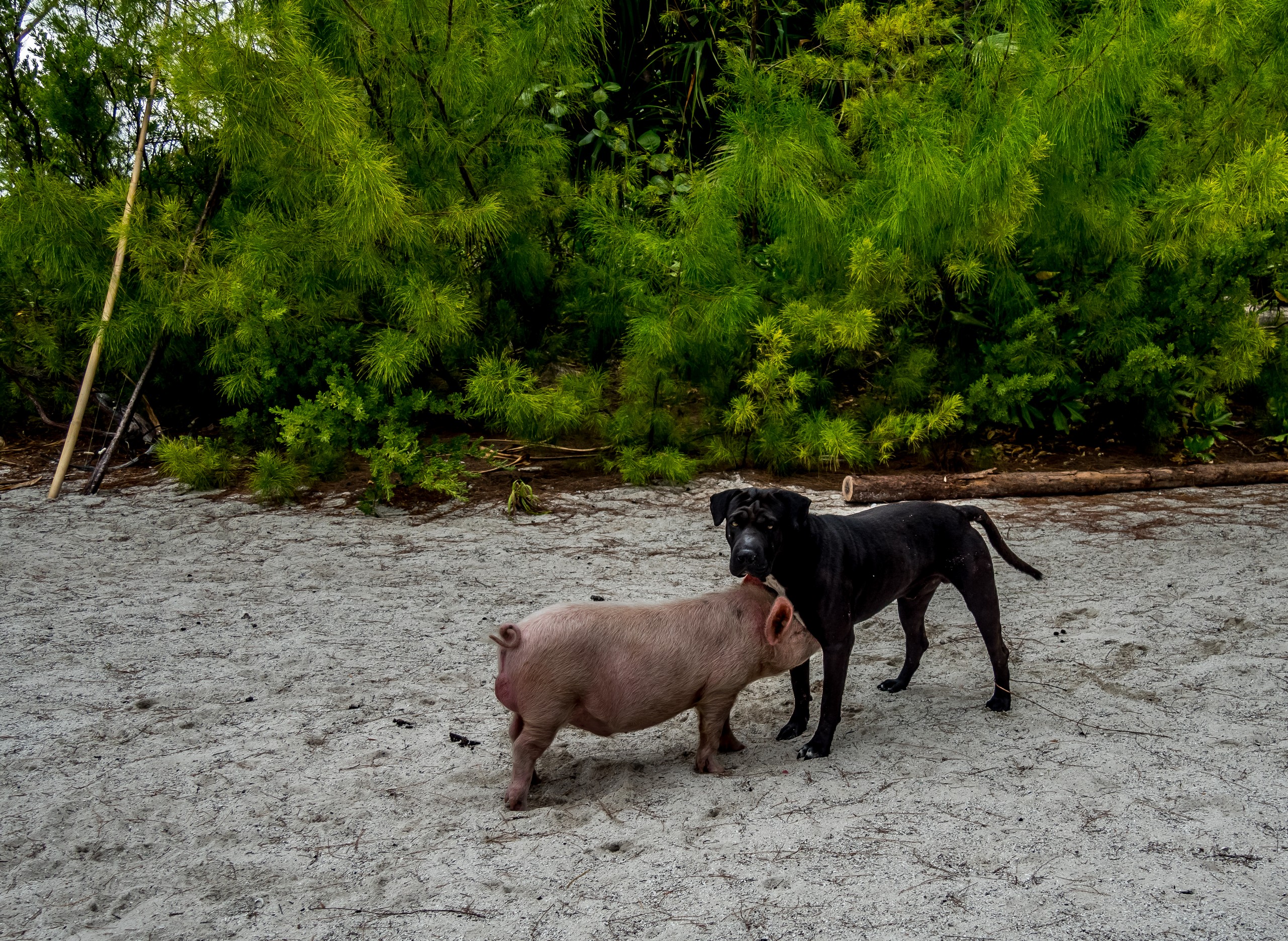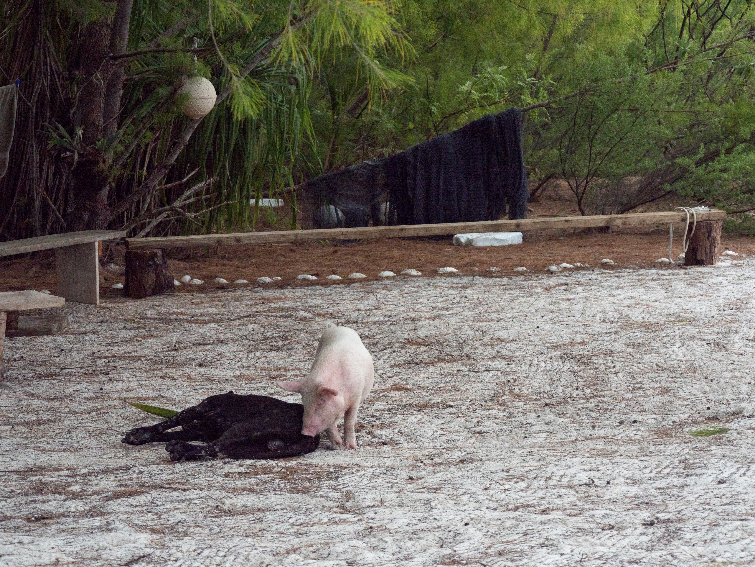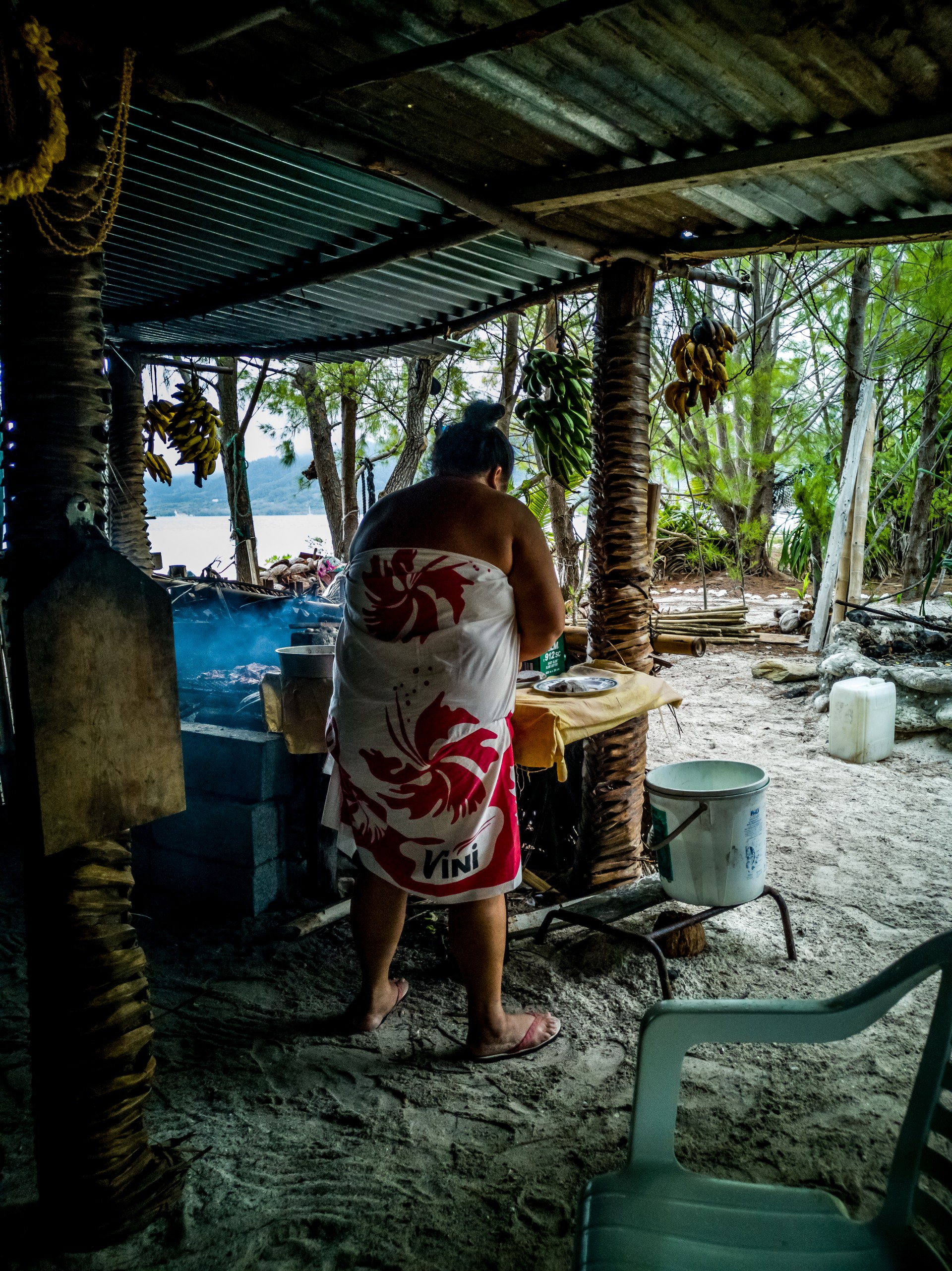Tout à coup, le ciel se déchire à grand fracas de coup de tonnerre. Nous courrons nous abriter. Ça tombait bien ; le repas allait être servi. Au menu : poisson cru, bénitier, poisson perroquet grillé, poulet grillé, taro, ipo et petites bananes locales qui feront oublier tout ce que saviez à propos de la banane auparavant. Et autour d’une bonne table, on cause… beaucoup. Mes pieds quant à eux sont maintenus au chaud par Pua, le cochon (pua veut dire « cochon » en polynésien donc oui, ce petit goret s’appelle « cochon »). Tout rose, dodu et amical, c’est presque comme un autre animal domestique, à l’instar du chien de la famille qu’il ne quitte pas (oui, j’ai osé la blague « copains comme cochons » à propos de cette singulière amitié). Je n’ai malgré tout pas osé demander si Pua était destiné à être mangé.