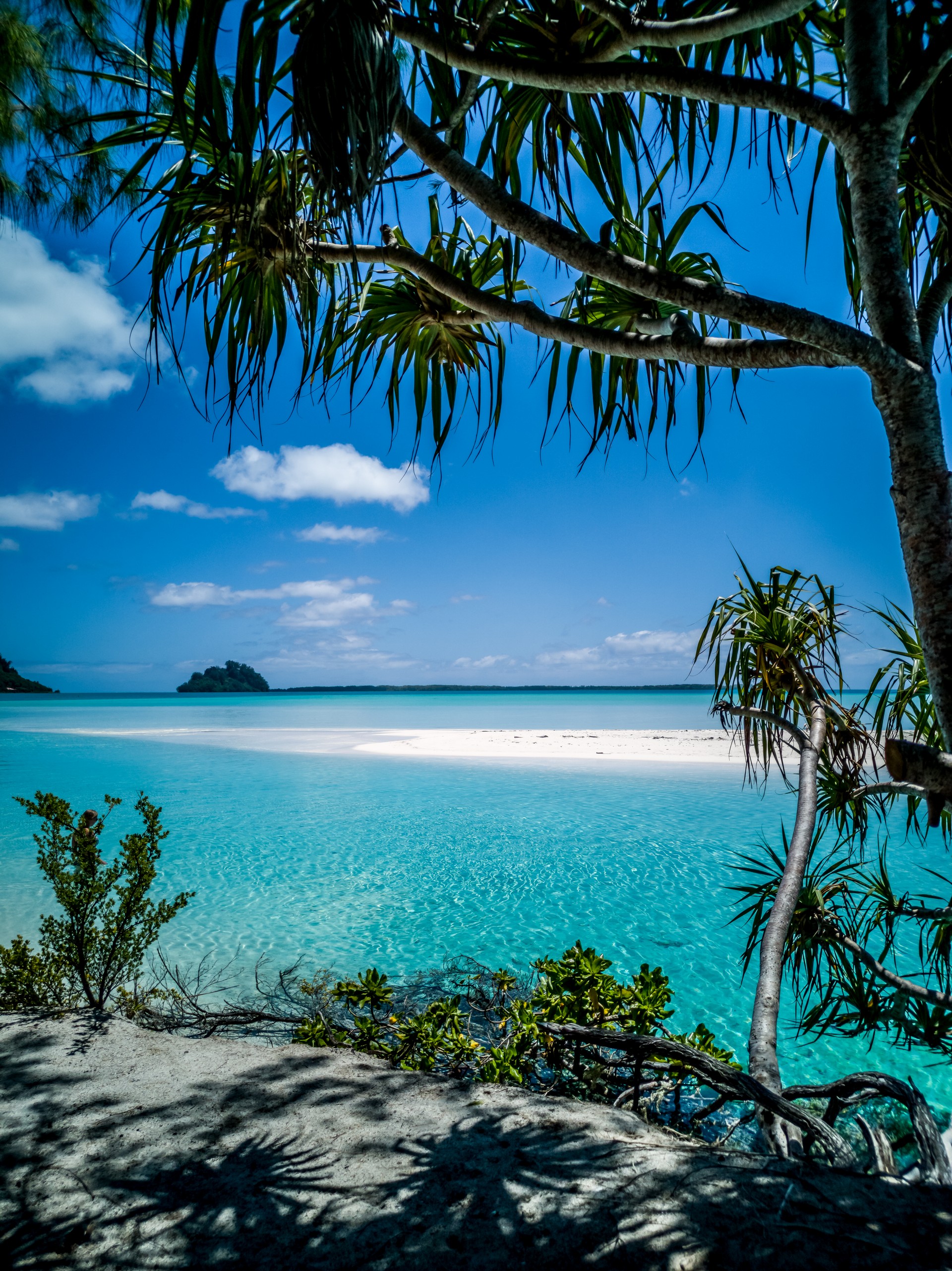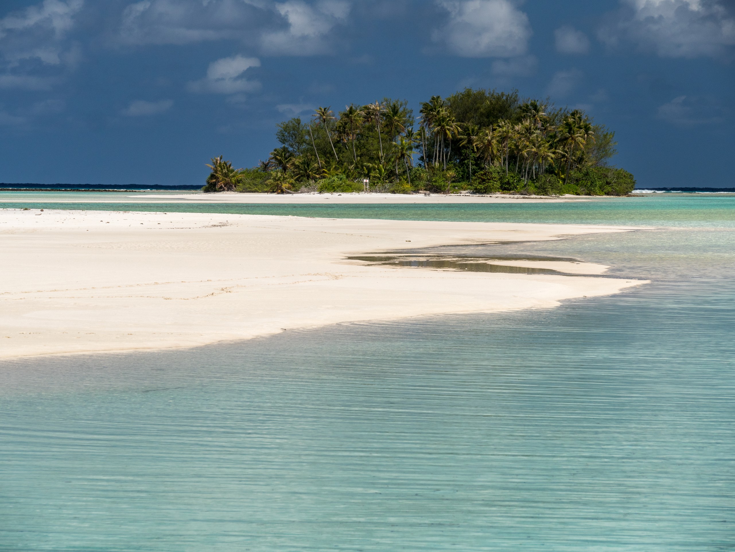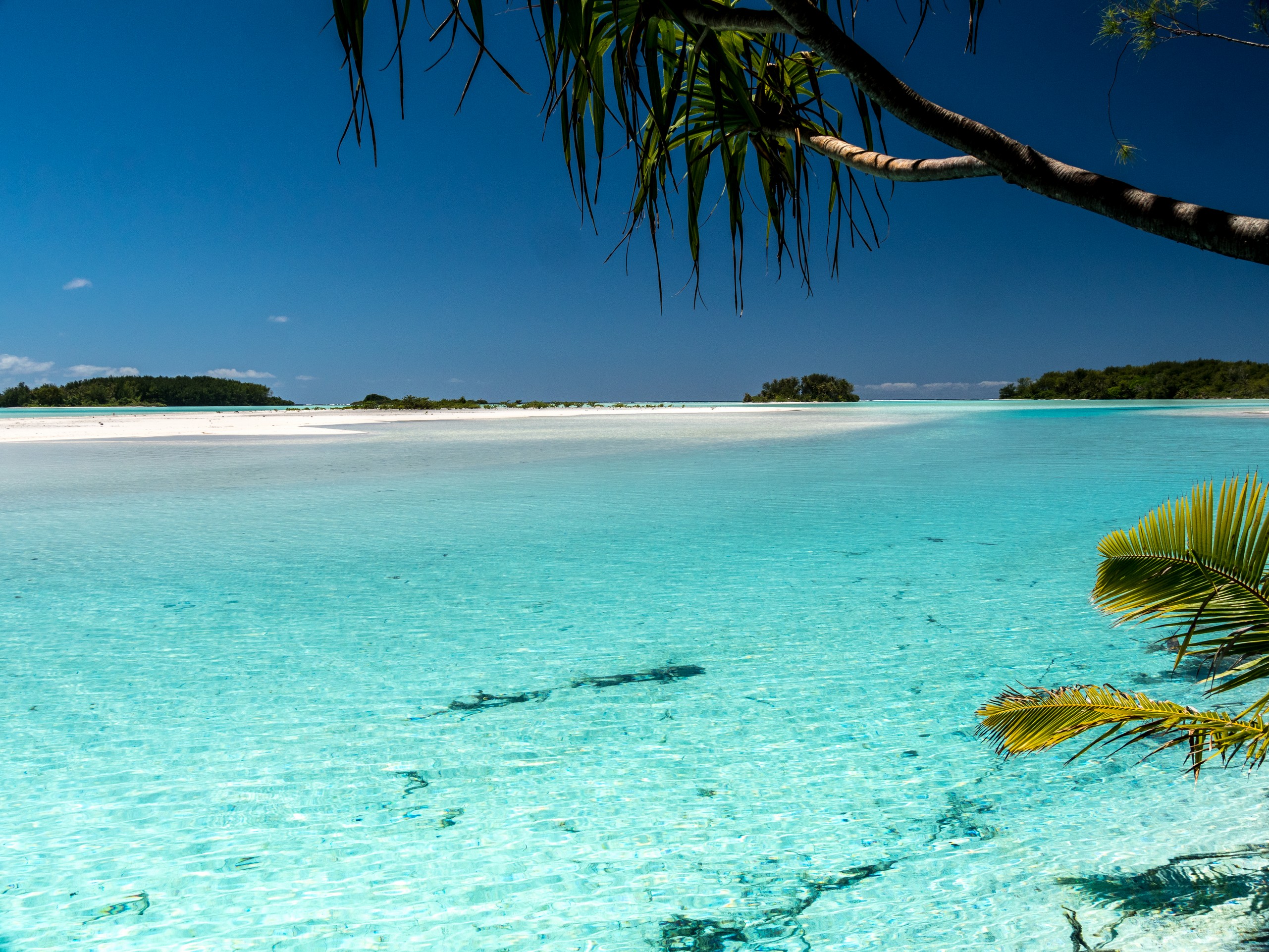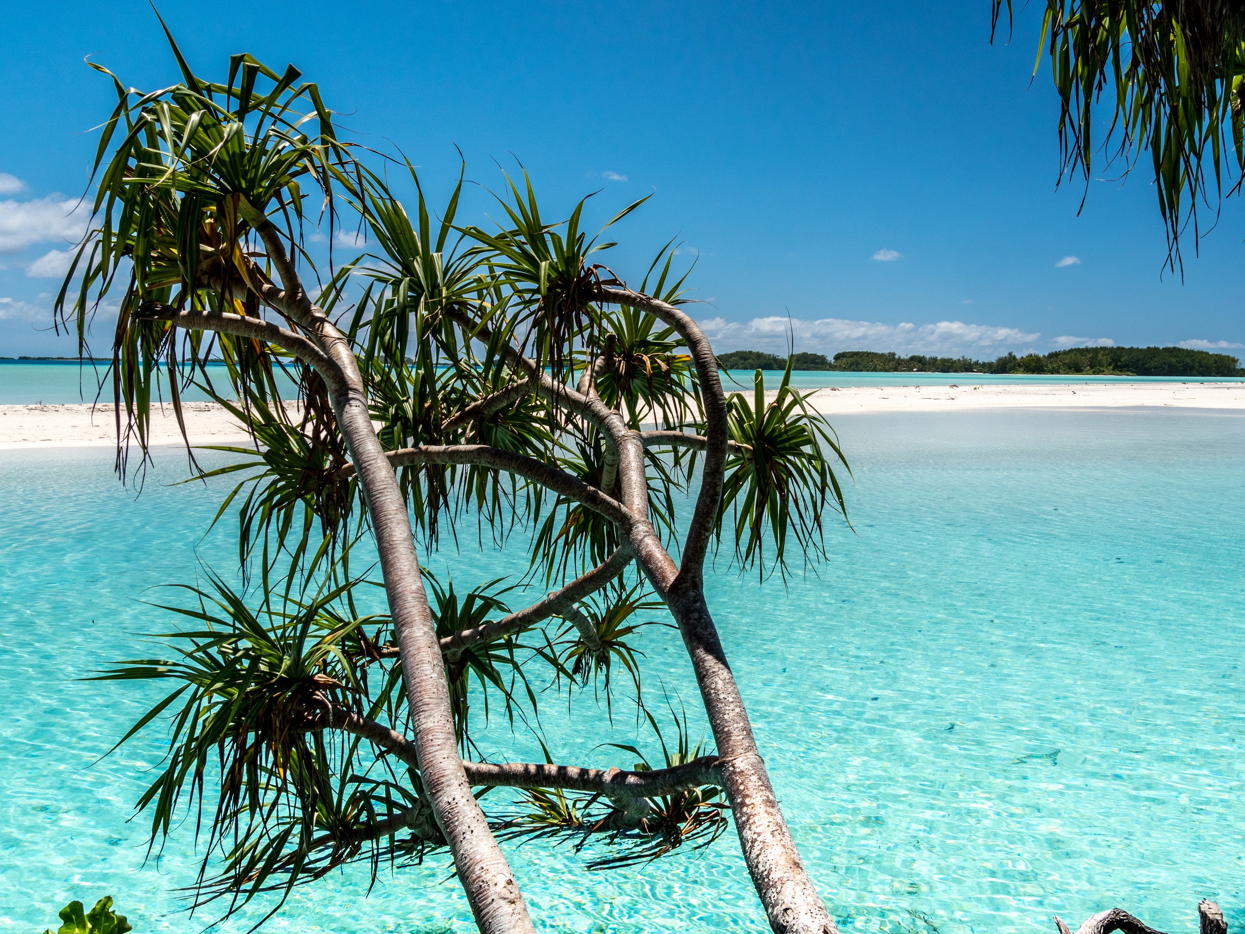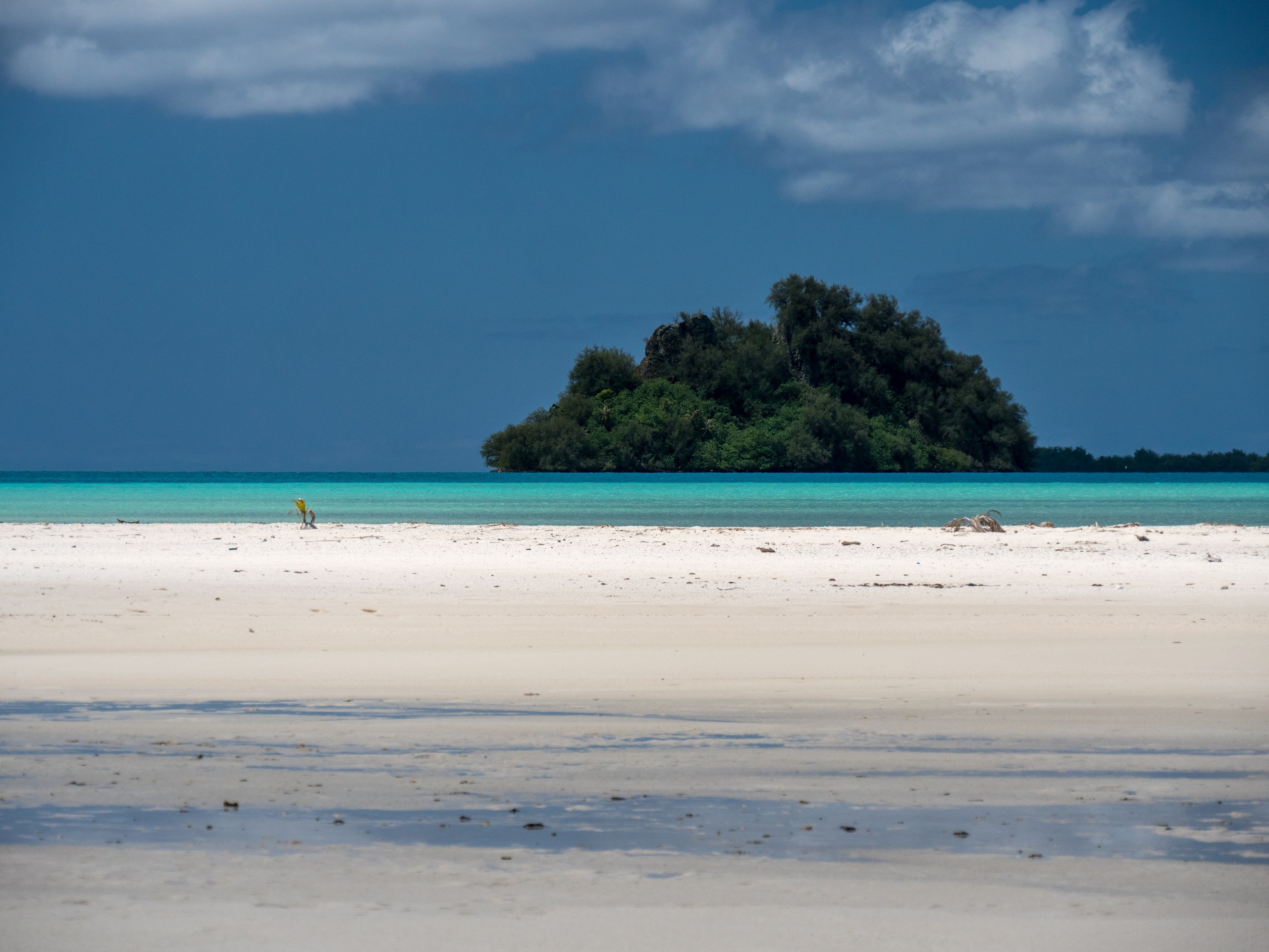 C’est aussi le moment de voir cette fameuse évolution des nuances de la piscine avec la marée, On peut presque voir les changements en direct, c’est magique ! Du turquoise le plus intense, l’eau passe graduellement à un bleu clair lumineux, reflétant encore mieux les nuages qui flottent paresseusement dans le ciel polynésien. J’en profite pour me balader sur le banc de sable qui maintient la « piscine » isolée du reste du lagon. Ce bout de sable à fleur d’eau semble comme suspendu entre deux mondes. Aux alentours, je distingue d’autres motus dont un qui a des parfaites allures de carte postale avec son gros bouquet de palmier. Je me maudis un peu de ne pas avoir de kayak pour pouvoir pagayer jusque-là.
