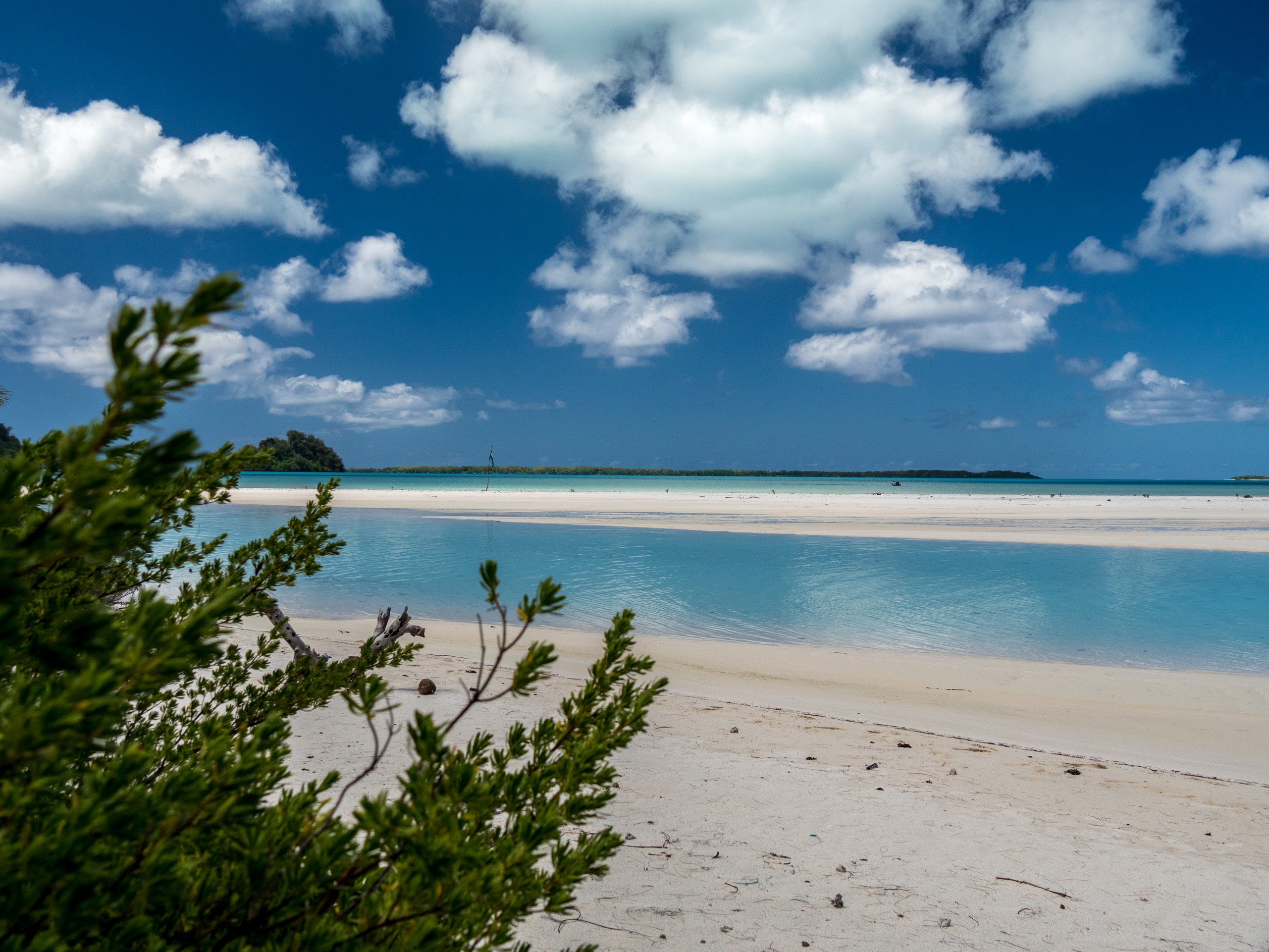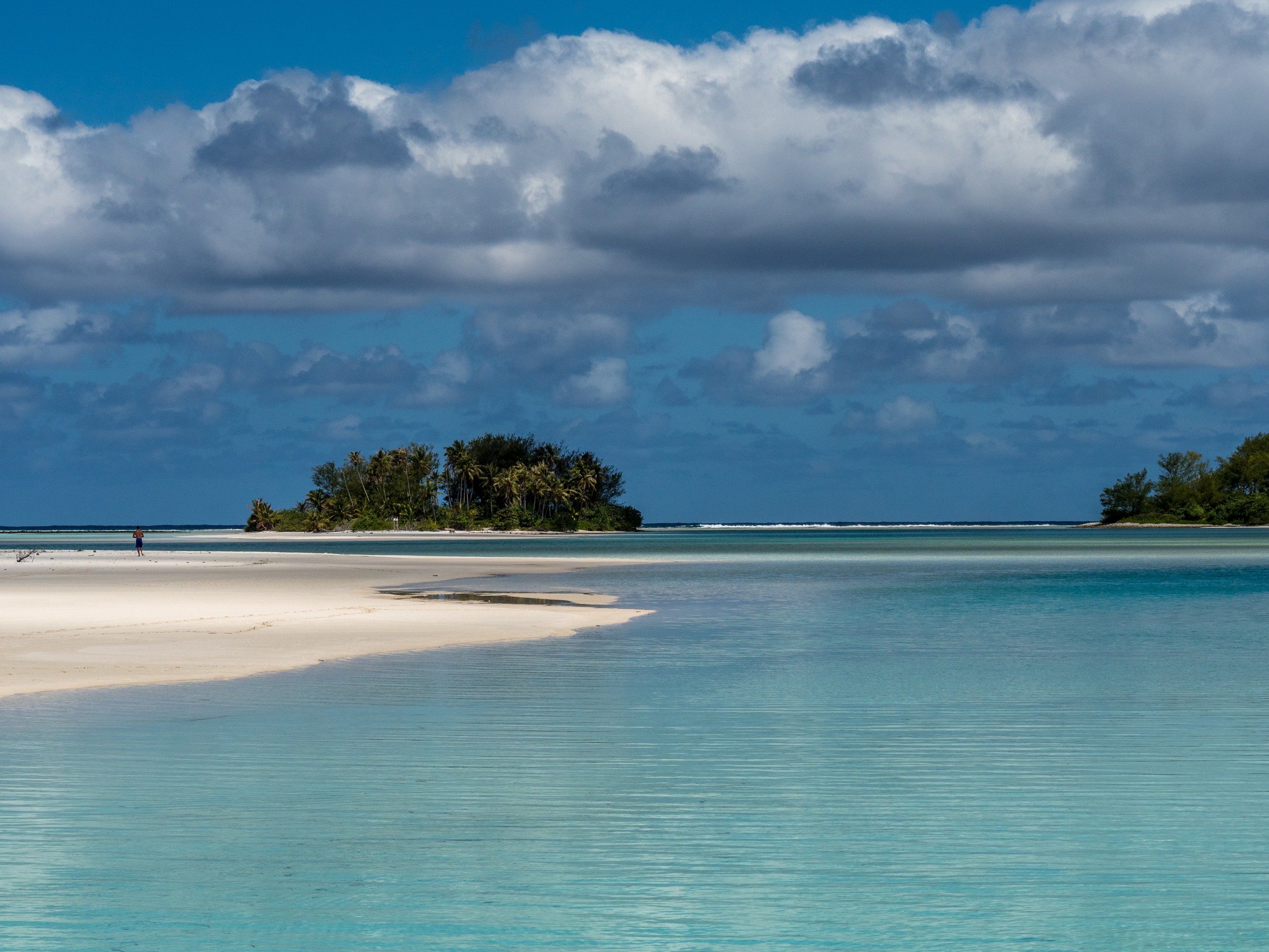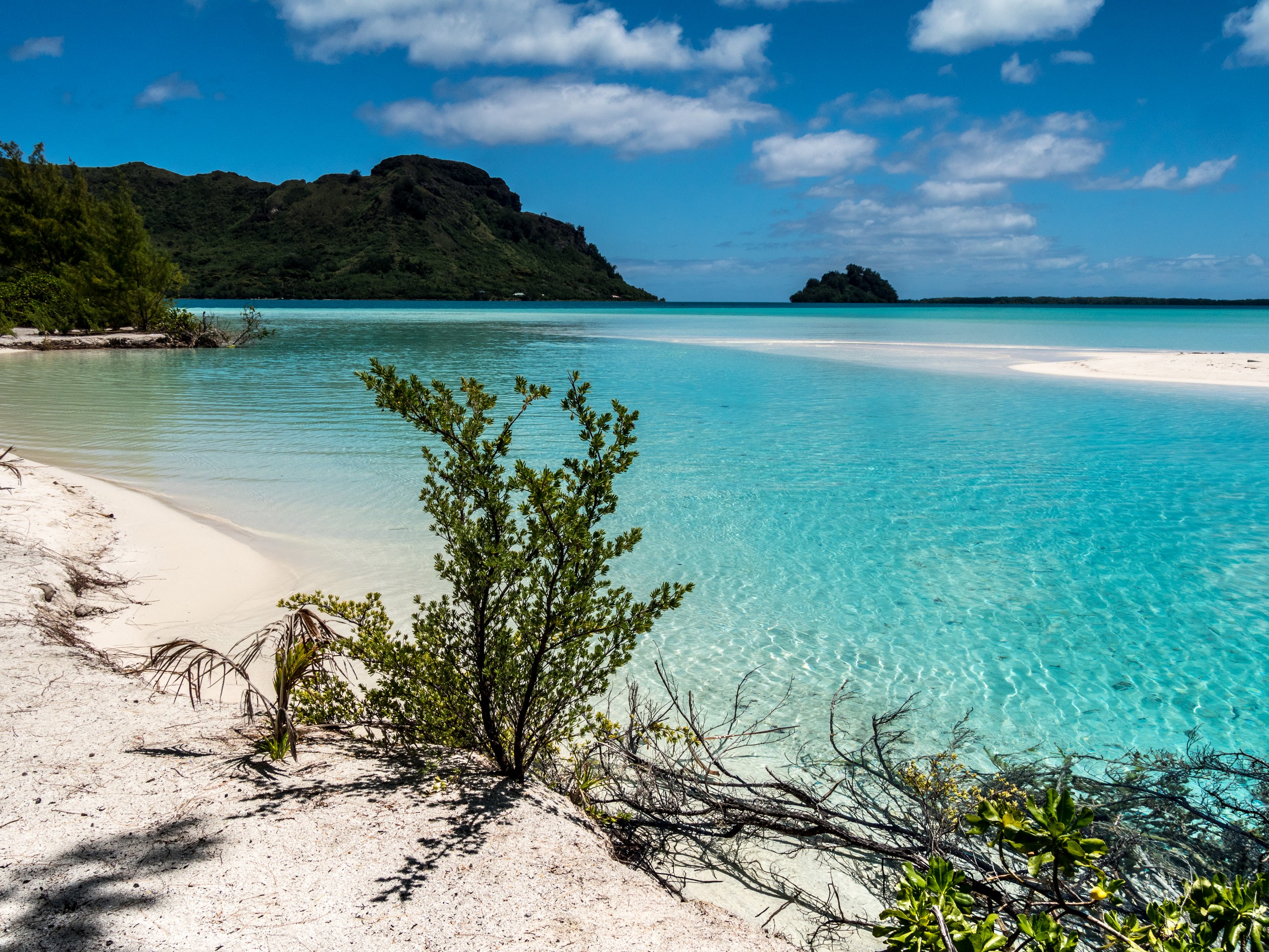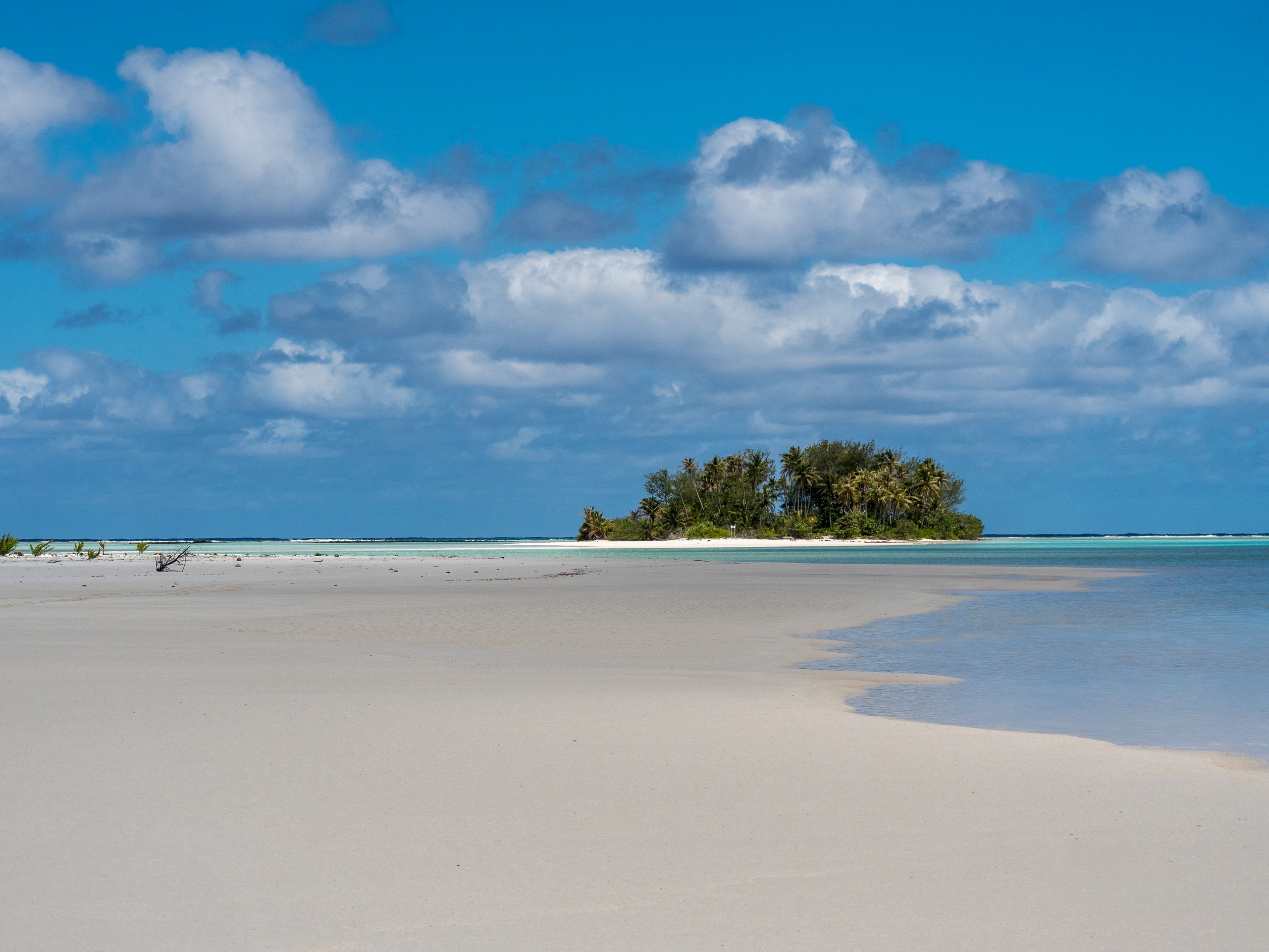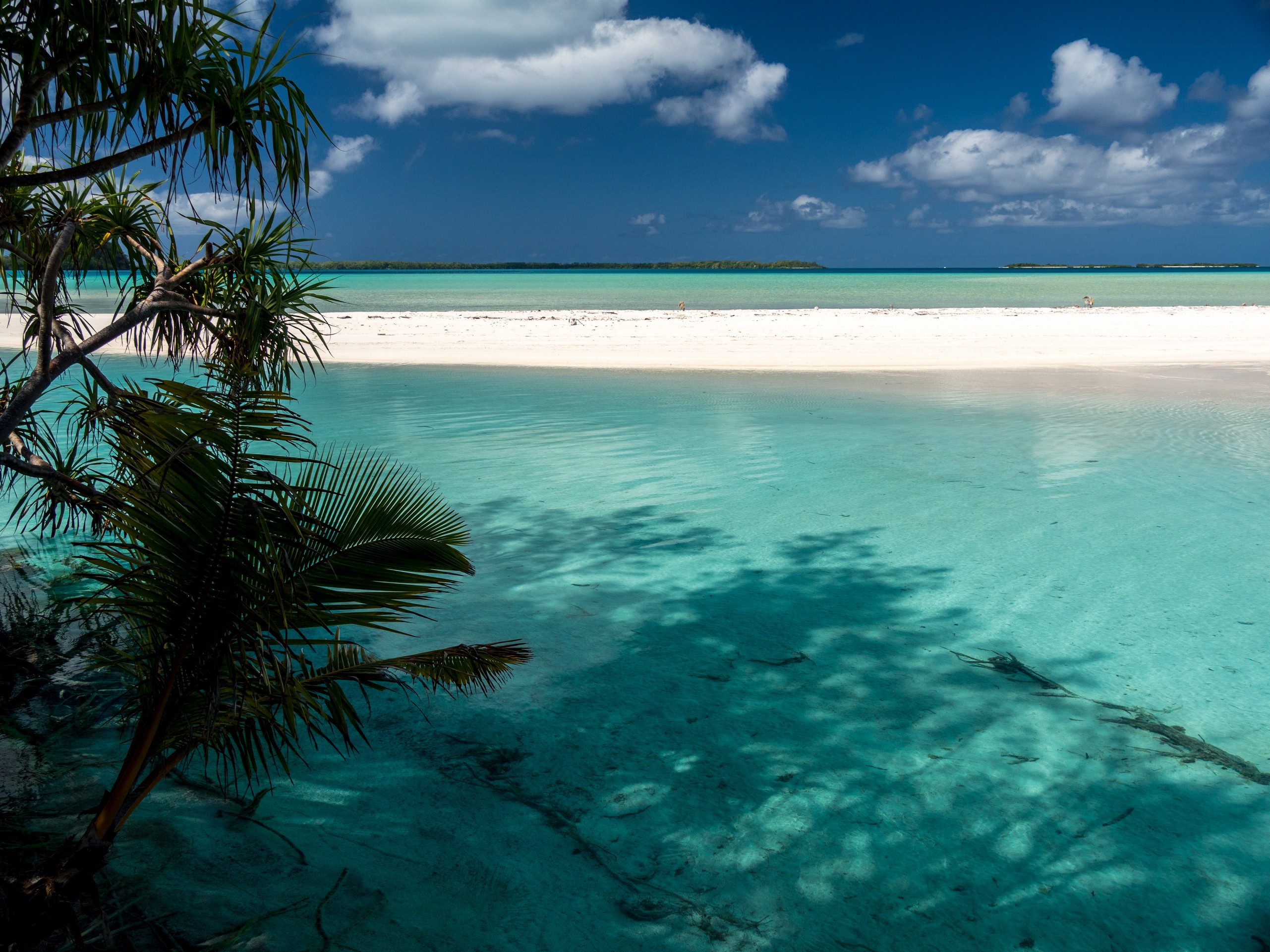 C’est aussi le moment de voir cette fameuse évolution des nuances de la piscine avec la marée, On peut presque voir les changements en direct, c’est magique ! Du turquoise le plus intense, l’eau passe graduellement à un bleu clair lumineux, reflétant encore mieux les nuages qui flottent paresseusement dans le ciel polynésien. J’en profite pour me balader sur le banc de sable qui maintient la « piscine » isolée du reste du lagon. Ce bout de sable à fleur d’eau semble comme suspendu entre deux mondes. Aux alentours, je distingue d’autres motus dont un qui a des parfaites allures de carte postale avec son gros bouquet de palmier. Je me maudis un peu de ne pas avoir de kayak pour pouvoir pagayer jusque-là.