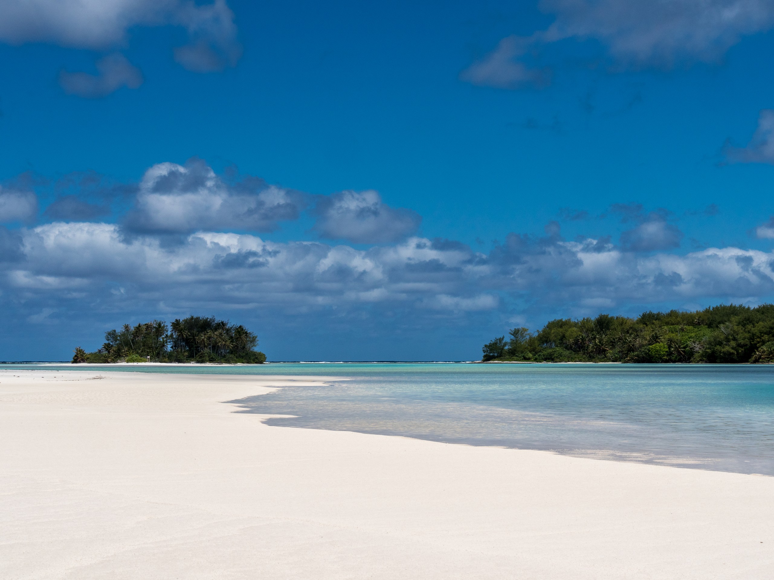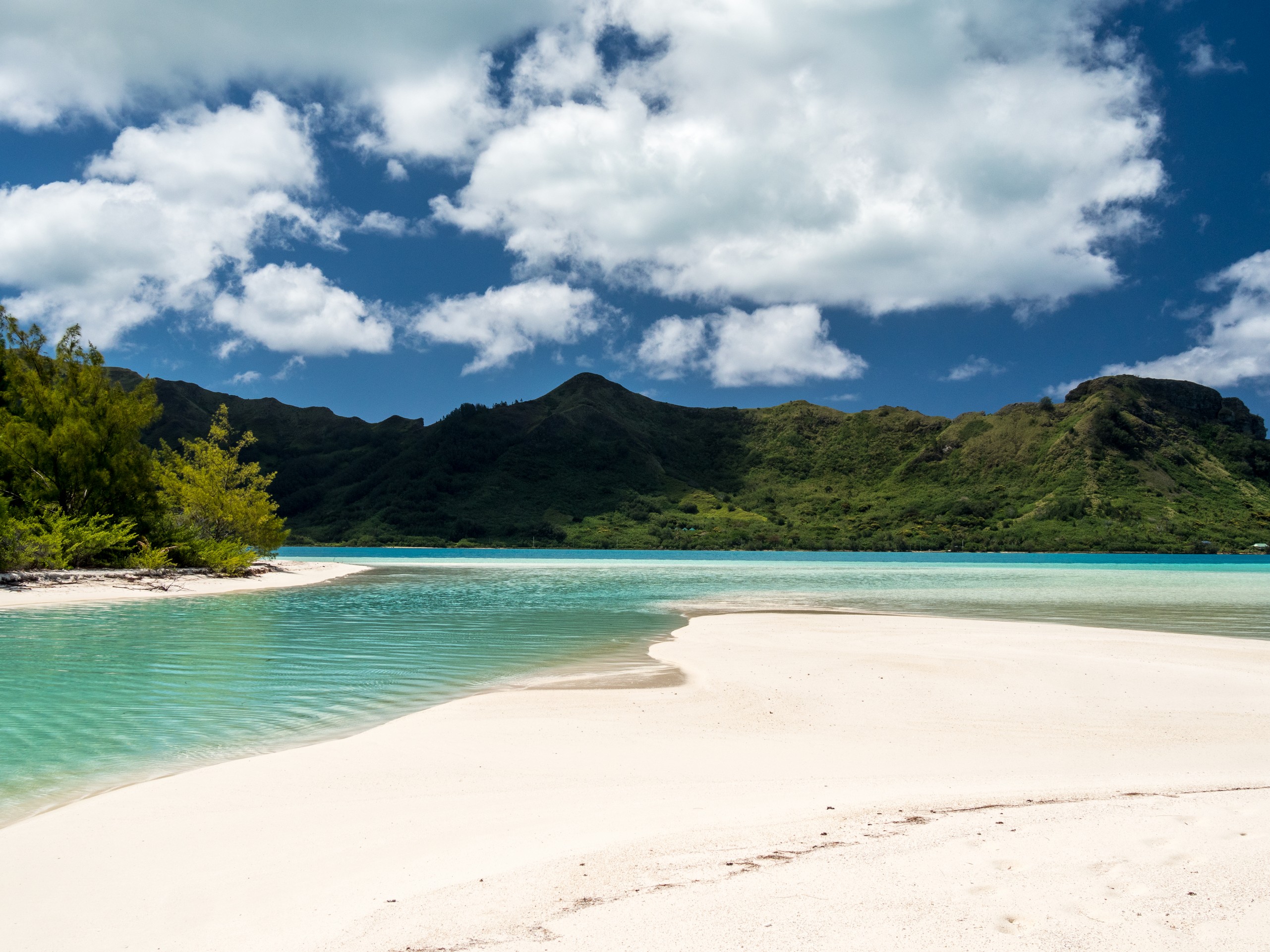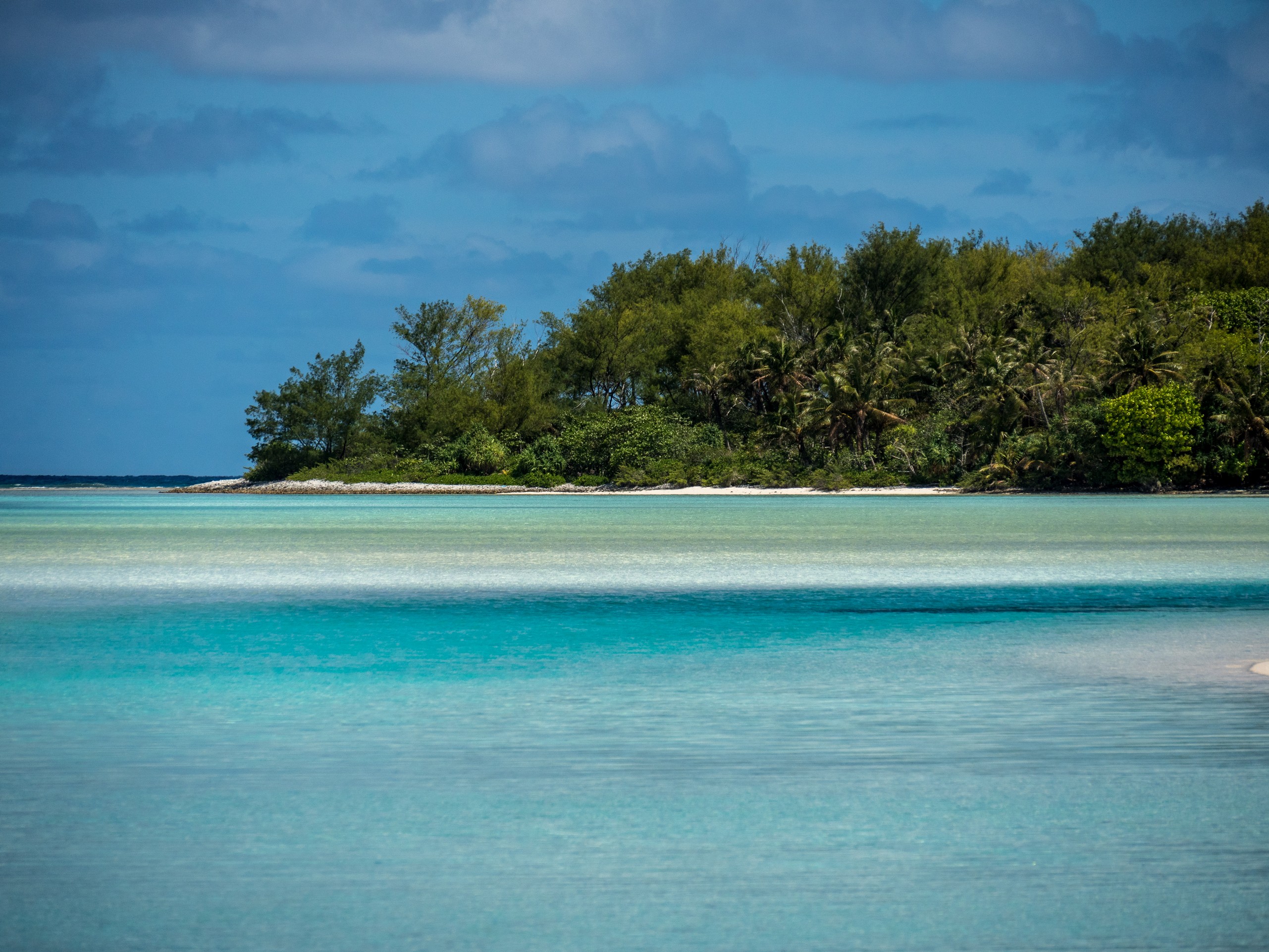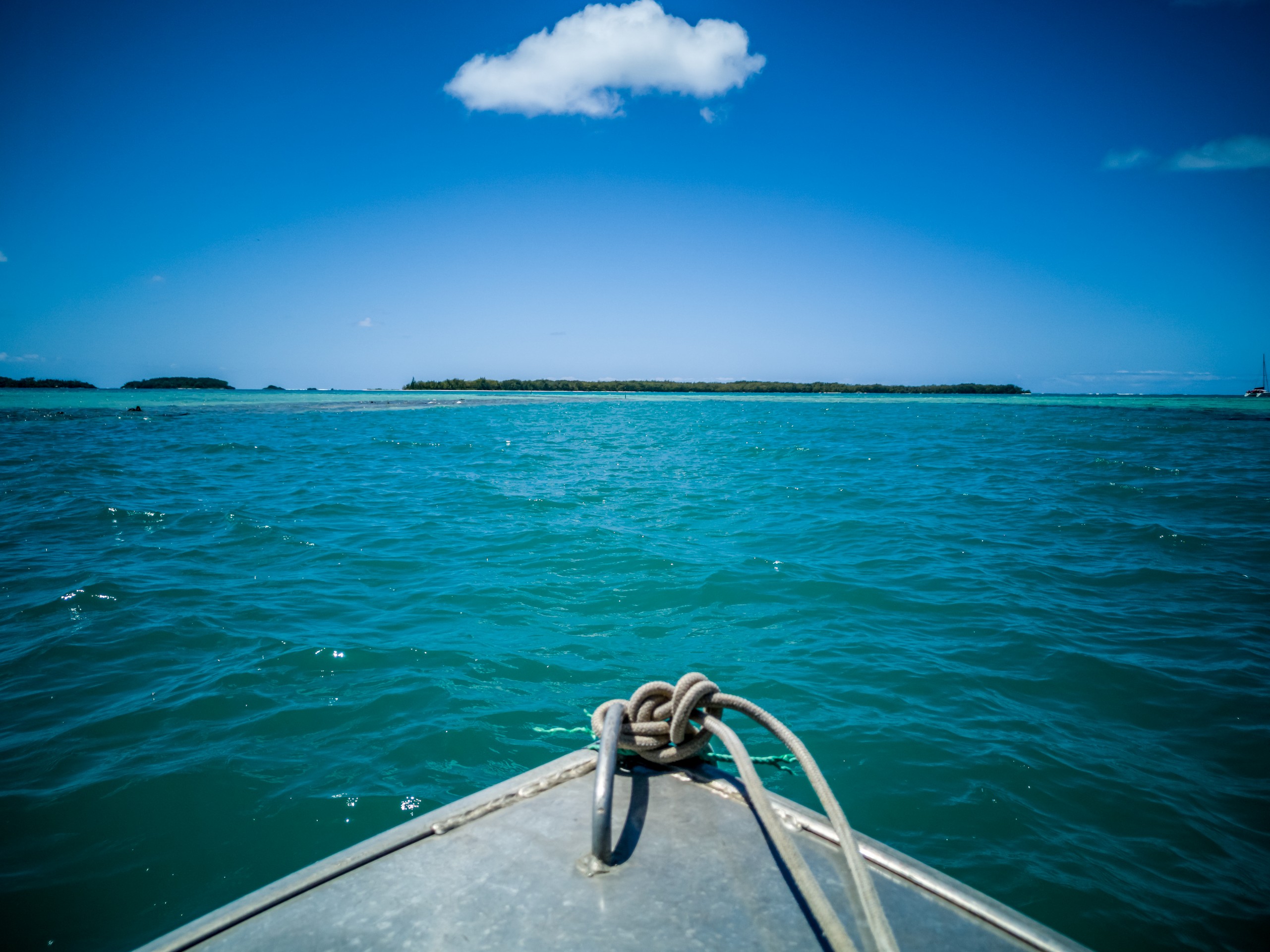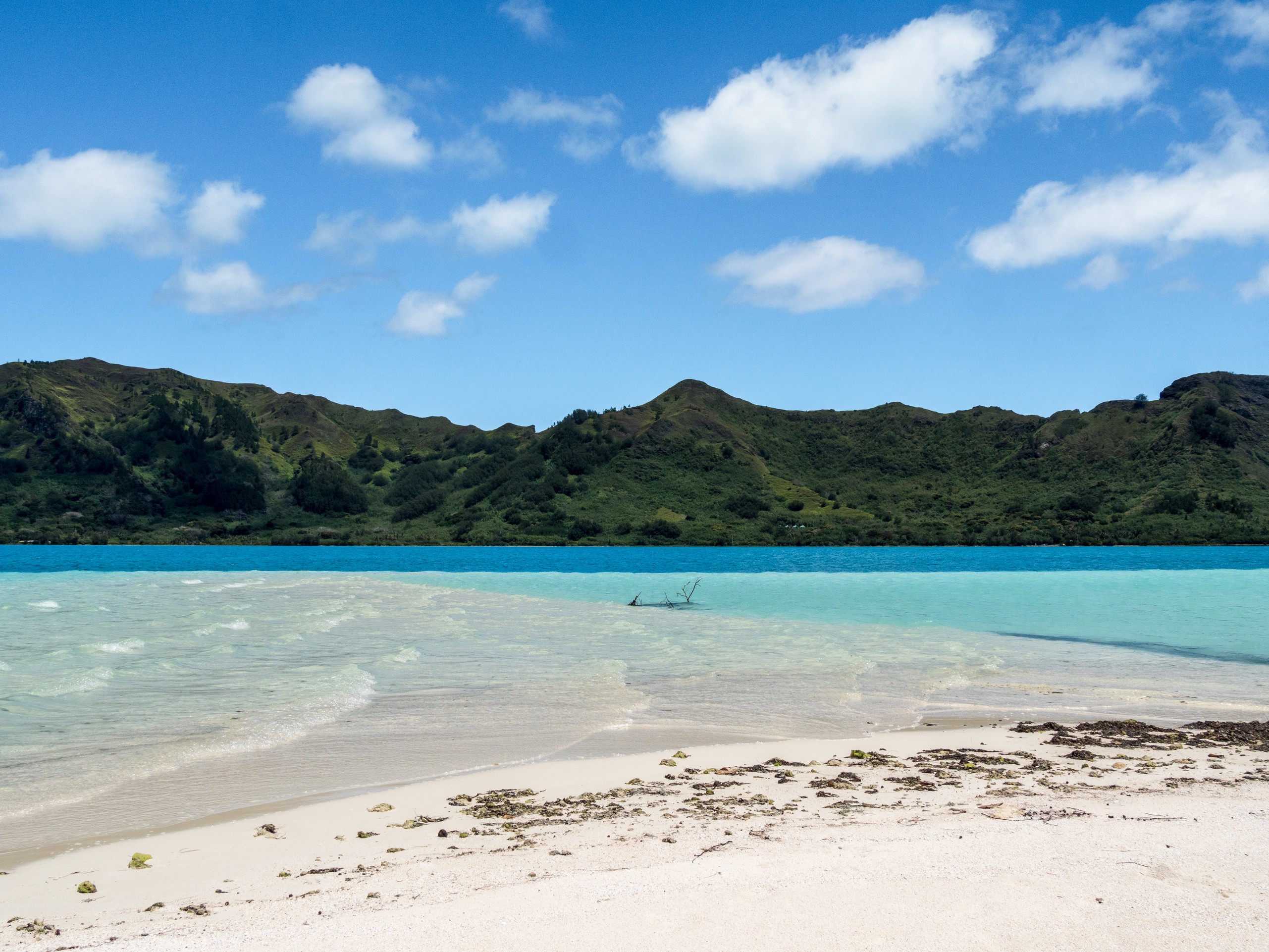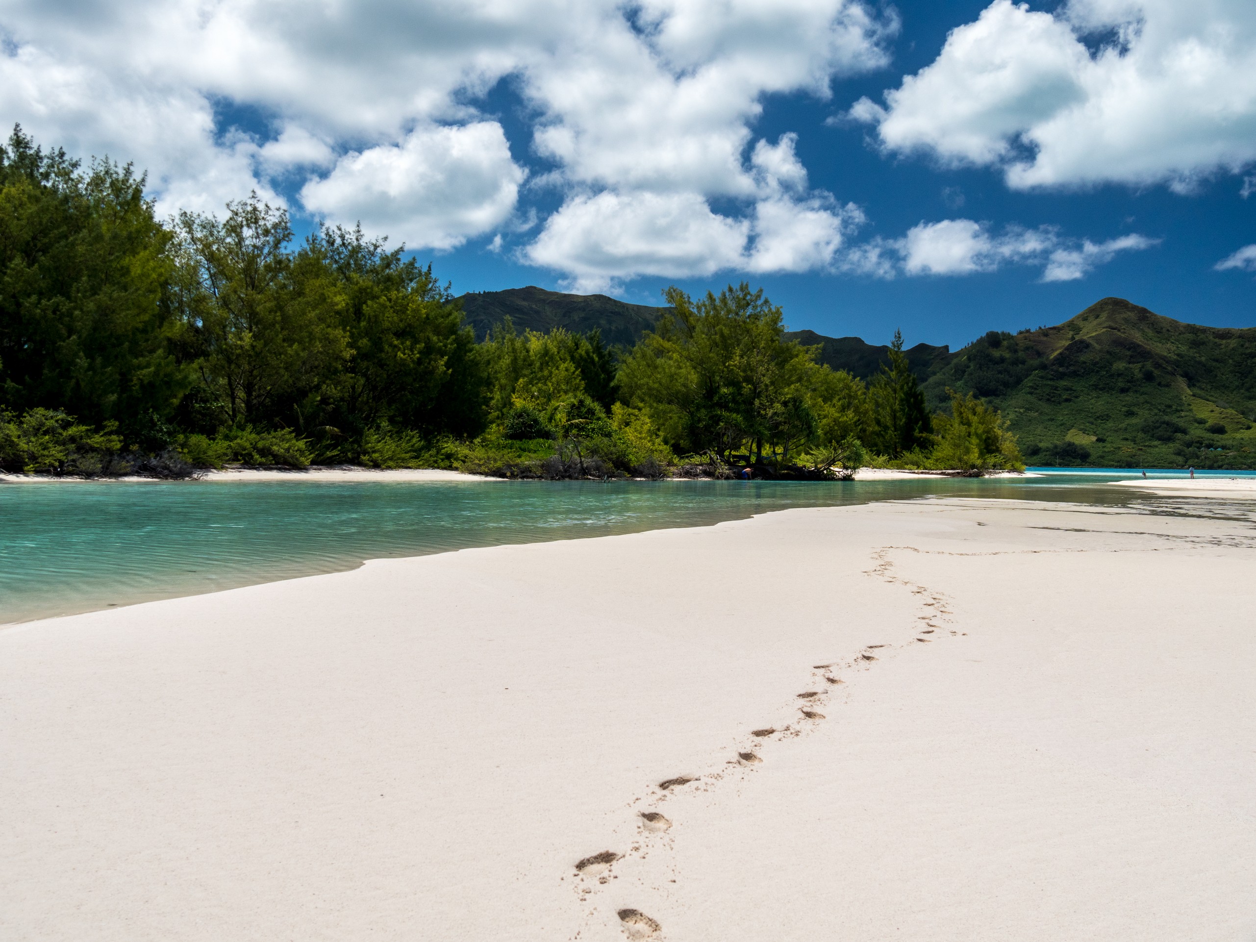 C’est aussi le moment de voir cette fameuse évolution des nuances de la piscine avec la marée, On peut presque voir les changements en direct, c’est magique ! Du turquoise le plus intense, l’eau passe graduellement à un bleu clair lumineux, reflétant encore mieux les nuages qui flottent paresseusement dans le ciel polynésien. J’en profite pour me balader sur le banc de sable qui maintient la « piscine » isolée du reste du lagon. Ce bout de sable à fleur d’eau semble comme suspendu entre deux mondes. Aux alentours, je distingue d’autres motus dont un qui a des parfaites allures de carte postale avec son gros bouquet de palmier. Je me maudis un peu de ne pas avoir de kayak pour pouvoir pagayer jusque-là.