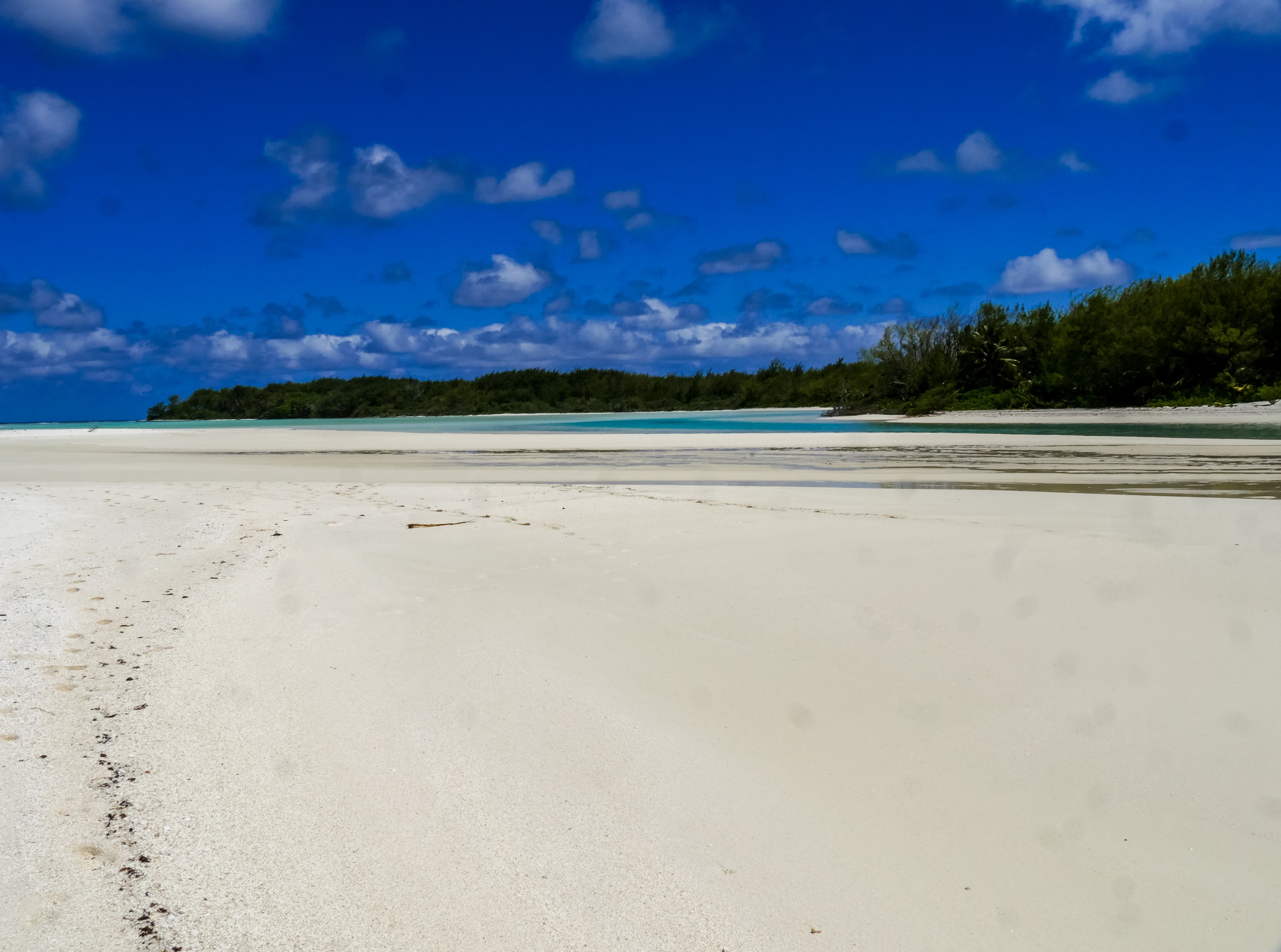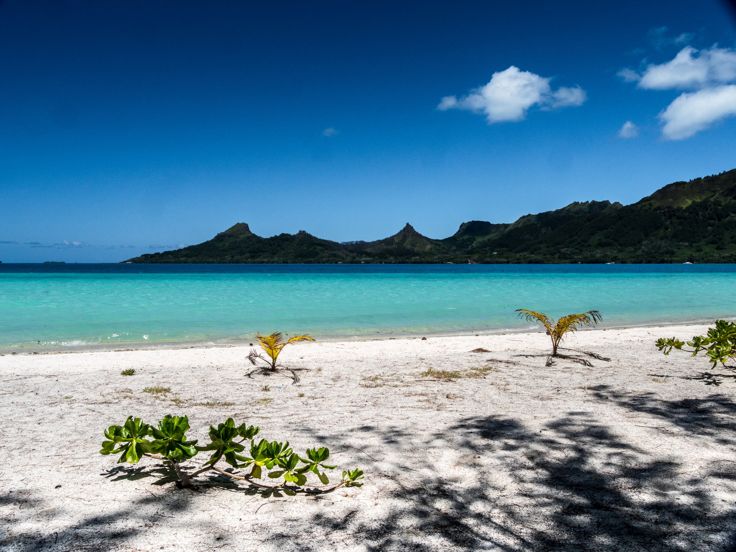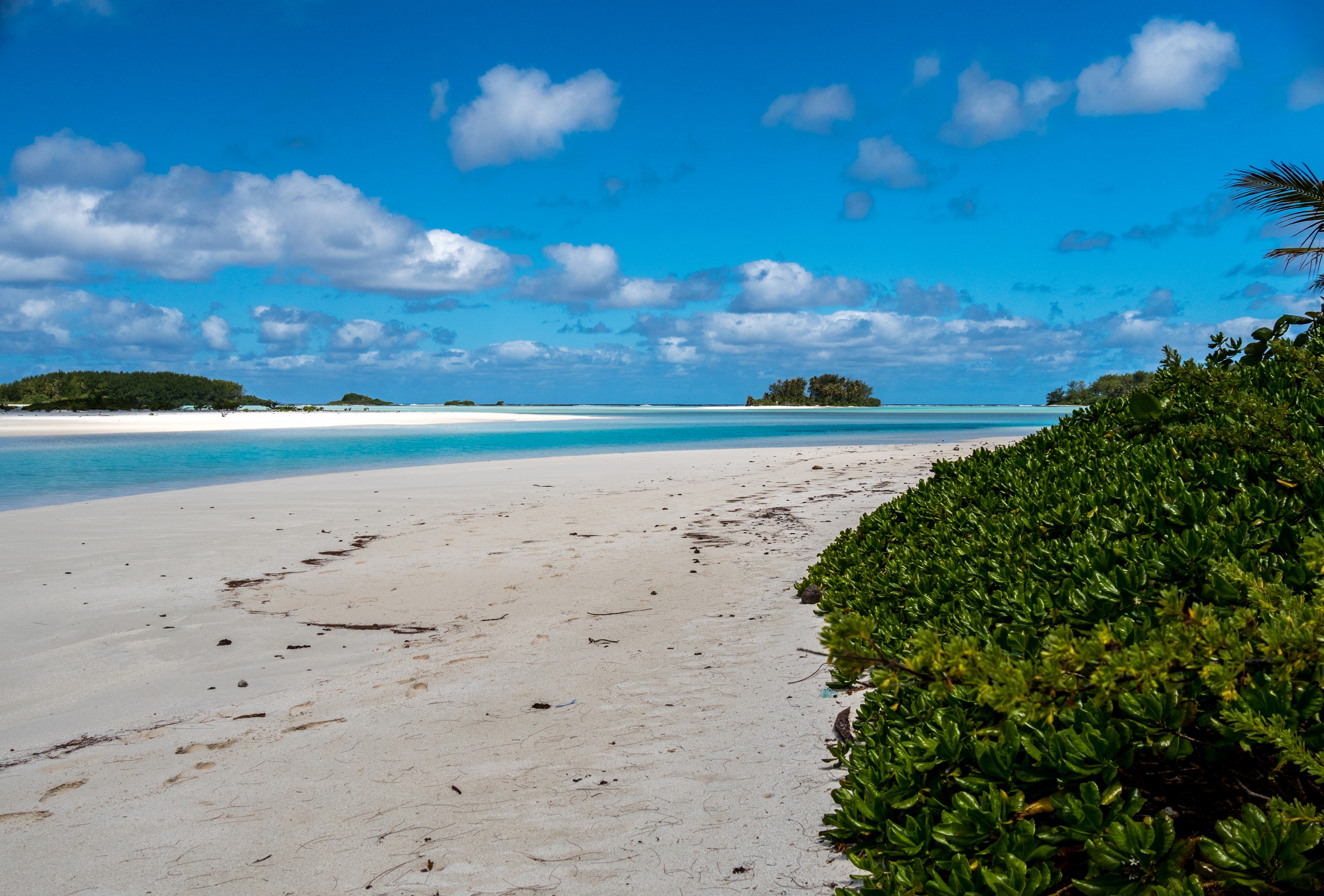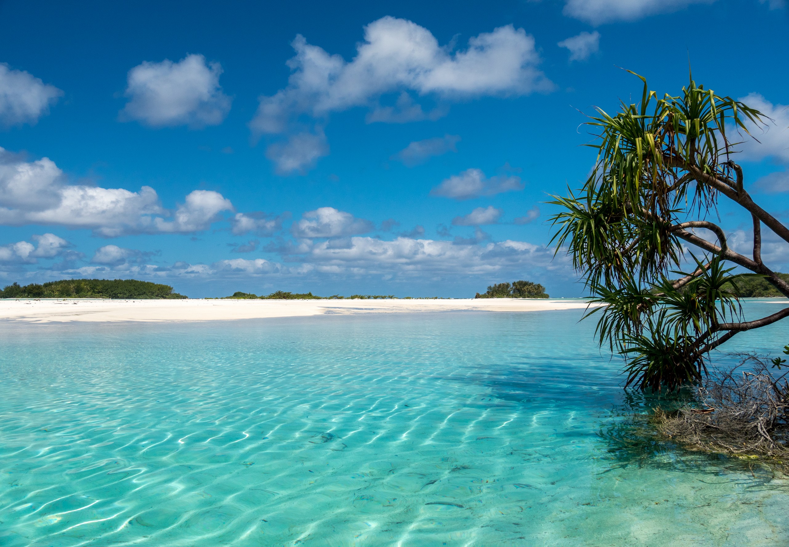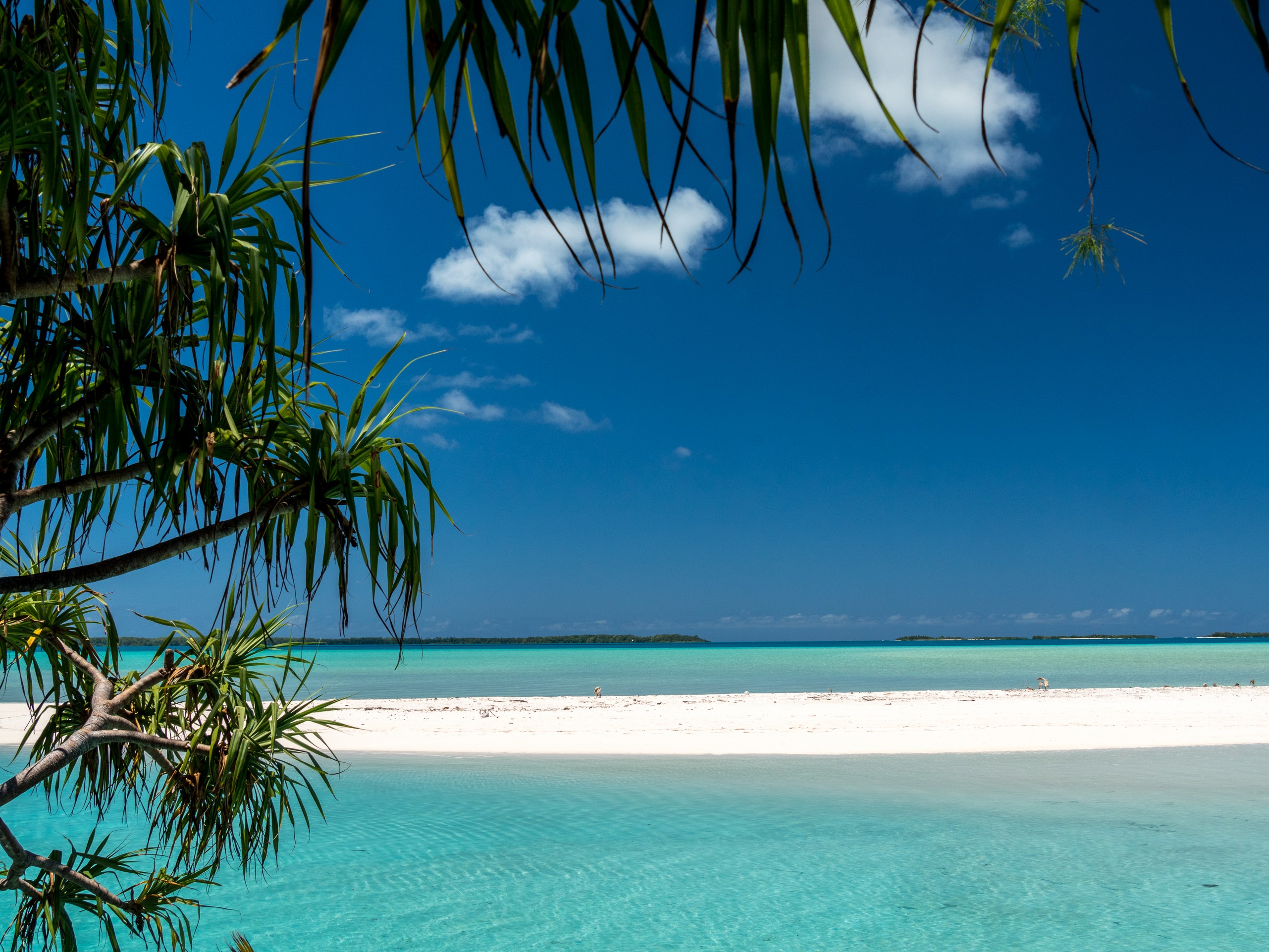 C’est aussi le moment de voir cette fameuse évolution des nuances de la piscine avec la marée, On peut presque voir les changements en direct, c’est magique ! Du turquoise le plus intense, l’eau passe graduellement à un bleu clair lumineux, reflétant encore mieux les nuages qui flottent paresseusement dans le ciel polynésien. J’en profite pour me balader sur le banc de sable qui maintient la « piscine » isolée du reste du lagon. Ce bout de sable à fleur d’eau semble comme suspendu entre deux mondes. Aux alentours, je distingue d’autres motus dont un qui a des parfaites allures de carte postale avec son gros bouquet de palmier. Je me maudis un peu de ne pas avoir de kayak pour pouvoir pagayer jusque-là.