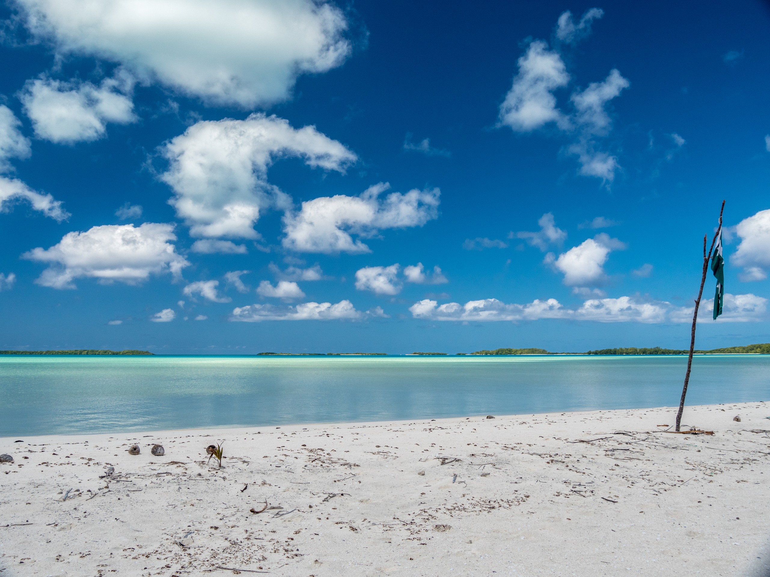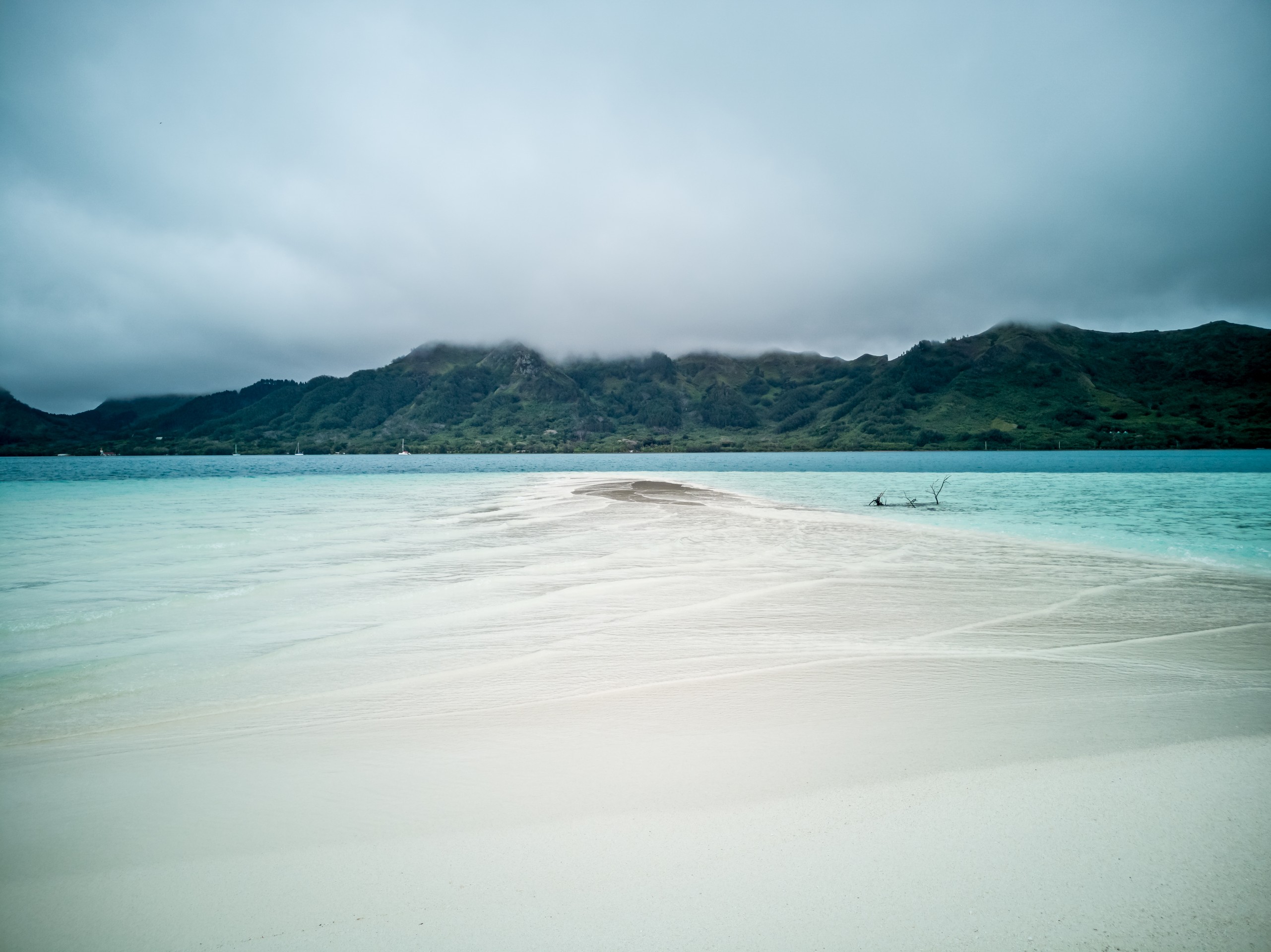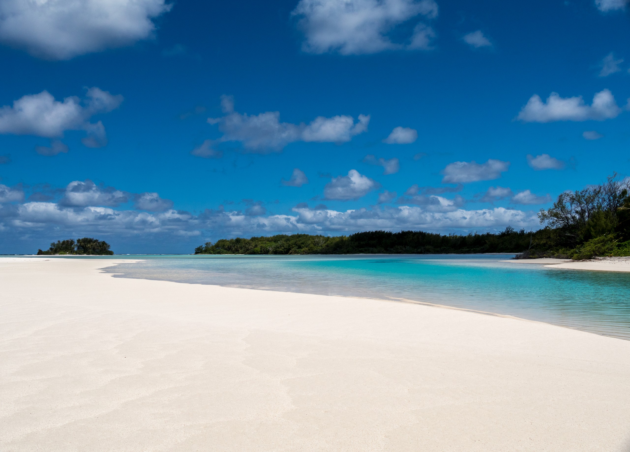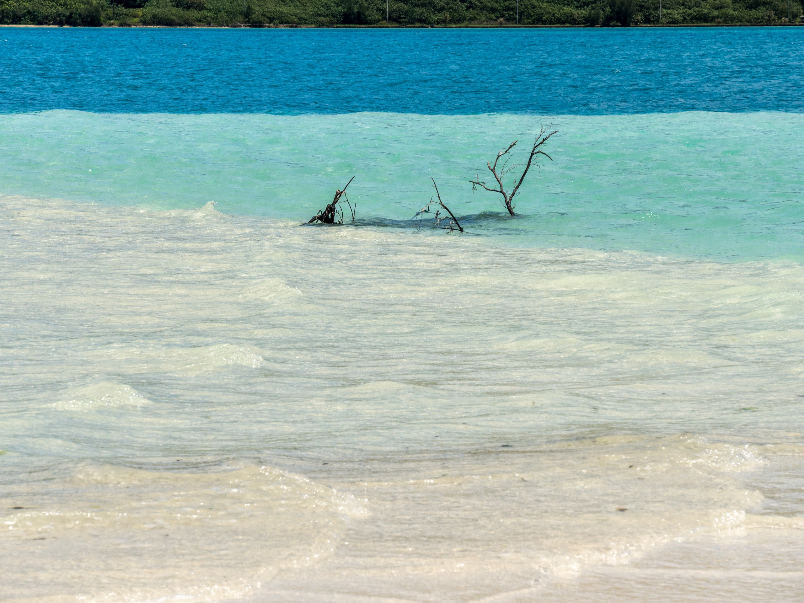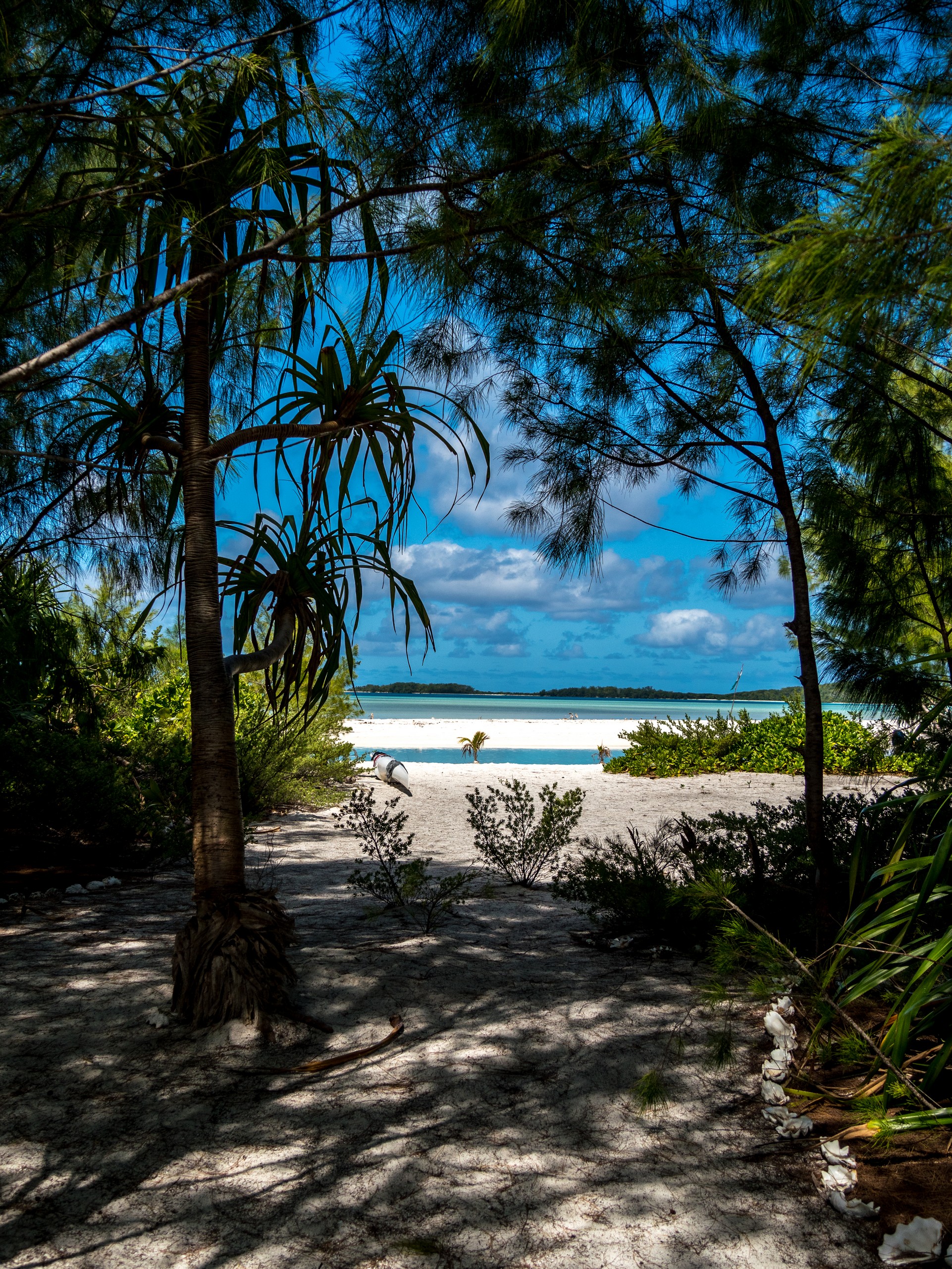 C’est aussi le moment de voir cette fameuse évolution des nuances de la piscine avec la marée, On peut presque voir les changements en direct, c’est magique ! Du turquoise le plus intense, l’eau passe graduellement à un bleu clair lumineux, reflétant encore mieux les nuages qui flottent paresseusement dans le ciel polynésien. J’en profite pour me balader sur le banc de sable qui maintient la « piscine » isolée du reste du lagon. Ce bout de sable à fleur d’eau semble comme suspendu entre deux mondes. Aux alentours, je distingue d’autres motus dont un qui a des parfaites allures de carte postale avec son gros bouquet de palmier. Je me maudis un peu de ne pas avoir de kayak pour pouvoir pagayer jusque-là.