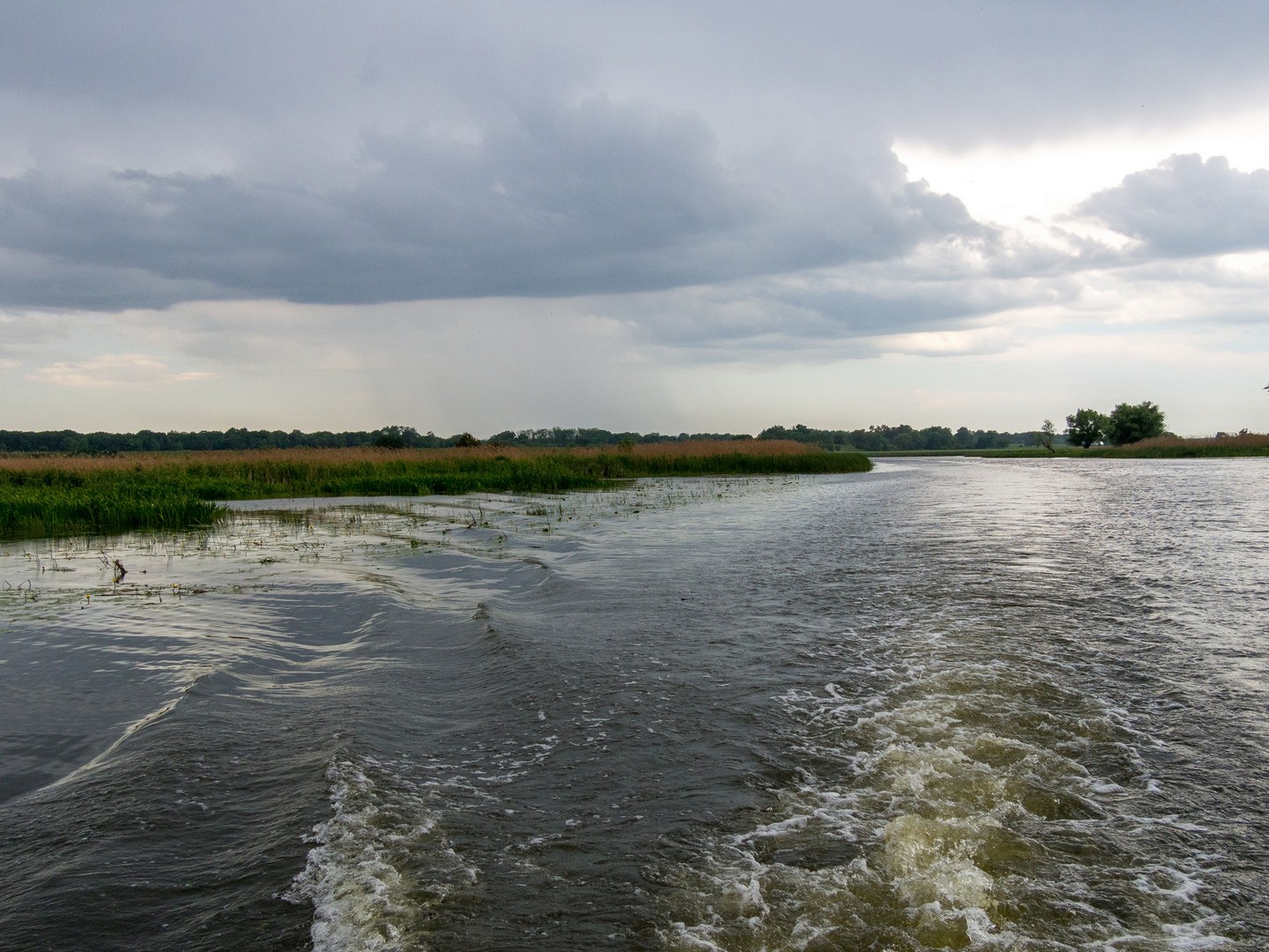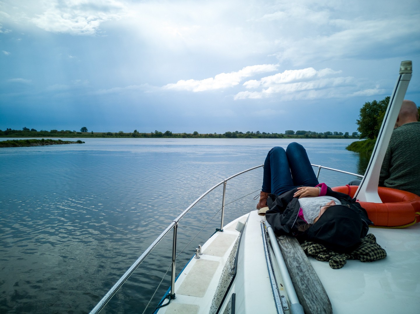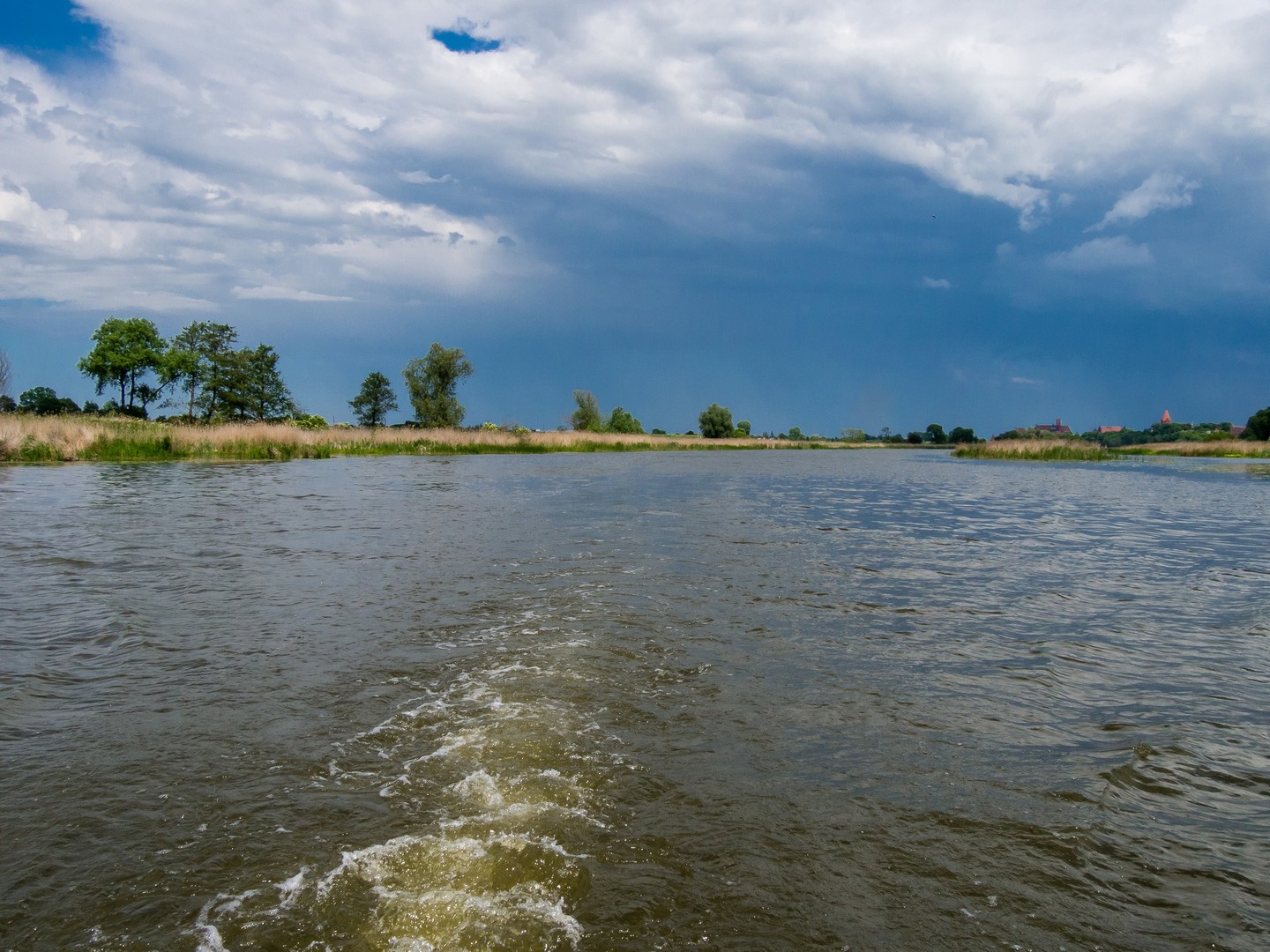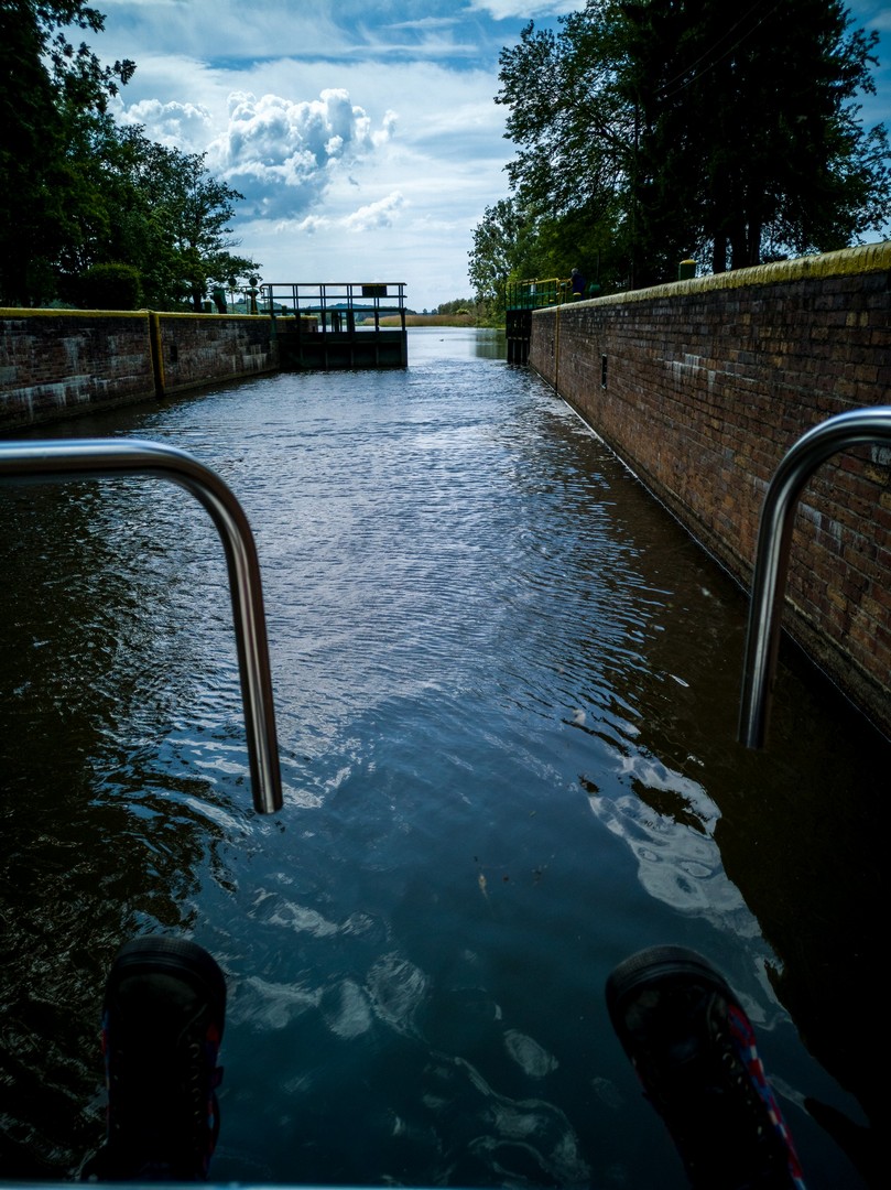 Le grand air, un petit verre, nos lunchs boxes préparées à l’embarcadère. Je ne sais pas ce qu’on peut demander de mieux ? De temps en temps, nous croisons des écluses. L’occasion d’assister aux manoeuvres et de papoter avec les éclusiers. Je vais me placer à l’avant du bateau, à attendre que s’ouvre les portes de la dernière écluse. Au dessus de ma tête, le ciel de Poméranie est tourmenté. Tourmenté, mais beau, plutôt photogénique. Malgré le bruit du moteur, tout est paisible. Je comprend pourquoi Krystof arbore un grand sourire en permanence ! Quelle chance d’avoir un pareil lieu de travail ! Bon, sauf quand il commence à pleuvoir ! On se réfugie à l’intérieur du bateau pendant que tombe une courte averse. Notre capitaine, lui, reste stoïque sous son anorak. Nous, bien au chaud et d’excellente humeur, nous finissons de goûter à la douceur de vivre du Delta… Ca me fait penser, comment dit-on « Dolce vita » en polonais ?
