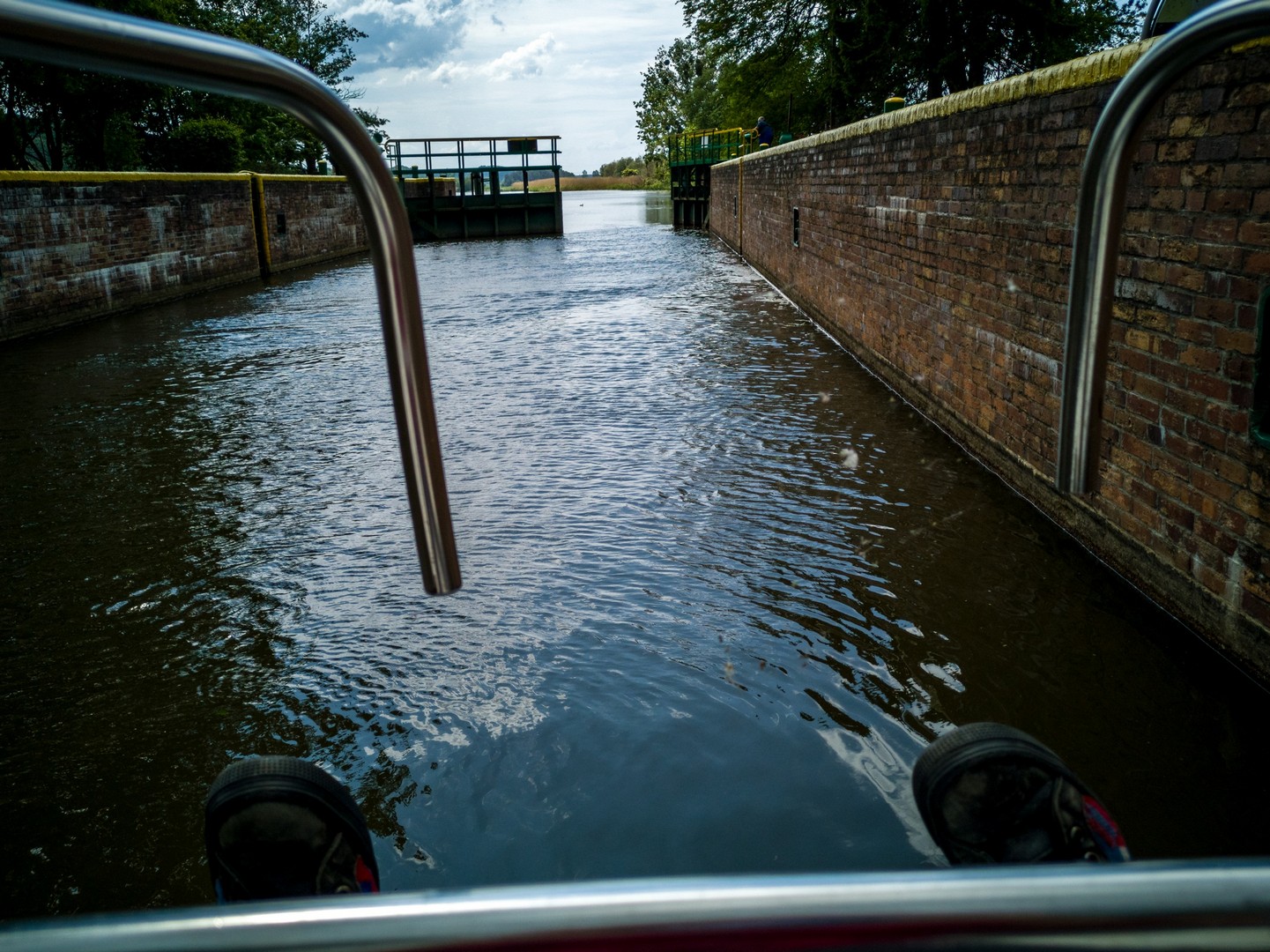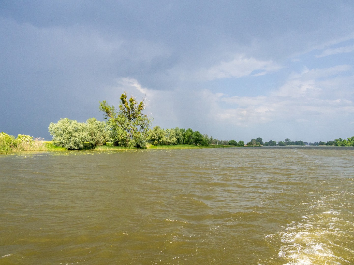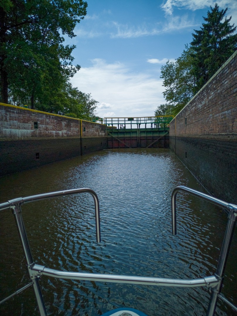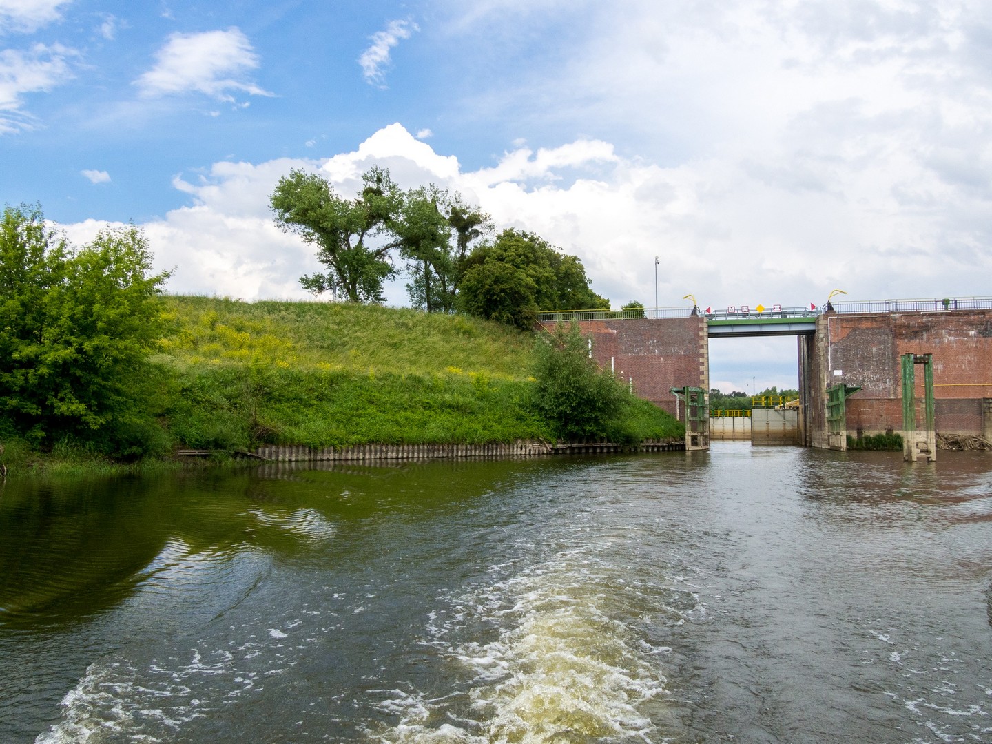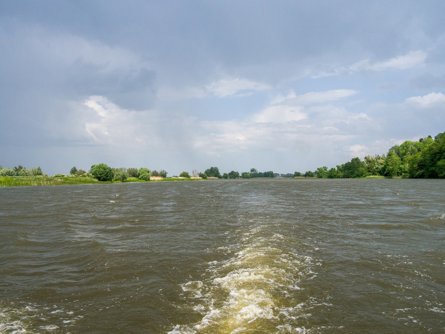 Le grand air, un petit verre, nos lunchs boxes préparées à l’embarcadère. Je ne sais pas ce qu’on peut demander de mieux ? De temps en temps, nous croisons des écluses. L’occasion d’assister aux manoeuvres et de papoter avec les éclusiers. Je vais me placer à l’avant du bateau, à attendre que s’ouvre les portes de la dernière écluse. Au dessus de ma tête, le ciel de Poméranie est tourmenté. Tourmenté, mais beau, plutôt photogénique. Malgré le bruit du moteur, tout est paisible. Je comprend pourquoi Krystof arbore un grand sourire en permanence ! Quelle chance d’avoir un pareil lieu de travail ! Bon, sauf quand il commence à pleuvoir ! On se réfugie à l’intérieur du bateau pendant que tombe une courte averse. Notre capitaine, lui, reste stoïque sous son anorak. Nous, bien au chaud et d’excellente humeur, nous finissons de goûter à la douceur de vivre du Delta… Ca me fait penser, comment dit-on « Dolce vita » en polonais ?