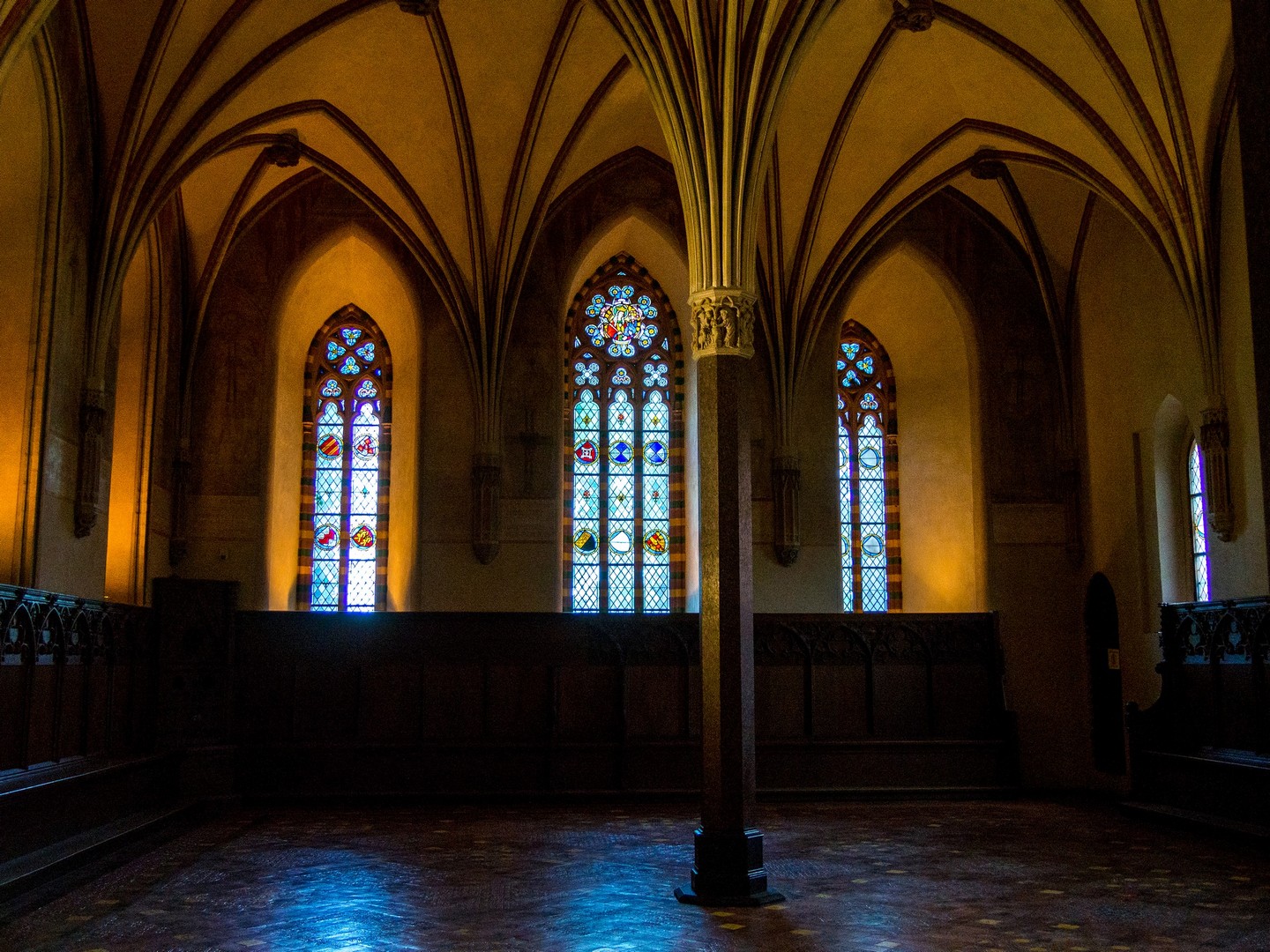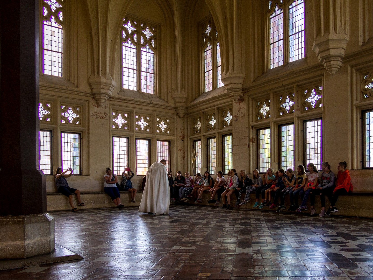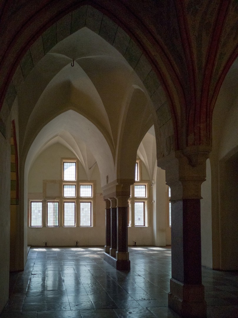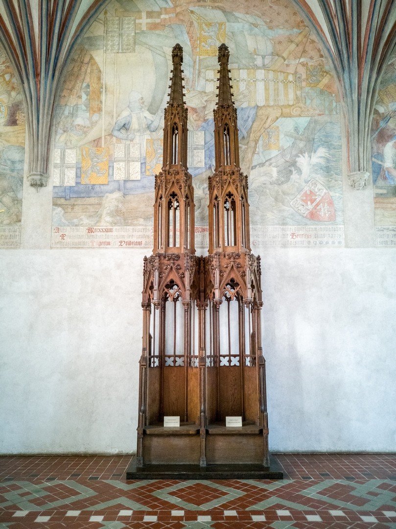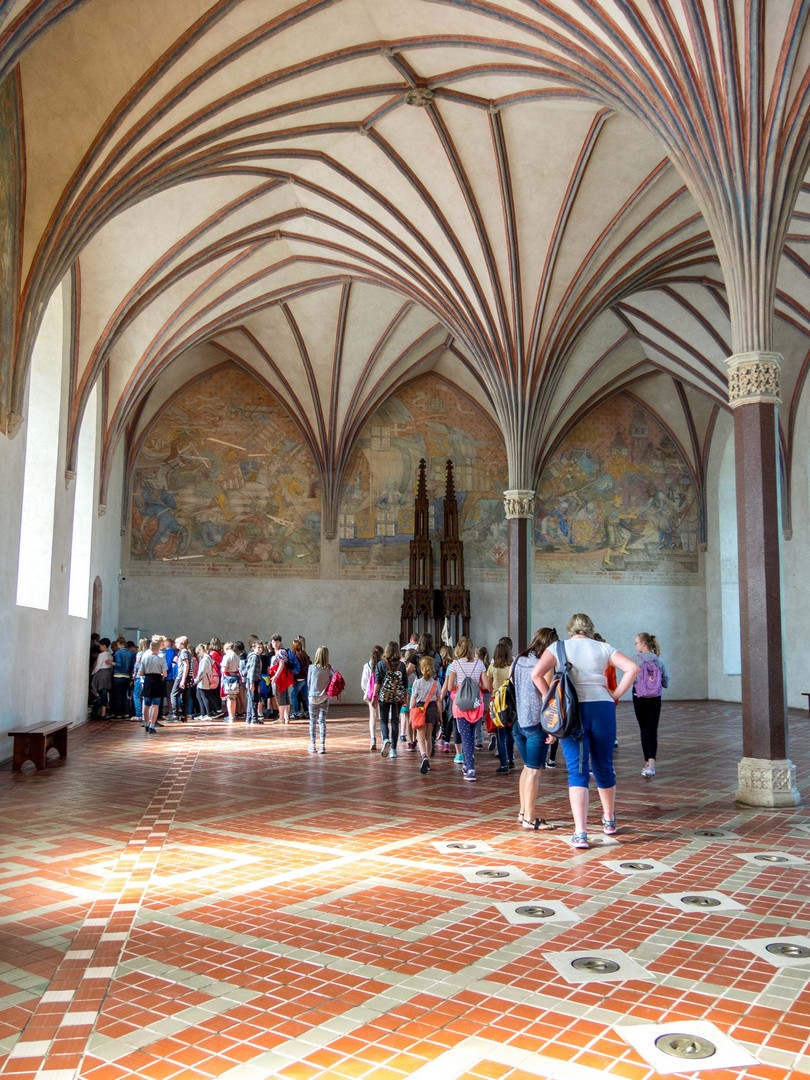 Une des pièces les plus intéressante est le réfectoire. Une immense pièce (la plus grande de la forteresse) qui était chauffée via hypocauste, une bonne vieille technique romaine de chauffage par le sol. Les salles s’enchaînent, au fur et à mesure que l’on entre à travers les différentes sections du château, jusqu’au Palais du Grand Maître. De temps en temps, nous croisons des groupes d’ado en visite guidée, emmené à travers l’histoire par des guides habillés en membres de l’ordre. A voir comme çà, le chevaliers teutoniques n’avaient pas l’air jojo, son emblème est une sévère croix noire (on dit « sable » en héraldique) sur fond blanc. Pas de fioritures, rien ! Les fantaisies, elles sont réservées aux salles… et encore !
