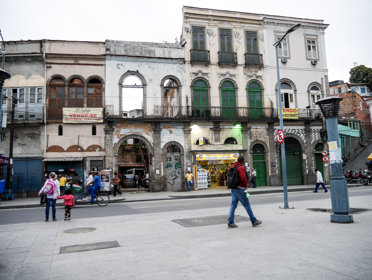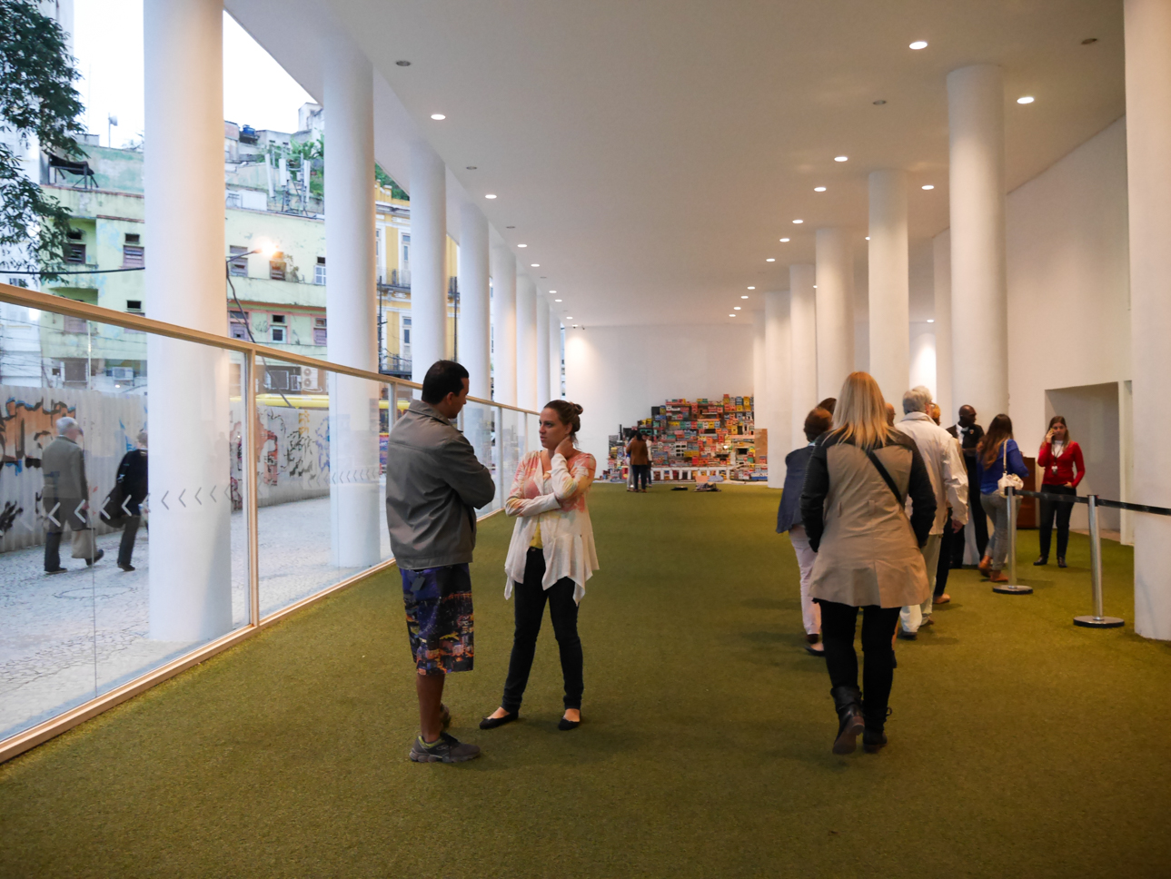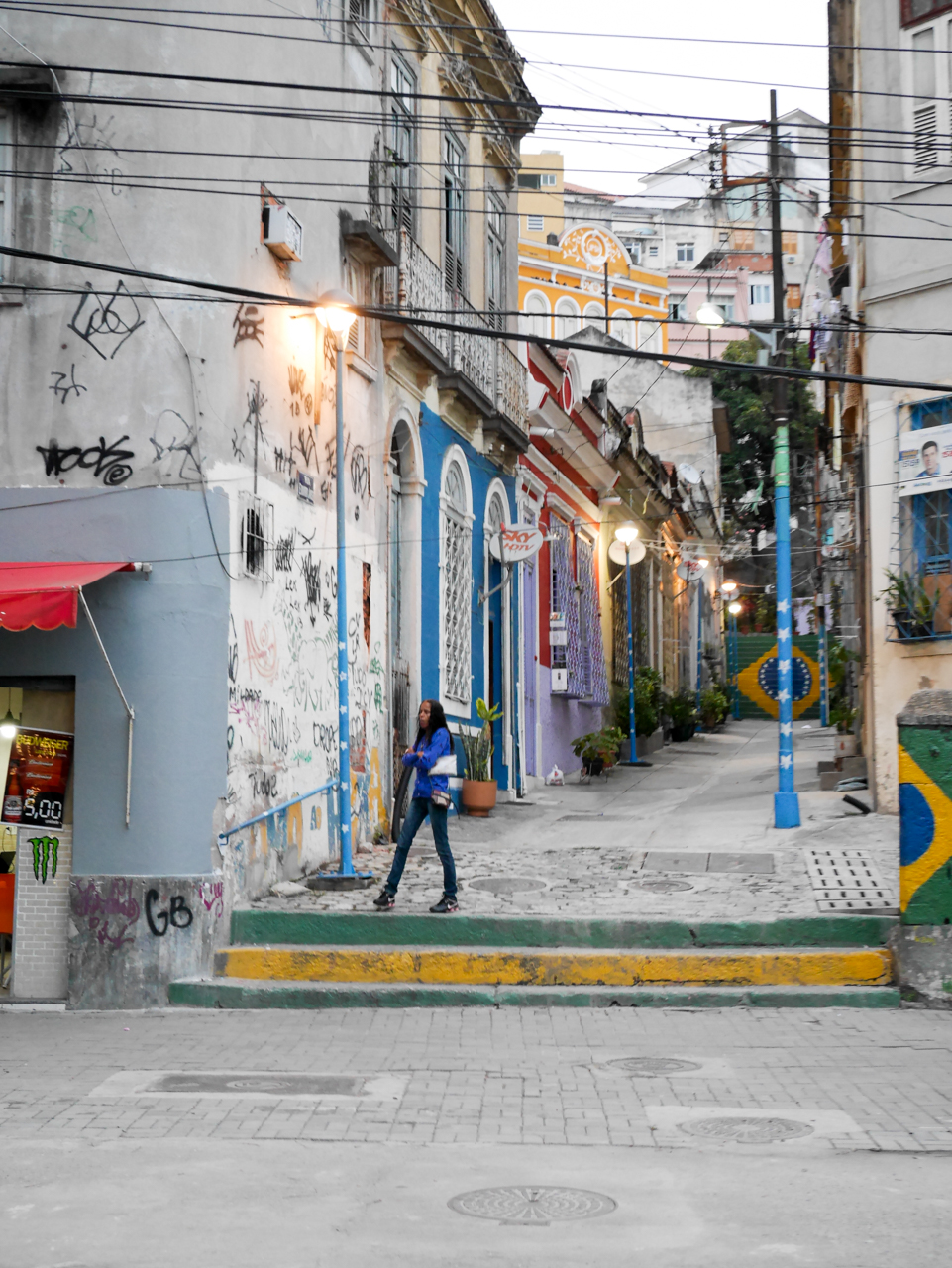 Et on peut dire que Porto Maravilha est plein d’atouts, finalement ! Après tout, Rio est née comme port. Les hommes et les biens y circulaient aux premiers jours de la ville. Certains étant les deux à la fois. Exportation de denrées et de bois, importation d’esclaves, tel était le commerce pratiqué pendant bien longtemps. Et le projet du quartier compte bien mettre en avant l’héritage afro-brésilien. Notre petit groupe passe au début du circuit du patrimoine africain, sur les quais de Valongo et de l’Impératrice, où les négriers accostaient les cales pleines de chairs humaines. Les esclaves étaient alors vendus avant pour la plupart, de prendre la route pour rejoindre le nord-est et les plantations de canne à sucre. Cet immonde commerce ne prendra fin qu’en 1888. La promenade se prolonge sur le Morro do Conceição juste à côté. Un quartier située sur une butte, peuplé d’artiste, où on peut encore gravir des escaliers creusés dans la roche par les esclaves à Pedra do Sal. Le quartier est donc un des plus anciens de Rio et on trouve encore des demeures coloniales… à présent dégagées grâce à la destruction du viaduc. Les maisons y sont un peu étranges… comme s’il s’agissait d’un décor de cinéma… certaines ne sont d’ailleurs que des façades !