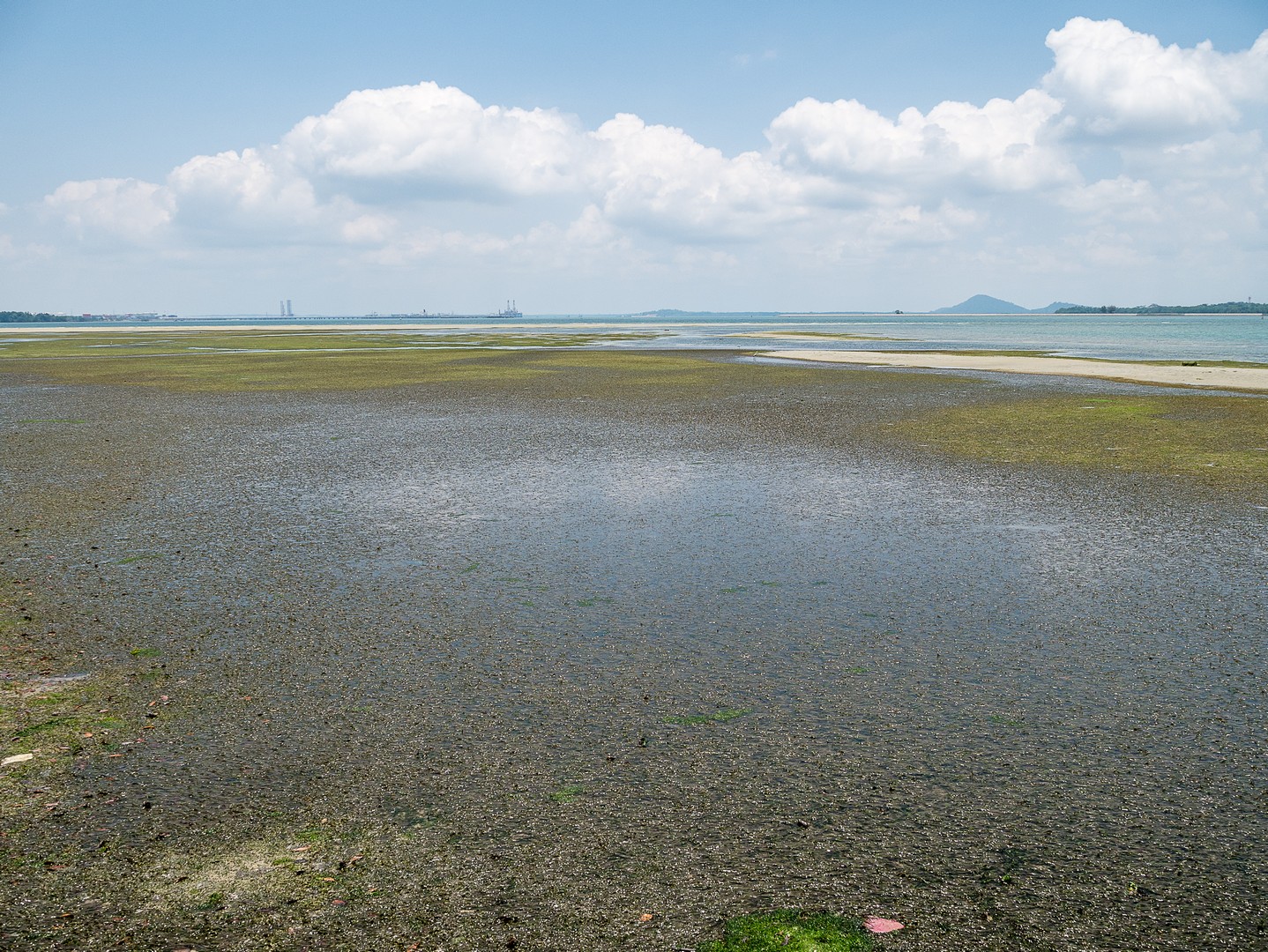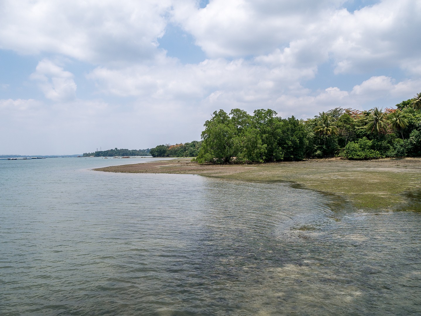 J’ai fait le plein d’explications, me voilà en route pour le parcours d’un bon kilomètre sur caillebotis. C’est marée basse et normalement ce devrait être le meilleur moment pour observer la faune de la zone humide. Etoiles de mer, homards, différentes sortes de martin-pêcheurs, de hérons… Par contre, ce qui n’est pas de bol, c’est qu’il doit être 13-14 heures et que sous un soleil de plomb, la nature se repose ! Je ne verrais pas non plus de singes ni de sangliers qui sont pourtant assez courant… La seule créature que je verrais sera un énorme lézard, immobile au soleil, profitant de la chaleur qui lui réchauffe le sang. Néanmoins, ce parcours de Chek Jawa est vraiment un moment à ne pas louper en visitant l’île. C’est joli et reposant. Coup de coeur pour la jetée qui permet d’avoir un superbe point de vue à la fois sur la mer et la vie marine et la terre.