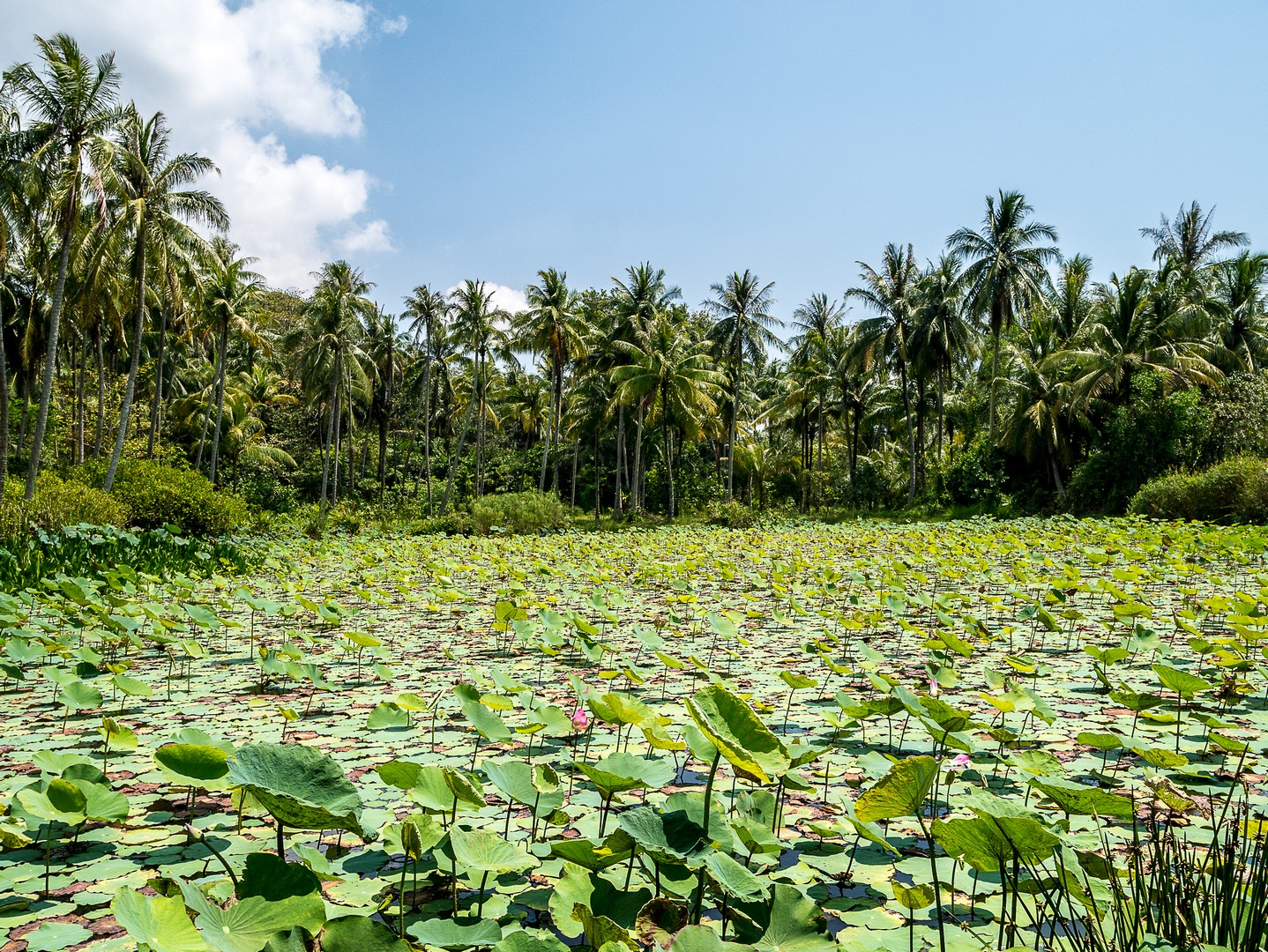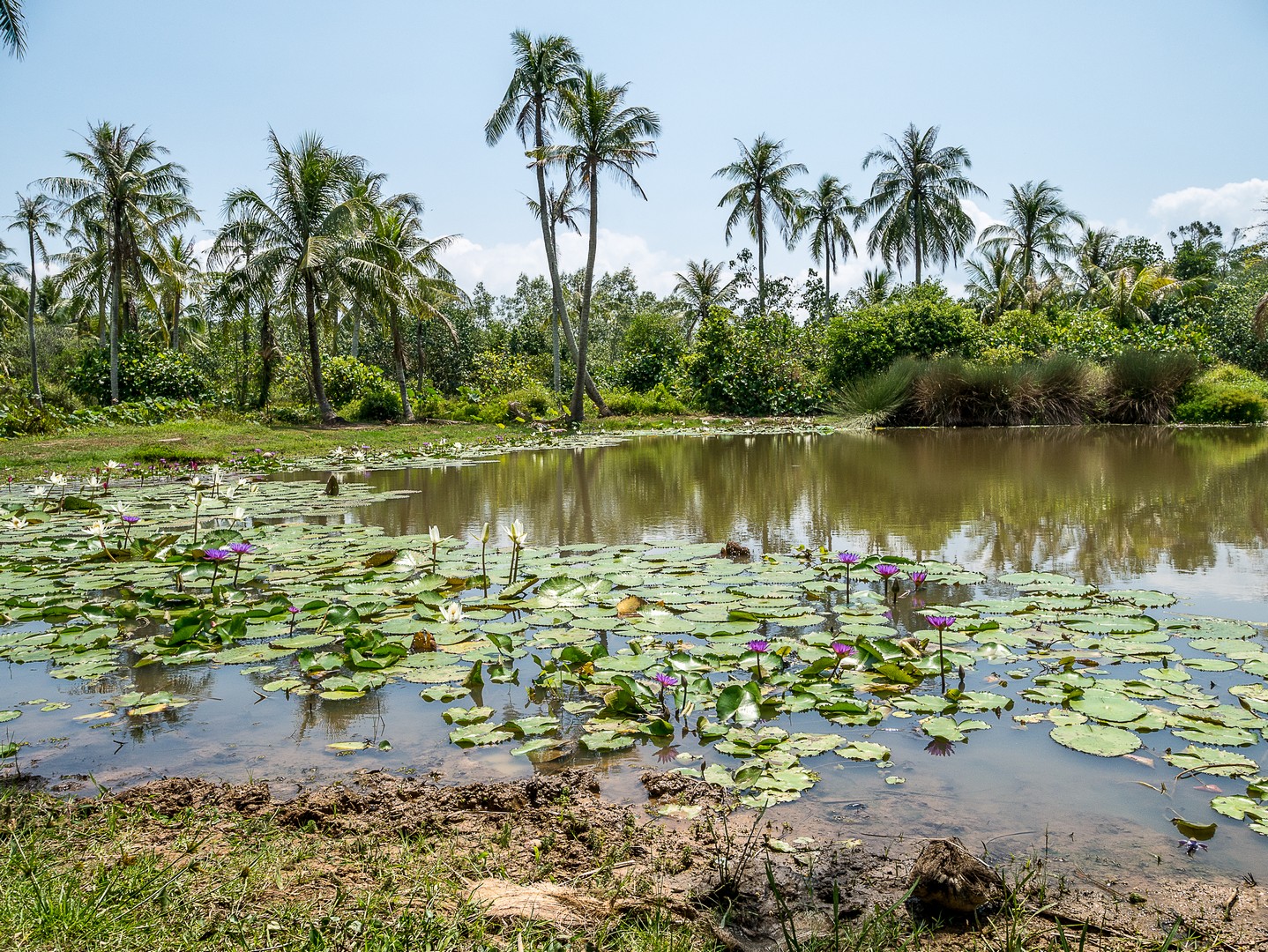 Au bureau de location de vélo, on vous confiera une carte et si ce n’est pas assez, les parcours sont également balisés. C’est parti pour la balade à travers un paysage tout ce qu’il y a de plus tropical, avec plantes et palmiers à profusion. Pulau Ubin est un vrai gruyère : elle est parsemée d’étangs et de plans d’eau dont un très joli en direction de l’est rempli de lotus bleus. Vous le trouverez le long du Sensory Trail, un sentier destiné à stimuler tous les sens. On y passe à travers les cultures de fruits et d’épices du village.