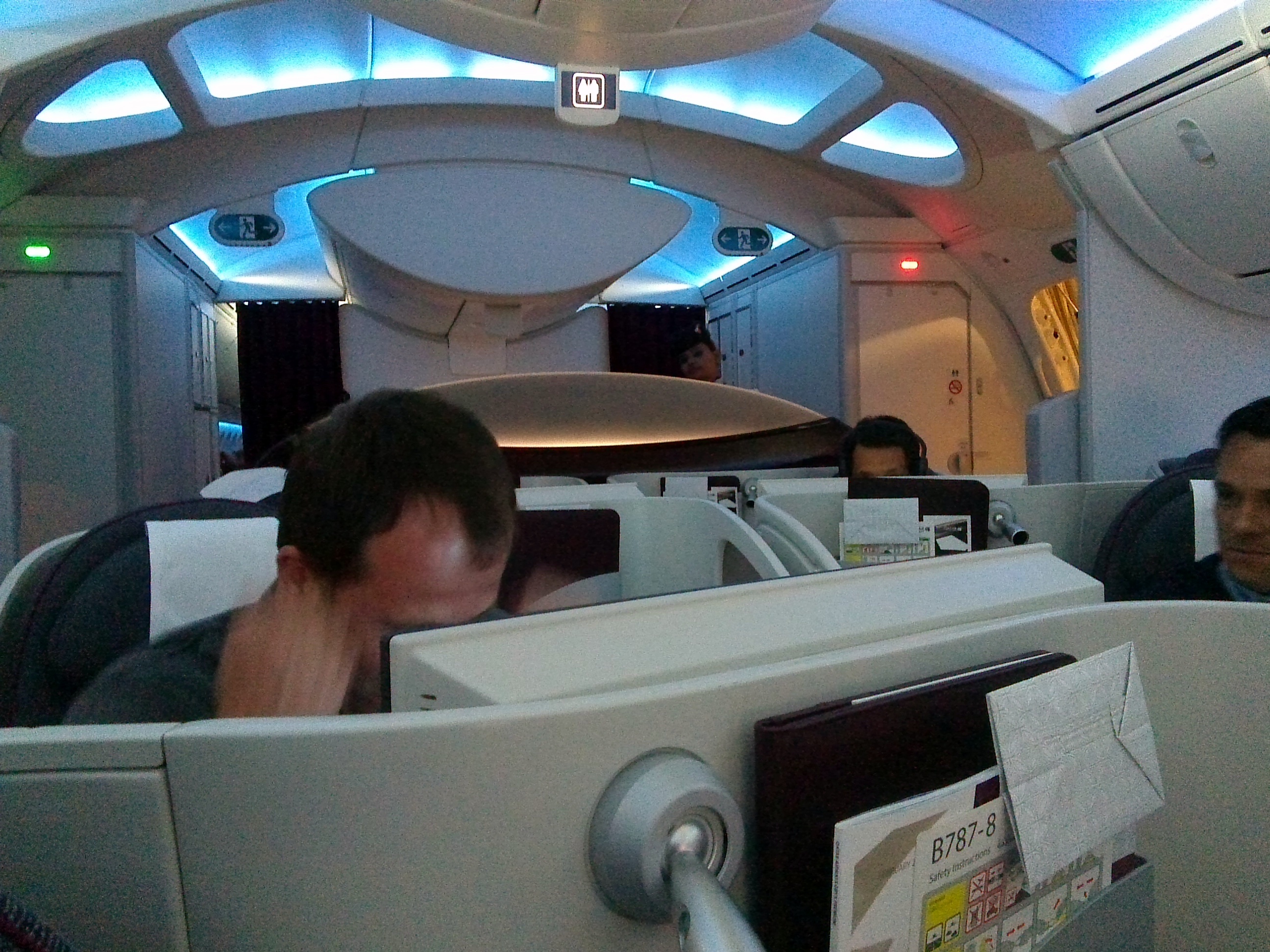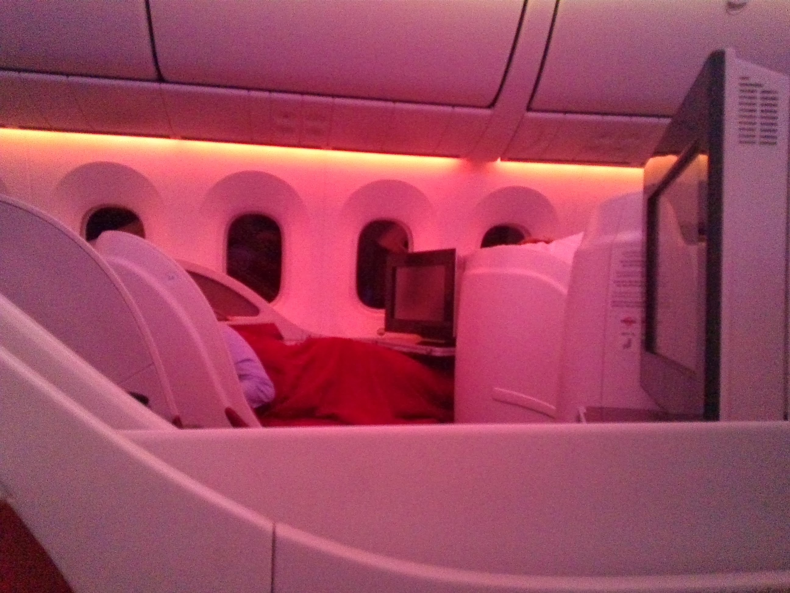 Lorsqu’on arrive dans la cabine, on est tout de suite saisi par l’impression d’espace. Le Dreamliner n’est pas le plus grand des avions (le Boeing 747 et l’A380 le surpasse), mais le layout en donne l’impression. Les lumières sont tamisées (merci, le moodlighting), un petit bouquet de roses rouges trône sur une tablette noire qui ferme l’espace business et je remarque tout de suite les hublots, plus grands que les hublots que l’on peut voir d’habitude. On peut les assombrir avec un bouton mais comme je n’étais pas placée à côté d’une fenêtre, je n’ai pas pu voir comment ça marchait précisément. Chaque passager est salué par son nom par les hôtesses, et on vous propose d’emblée une petite boisson (pour moi, une petite limonade à la menthe, les bulles, ce sera pour plus tard). Ça y est, je me sens déjà comme une VIP !