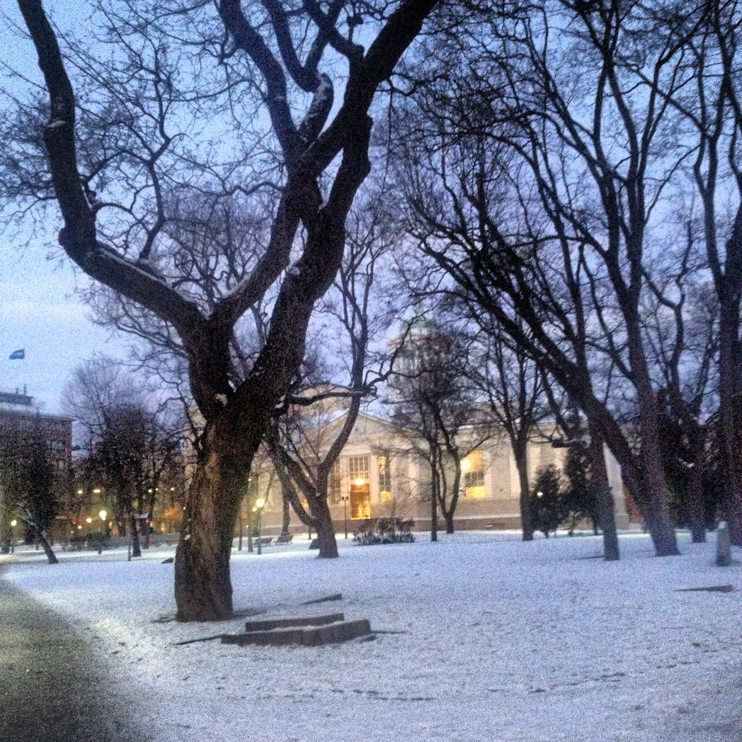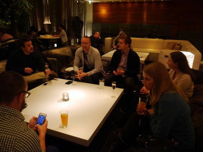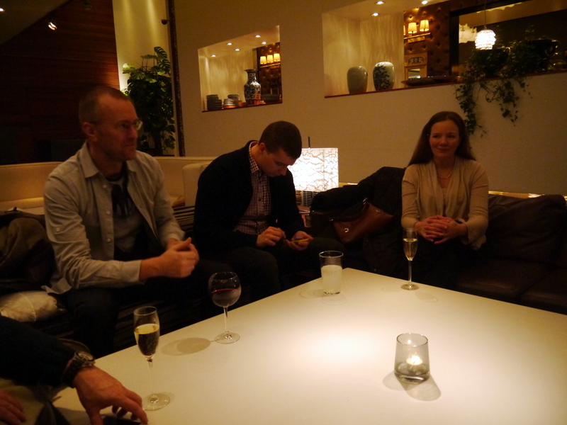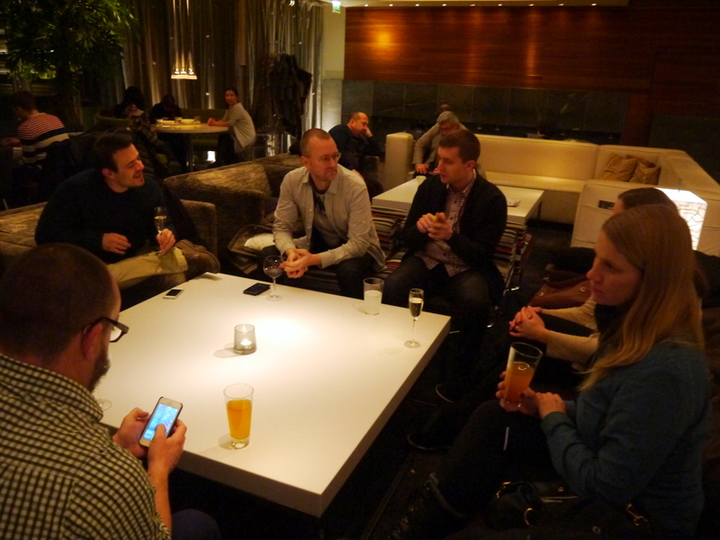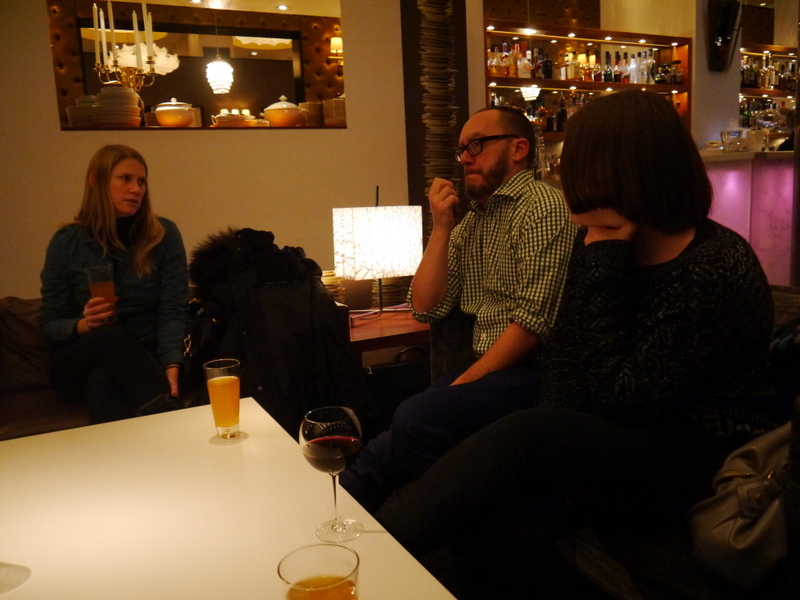 J’en suis là quand j’embarque. Je pensais passer un peu de temps à l’aéroport d’Helsinki pour observer la situation actuelle, ce qui fonctionne ou pas mais voilà: mes co-panélistes m’attendent à l’hôtel Klaus K. Deux options pour rejoindre la ville: le bus régulier où la navette Finnair, plus chère mais plus rapide. Comme je suis pressée et qu’il est tard, je choisis la navette. J’ai juste le temps de me rendre compte qu’il fait un froid de loup! L’hiver fut long à venir, même au nord de l’Europe et c’est la première semaine de vrai froid et de neige pour les Finlandais… Quand je débarque devant la gare, il commence à neiger doucement. Les flocons tombent comme des plumes noires sur fond de lumière de la ville. Je découvre un quartier au bâtiment harmonieux et élégants avec encore pas mal de monde malgré l’heure et la température. Bien réveillée par le froid malgré qu’il soit près de minuit, je n’ai le temps que de déposer mes bagages l’adorable chambre que l’on m’a réservé avant de descendre au bar de l’hôtel retrouver le groupe… Alex, Elyse, Arjan, Rod et Steven. Pawel, le dernier, est déjà parti se coucher. Le temps d’aller me chercher un cocktail de bienvenue, de briser la glace et une magie opère: c’est comme si je connaissais ces personnes depuis des années. Peut-être parce que nous sommes unis par la même passion dévorante, même si chacun la vit d’une façon différente.