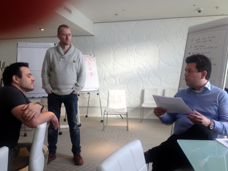 Le lendemain matin, c’est une autre histoire… La fatigue et les excès de la veille m’ont rattrapé. Et je ne suis pas la seule! Il va falloir être opérationnelle pour ce deuxième jour qui doit voir un début de concrétisation de concept. Première étape: mise en situation. Séparés en deux groupes, nous mettons en scène chacun de nos concepts les plus prometteurs… Grosses crises de fous rires devant les talents de comédiens de certains. Cette mise en situation est doit servir à nous donner une idée de ce qui est possible, de nous mettre dans la peau des passagers et du personnel. Enfin, dernière étape: la concrétisation. Nous nous emparons chacun de feuilles en cartons de couleur, de balles de frigolite… à nous de mettre en scène notre terminal d’arrivée idéal, en 20 minutes. Les ciseaux s’affairent, on s’empare de feutres, de papier collant. Il y a un plaisir quasi enfantin à « faire », sans trop se poser de questions.