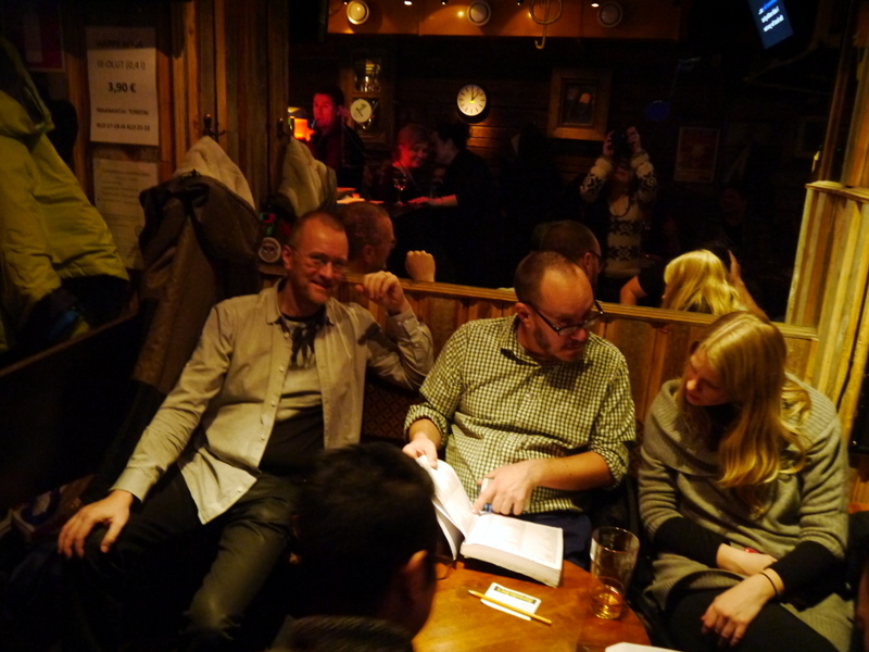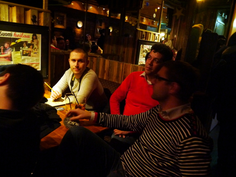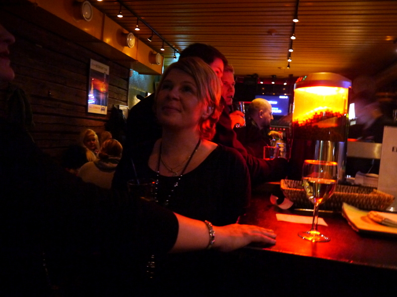 Il n’est que 22 heures quand nous sortons du resto… bien trop tôt pour se quitter comme çà. C’est sans compter sur l’amour des Finlandais pour le karaoké! Nous voilà embarqués dans un petit bar sombre, on nous remet une sélection de la taille de la bible… et les sélections commencent, les bières commencent à défiler (il faut attendre une heure pour avoir son tour de chant, tout le monde veut en être), les shots aussi (grande spécialité nordique, on aura froncé le nez à celui à la vodka et au cognac). On se met même à chanter en finlandais (relativement facile, c’est une langue pleine de voyelles).