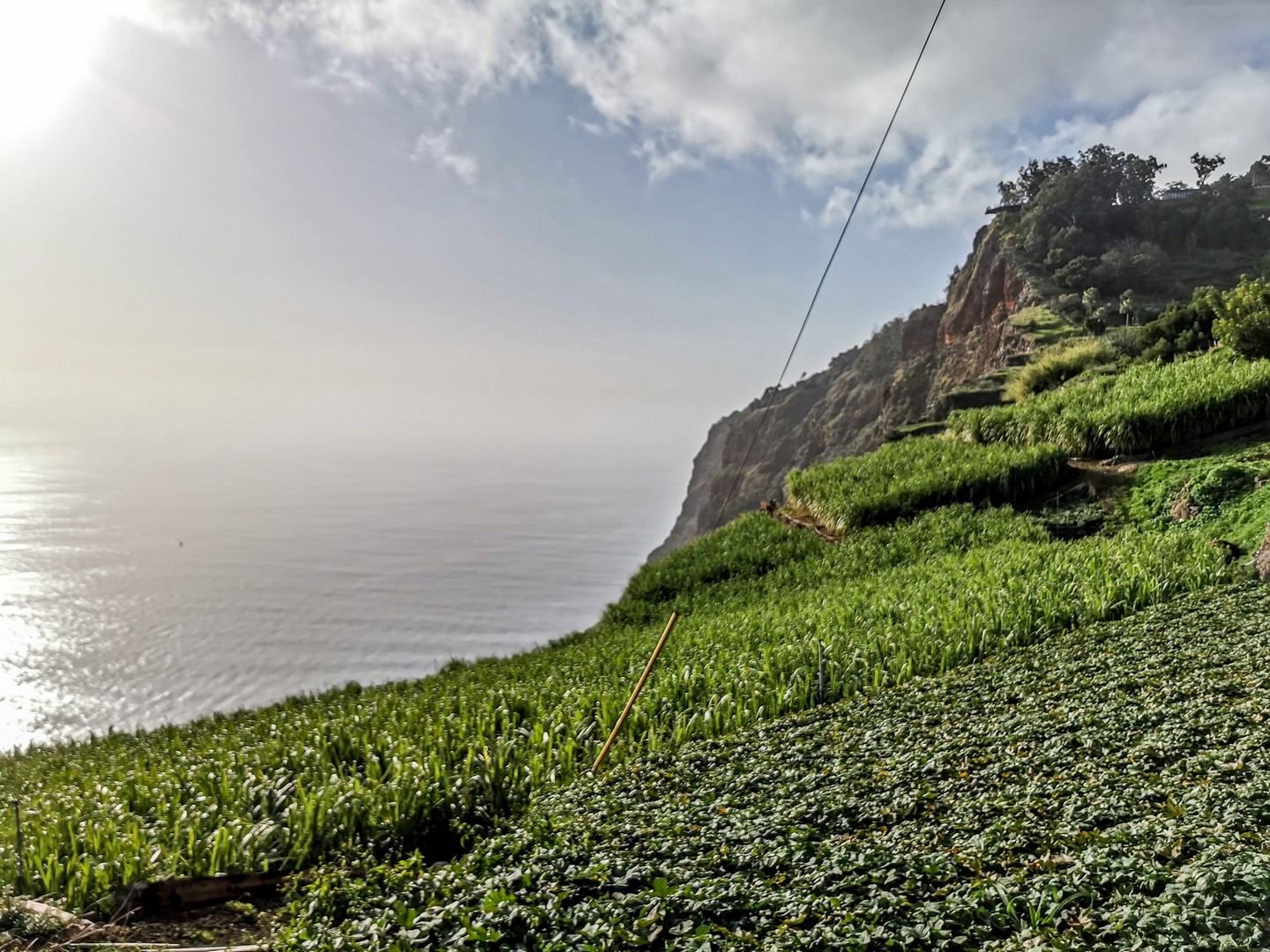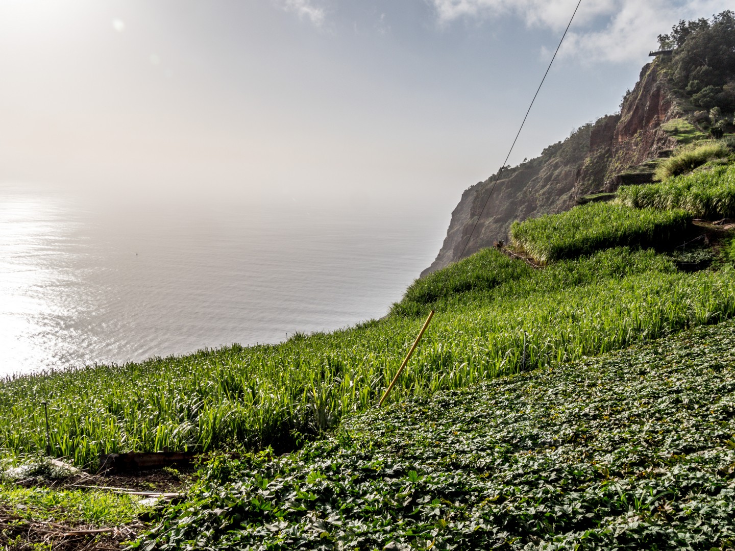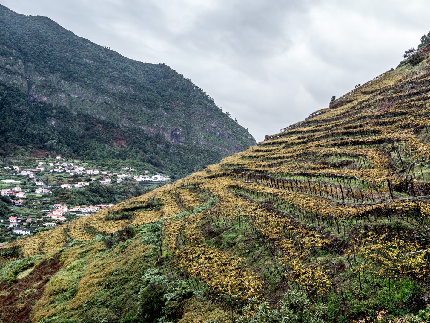 Madère, son climat et son sol volcanique sont propices à toutes sortes de cultures. Le sud, plus chaud, permet faire grandir des bananiers, des fruits de la passion, de la canne à sucre. Le nord, plus frais, est propice à la vigne, aux pommiers, au poiriers… Une véritable bénédiction… sauf que dit « île volcanique » dit « relief tourmenté » et les Madériens ont dû s’adapter en cultivant en terrasse. La campagne de l’île est donc un grand patchwork de lopins de terre de petites tailles et chaque mètre carré, même proche d’une falaise, est exploité au maximum. Cela donne un paysage tout particulier. Pour irriguer tout ça, les Madériens ont créé un système d’acheminement de l’eau : les levadas, dont je parlerai plus tard.