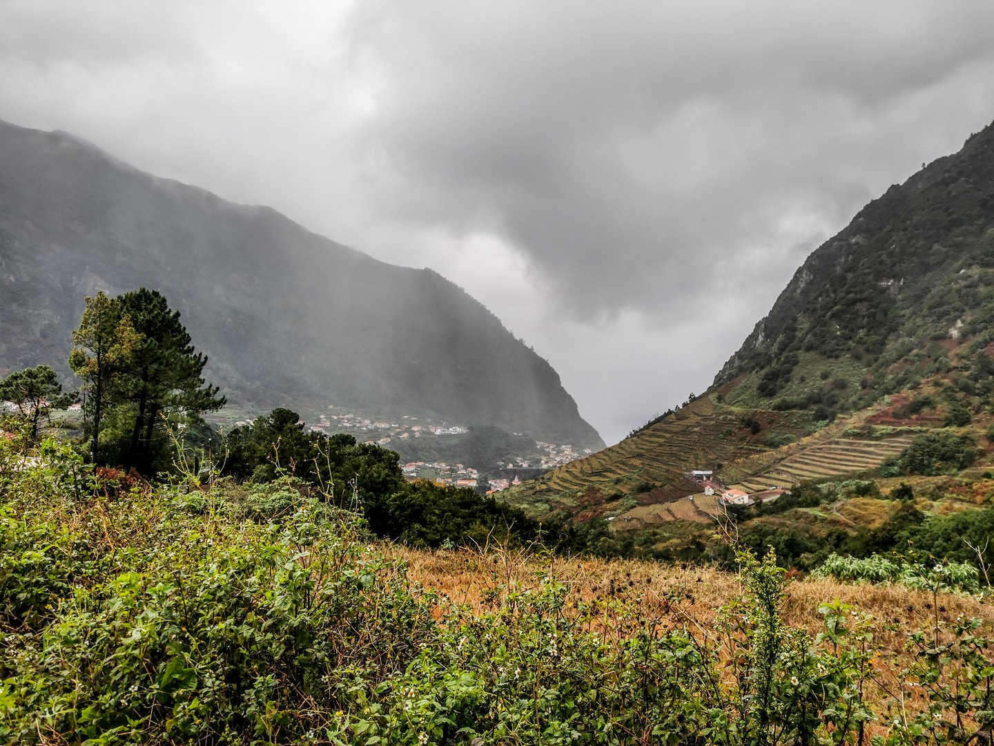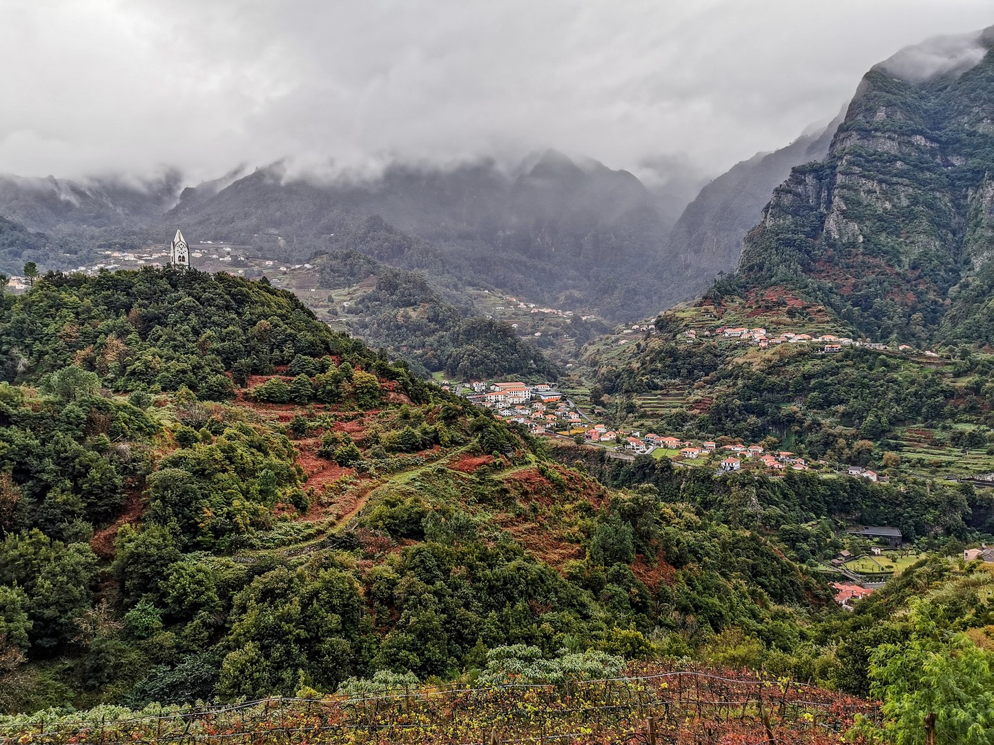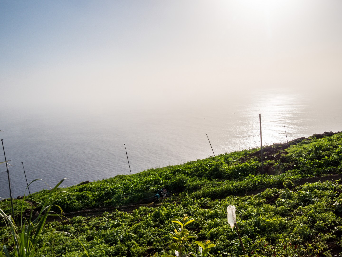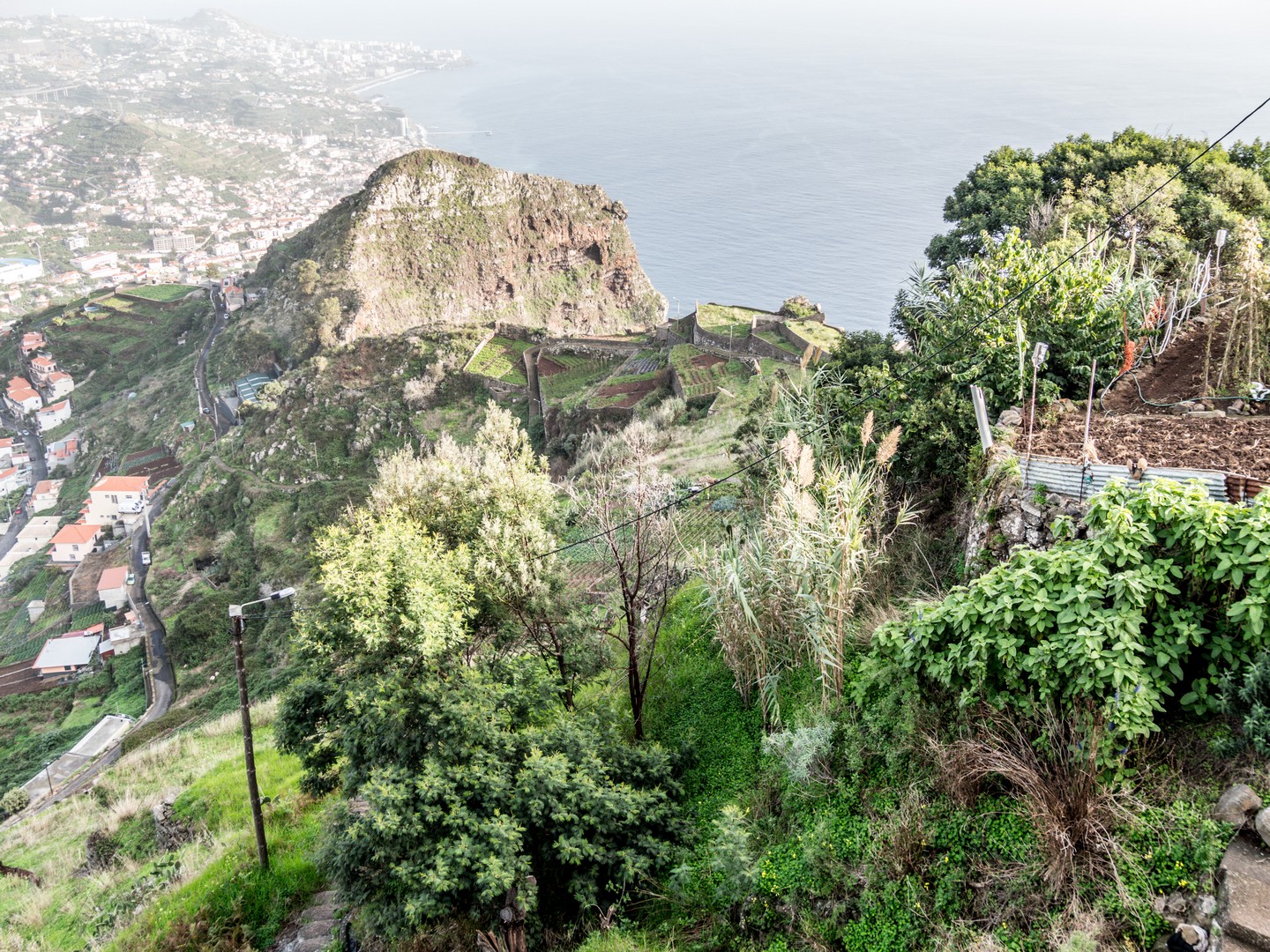 Madère, son climat et son sol volcanique sont propices à toutes sortes de cultures. Le sud, plus chaud, permet faire grandir des bananiers, des fruits de la passion, de la canne à sucre. Le nord, plus frais, est propice à la vigne, aux pommiers, au poiriers… Une véritable bénédiction… sauf que dit « île volcanique » dit « relief tourmenté » et les Madériens ont dû s’adapter en cultivant en terrasse. La campagne de l’île est donc un grand patchwork de lopins de terre de petites tailles et chaque mètre carré, même proche d’une falaise, est exploité au maximum. Cela donne un paysage tout particulier. Pour irriguer tout ça, les Madériens ont créé un système d’acheminement de l’eau : les levadas, dont je parlerai plus tard.