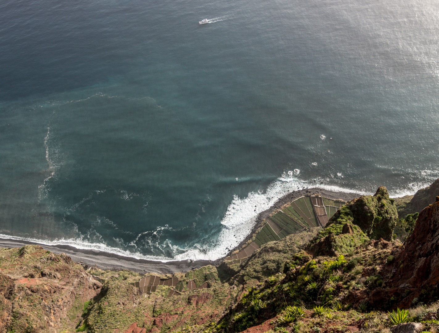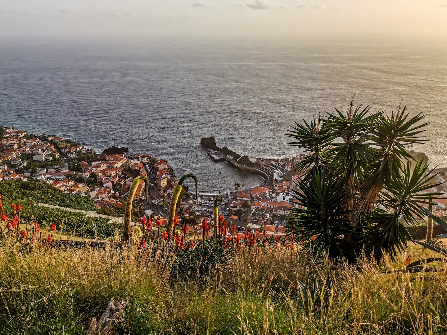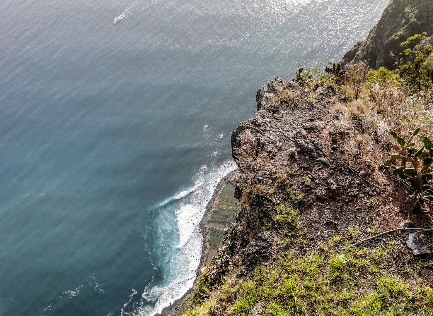 Après quelques arrêts intermédiaires pour prendre le temps d’observer ces cultures en terrasse, nous voilà arrivés à Cabo Girão. Deouis le haut de la falaise, la vue sur l’océan, la petite ville de Câmara de Lobos et Funchal est une belle explosion de rétine. Petite gimmick pour les touristes (mais bien sympathique), un skywalk qui vous permet de marcher au-dessus du vide. C’est évidemment payant pour y accéder mais au prix de 2 €, ce n’est pas exagéré. Sinon, vous pouvez essayer de vous poser sur une table bien placée du petit café qui se trouve à côté. Je bois littéralement le paysage et alors que je suis tout là-haut, je ne peux pas m’empêcher d’envier les gens qui sont eux, tout en bas, à bord des catamarans, là-bas tout en bas, et qui rentre d’une expédition pour observer les cétacés, une chouette activité à réaliser en famille, les eaux de Madère étant fréquentées par plusieurs espèces de dauphins (dont le globicéphale) et baleines (comme le cachalot). Et ce qu’il y a de cool à Madère, c’est que différentes espèces visitent les alentours de l’île à différentes périodes de l’année. Vous aurez donc la chance de voir au moins des dauphins. Ces catamarans peuvent aussi vous emmener faire une sortie pour du snorkeling ou de la plongée. Malheureusement, cette expérience n’était pas à notre programme et après avoir dégusté une petite Coral au café, nous reprenons la route pour Câmara de Lobos.